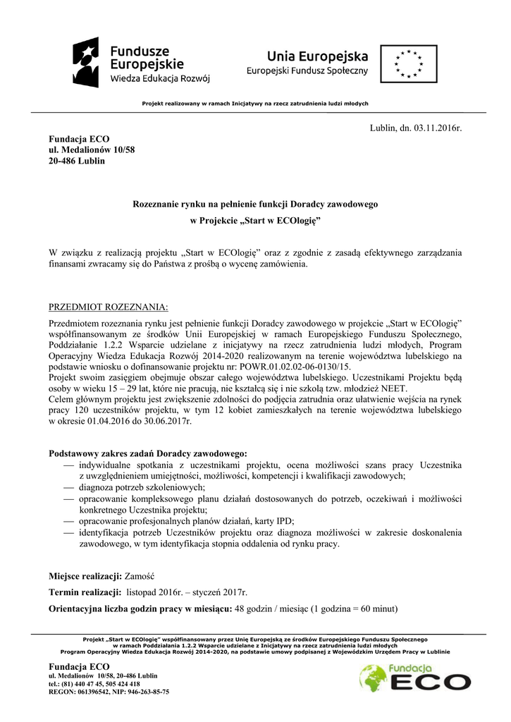 Projekt realizowany w ramach Inicjatywy na rzecz zatrudnienia ludzi młodych Lublin, dn. 03.11.2016r. Fundacja ECO ul. Medalionów 10/58 20-486 Lublin Rozeznanie rynku na pełnienie funkcji Doradcy zawodowego w Projekcie „Start w ECOlogię” W związku z realizacją projektu „Start w ECOlogię” oraz z zgodnie z zasadą efektywnego zarządzania finansami zwracamy się do Państwa z prośbą o wycenę zamówienia. PRZEDMIOT ROZEZNANIA: Przedmiotem rozeznania rynku jest pełnienie funkcji Doradcy zawodowego w projekcie „Start w ECOlogię” współfinansowanym ze środków Unii Europejskiej w ramach Europejskiego Funduszu Społecznego, Poddziałanie 1.2.2 Wsparcie udzielane z inicjatywy na rzecz zatrudnienia ludzi młodych, Program Operacyjny Wiedza Edukacja Rozwój 2014-2020 realizowanym na terenie województwa lubelskiego na podstawie wniosku o dofinansowanie projektu nr: POWR.01.02.02-06-0130/15. Projekt swoim zasięgiem obejmuje obszar całego województwa lubelskiego. Uczestnikami Projektu będą osoby w wieku 15 – 29 lat, które nie pracują, nie kształcą się i nie szkolą tzw. młodzież NEET. Celem głównym projektu jest zwiększenie zdolności do podjęcia zatrudnia oraz ułatwienie wejścia na rynek pracy 120 uczestników projektu, w tym 12 kobiet zamieszkałych na terenie województwa lubelskiego w okresie 01.04.2016 do 30.06.2017r. Podstawowy zakres zadań Doradcy zawodowego: indywidualne spotkania z uczestnikami projektu, ocena możliwości szans pracy Uczestnika z uwzględnieniem umiejętności, możliwości, kompetencji i kwalifikacji zawodowych; diagnoza potrzeb szkoleniowych; opracowanie kompleksowego planu działań dostosowanych do potrzeb, oczekiwań i możliwości konkretnego Uczestnika projektu; opracowanie profesjonalnych planów działań, karty IPD; identyfikacja potrzeb Uczestników projektu oraz diagnoza możliwości w zakresie doskonalenia zawodowego, w tym identyfikacja stopnia oddalenia od rynku pracy. Miejsce realizacji: Zamość Termin realizacji: listopad 2016r. – styczeń 2017r. Orientacyjna liczba godzin pracy w miesiącu: 48 godzin / miesiąc (1 godzina = 60 minut) Projekt „Start w ECOlogię” współfinansowany przez Unię Europejską ze środków Europejskiego Funduszu Społecznego w ramach Poddziałania 1.2.2 Wsparcie udzielane z Inicjatywy na rzecz zatrudnienia ludzi młodych Program Operacyjny Wiedza Edukacja Rozwój 2014-2020, na podstawie umowy podpisanej z Wojewódzkim Urzędem Pracy w Lublinie Fundacja ECO ul. Medalionów 10/58, 20-486 Lublin tel.: (81) 440 47 45, 505 424 418 REGON: 061396542, NIP: 946-263-85-75 Projekt realizowany w ramach Inicjatywy na rzecz zatrudnienia ludzi młodych Wszystkie kwestie szczegółowe, warunki pracy i zasady współpracy pomiędzy Zamawiającym i Wykonawcą precyzować będzie umowa cywilno-prawna. WARUNKI UDZIAŁU W ROZEZNANIU RYNKU: Wykonawca ubiegający się o zamówienie musi posiadać niezbędną wiedzę i doświadczenie do wykonania zamówienia, a w szczególności: a) wykształcenie wyższe, b) minimum 2 lata udokumentowanego doświadczenia w prowadzeniu doradztwa zawodowego, c) doświadczenie w realizacji projektów współfinansowanych z Unii Europejskiej w ramach Europejskiego Funduszu Społecznego, Informujemy, że powyższa informacja nie stanowi oferty w myśl art. 66 Kodeksu Cywilnego, jak również nie jest ogłoszeniem w rozumieniu ustawy Prawo zamówień publicznych. Informacja ma na celu wyłącznie rozeznanie rynku w zakresie pełnienia funkcji Doradcy zawodowego i uzyskanie wiedzy na temat kosztów usługi. OPIS SPOSOBU PRZEDSTAWIENIA OFERTY: Wykonawca powinien przedstawić ofertę na formularzu załączonym do niniejszego rozeznania rynku. Podpisaną ofertę należy do dnia 10.11.2016r. do godz. 23.59 dostarczyć osobiście, scan na adres mailowy lub przesłać pocztą na adres: Fundacja ECO Medalionów 10/58 20-486 Lublin Dodatkowych informacji udziela: Sylwia Czarnecka e-mail: [email protected] Załączniki: 1. Formularz Projekt „Start w ECOlogię” współfinansowany przez Unię Europejską ze środków Europejskiego Funduszu Społecznego w ramach Poddziałania 1.2.2 Wsparcie udzielane z Inicjatywy na rzecz zatrudnienia ludzi młodych Program Operacyjny Wiedza Edukacja Rozwój 2014-2020, na podstawie umowy podpisanej z Wojewódzkim Urzędem Pracy w Lublinie Fundacja ECO ul. Medalionów 10/58, 20-486 Lublin tel.: (81) 440 47 45, 505 424 418 REGON: 061396542, NIP: 946-263-85-75 Projekt realizowany w ramach Inicjatywy na rzecz zatrudnienia ludzi młodych Załącznik 1 FORMULARZ Imię i Nazwisko Wykonawcy ................................................................................ Numer telefonu ................................................................................ Adres e-mail …………………………………………………… Fundacja ECO Medalionów 10/58 20-486 Lublin W odpowiedzi na rozeznanie rynku na pełnienie funkcji Doradcy zawodowego w projekcie „Start w ECOlogię” współfinansowanym ze środków Unii Europejskiej w ramach Europejskiego Funduszu Społecznego, Poddziałanie 1.2.2 Wsparcie udzielane z inicjatywy na rzecz zatrudnienia ludzi młodych, Program Operacyjny Wiedza Edukacja Rozwój 2014-2020 realizowanym na terenie województwa lubelskiego na podstawie wniosku o dofinansowanie projektu nr: POWR.01.02.02-06-0130/15. oświadczam, że: 1. Zapoznałam/em się z treścią rozeznania rynku na pełnienie funkcji Doradcy zawodowego „Start w ECOlogię”, 2. Posiadam wykształcenie wyższe, 3. Posiadam minimum 2 lata udokumentowanego doświadczenia w prowadzeniu doradztwa zawodowego. 4. Posiadam doświadczenie w realizacji projektów współfinansowanych z Unii Europejskiej w ramach Europejskiego Funduszu Społecznego. 5. Za pełnienie funkcji Doradcy zawodowego składam ofertę w wysokości ………………. zł/ godzinę, słownie: …………………………………………………………. (cena całkowita i ostatecz