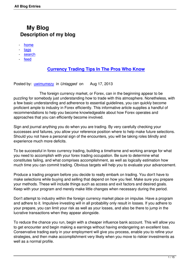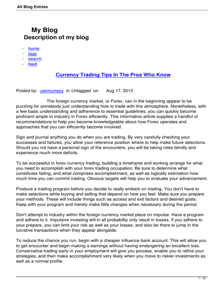 All Blog Entries My Blog Description of my blog - home tags search feed Currency Trading Tips In The Pros Who Know Posted by: uwimumezy in Untagged on Aug 17, 2013 The foreign currency market, or Forex, can in the beginning appear to be puzzling for somebody just understanding how to trade with this atmosphere. Nonetheless, with a few basic understanding and adherence to essential guidelines, you can quickly become proficient ample to industry in Forex efficiently. This informative article supplies a handful of recommendations to help you become knowledgeable about how Forex operates and approaches that you can efficiently become involved. Sign and journal anything you do when you are trading. By very carefully checking your successes and failures, you allow your reference position where to help make future selections. Should you not have a personal sign of the encounters, you will be taking roles blindly and experience much more deficits. To be successful in forex currency trading, building a timeframe and working arrange for what you need to accomplish with your forex trading occupation. Be sure to determine what constitutes failing, and what comprises accomplishment, as well as logically estimation how much time you can commit trading. Obvious targets will help you to evaluate your advancement. Produce a trading program before you decide to really embark on trading. You don't have to make selections while buying and selling that depend on how you feel. Make sure you prepare your methods. These will include things such as access and exit factors and desired goals. Keep with your program and merely make little changes when necessary during the period. Don't attempt to industry within the foreign currency market place on impulse. Have a program and adhere to it. Impulsive investing will in all probability only result in losses. If you adhere to your prepare, you can limit your risk as well as your losses, and also be there to jump in the lucrative transactions when they appear alongside. To reduce the chance you run, begin with a cheaper influence bank account. This will allow you to get encounter and begin making a earnings without having endangering an excellent loss. Conservative trading early in your employment will give you process, enable you to refine your strategies, and then make accomplishment very likely when you move to riskier investments as well as a normal profile. 1 / 15 All Blog Entries Using lots of signs on your industry windows will certainly bring about frustration. As opposed to introducing 3 various pivot level indicators, oscillators, stochastic divergence, and many others. you need to rather center on one particular certain signal and the way that it will increase your present forex trading method. After you have determined your strategy in this fashion, you may then think about including a brand new indication(s) in your tool establish. When trading, ensure you are following a tendency. Using this method, you are nearly certain to be successful. It really takes far more try to go against a buy and sell than it does to go with a single. The reason being that sort of industry requires more interest, abilities, and many others., since it is not really a "provided" scenario that way of your trend. If you intend on taking part in fx trading, you need to know what is going on with the industry. Therefore, you ought to have a good comprehension of increasing product rates and dropping product prices. Increasing investment prices usually transmission a powerful overall economy and soaring the cost of living. Slipping asset prices normally indicate a poor economic climate and sliding inflation. It is crucial for the astute Currency trader not to deceive their selves. Placements needs to be opened up based upon clear, established trends, not on half-viewed guesses and optimistic anticipations. Excellent forex traders business for the realities of the marketplace, not to best circumstances they are trying to see create down the road. Despite the fact that working day-investing is a straightforward program to learn with forex trading, it is also just about the most dangerous. Since deals come about at a faster tempo with time-investing, there is a specific chance that you might drop your entire accounts during the period of a day. So constantly get into every single new forex trading day time warily and ready to take out if you must. Do not let other dealers make choices for yourself. Talking with other traders relating to your practical experience are often very helpful: you can learn using their errors and reveal successful strategies. But irrespective of how profitable these investors are, do not stick to their suggestions blindly. Keep in mind that you will be committing your cash so you need to create the decisions yourself. It is necessary for every fx trader to come up with a unique trading strategy, stick to it diligently, and withstand generating decisions according to emotional aspects. By adhering to a proper method, it really is easy to steer clear of losses caused by the types of irrational hunches or bouts of wishful believing that can occasionally grip foreign exchange amateurs. Each and every Currency trader is going to have some form of trading breakdown at one point or some other, however it is the way you gain knowledge from your problems that will make you a far better forex trader. Constantly assess your failures and initiate some type of log to help you eventually notice a repeating pattern within your awful transactions. If you feel the Forex market will be your profitable lotto ticket and this you will get rich rapidly, you might want to rethink receiving included in it by any means. In the event you come into 2 / 15 All Blog Entries forex trading with that mindset, you are likely to get bad quickly rather than rich. Because Currency trading can be done with places all over the world, take into account that it can be probable that you should buy and 