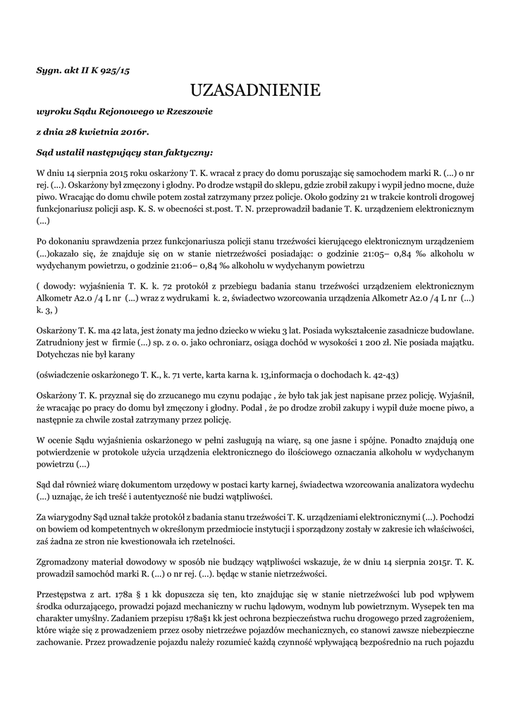 Sygn. akt II K 925/15 UZASADNIENIE wyroku Sądu Rejonowego w Rzeszowie z dnia 28 kwietnia 2016r. Sąd ustalił następujący stan faktyczny: W dniu 14 sierpnia 2015 roku oskarżony T. K. wracał z pracy do domu poruszając się samochodem marki R. (...) o nr rej. (...). Oskarżony był zmęczony i głodny. Po drodze wstąpił do sklepu, gdzie zrobił zakupy i wypił jedno mocne, duże piwo. Wracając do domu chwile potem został zatrzymany przez policje. Około godziny 21 w trakcie kontroli drogowej funkcjonariusz policji asp. K. S. w obecności st.post. T. N. przeprowadził badanie T. K. urządzeniem elektronicznym (...) Po dokonaniu sprawdzenia przez funkcjonariusza policji stanu trzeźwości kierującego elektronicznym urządzeniem (...)okazało się, że znajduje się on w stanie nietrzeźwości posiadając: o godzinie 21:05– 0,84 ‰ alkoholu w wydychanym powietrzu, o godzinie 21:06– 0,84 ‰ alkoholu w wydychanym powietrzu ( dowody: wyjaśnienia T. K. k. 72 protokół z przebiegu badania stanu trzeźwości urządzeniem elektronicznym Alkometr A2.0 /4 L nr (...) wraz z wydrukami k. 2, świadectwo wzorcowania urządzenia Alkometr A2.0 /4 L nr (...) k. 3, ) Oskarżony T. K. ma 42 lata, jest żonaty ma jedno dziecko w wieku 3 lat. Posiada wykształcenie zasadnicze budowlane. Zatrudniony jest w firmie (...) sp. z o. o. jako ochroniarz, osiąga dochód w wysokości 1 200 zł. Nie posiada majątku. Dotychczas nie był karany (oświadczenie oskarżonego T. K., k. 71 verte, karta karna k. 13,informacja o dochodach k. 42-43) Oskarżony T. K. przyznał się do zrzucanego mu czynu podając , że było tak jak jest napisane przez policję. Wyjaśnił, że wracając po pracy do domu był zmęczony i głodny. Podał , że po drodze zrobił zakupy i wypił duże mocne piwo, a następnie za chwile został zatrzymany przez policję. W ocenie Sądu wyjaśnienia oskarżonego w pełni zasługują na wiarę, są one jasne i spójne. Ponadto znajdują one potwierdzenie w protokole użycia urządzenia elektronicznego do ilościowego oznaczania alkoholu w wydychanym powietrzu (...) Sąd dał również wiarę dokumentom urzędowy w postaci karty karnej, świadectwa wzorcowania analizatora wydechu (...) uznając, że ich treść i autentyczność nie budzi wątpliwości. Za wiarygodny Sąd uznał także protokół z badania stanu trzeźwości T. K. urządzeniami elektronicznymi (...). Pochodzi on bowiem od kompetentnych w określonym przedmiocie instytucji i sporządzony zostały w zakresie ich właściwości, zaś żadna ze stron nie kwestionowała ich rzetelności. Zgromadzony materiał dowodowy w sposób nie budzący wątpliwości wskazuje, że w dniu 14 sierpnia 2015r. T. K. prowadził samochód marki R. (...) o nr rej. (...). będąc w stanie nietrzeźwości. Przestępstwa z art. 178a § 1 kk dopuszcza się ten, kto znajdując się w stanie nietrzeźwości lub pod wpływem środka odurzającego, prowadzi pojazd mechaniczny w ruchu lądowym, wodnym lub powietrznym. Wysepek ten ma charakter umyślny. Zadaniem przepisu 178a§1 kk jest ochrona bezpieczeństwa ruchu drogowego przed zagrożeniem, które wiąże się z prowadzeniem przez osoby nietrzeźwe pojazdów mechanicznych, co stanowi zawsze niebezpieczne zachowanie. Przez prowadzenie pojazdu należy rozumieć każdą czynność wpływającą bezpośrednio na ruch pojazdu w szczególności rozstrzygający o kierunku i prędkości jazdy. Pojazdem mechanicznym jest każdy pojazd wprawiany w ruch za pomocą własnego silnika. Stan nietrzeźwości zachodzi, gdy zawartość alkoholu w organizmie wynosi lub prowadzi do stężenia we krwi powyżej 0,5 ‰ alkoholu lub obecności w wydychanym powietrzu powyżej 0,25 mg w 1 dm3. Przenosząc powyższe rozważania na grunt niniejszej sprawy stwierdzić należy, iż T. K. swym zachowaniem wyczerpał wszystkie znamiona przestępstwa z art. 178a § 1 kk. W dniu 14 sierpnia 2015r., kierował będącym pojazdem mechanicznym samochodem marki R. (...) o nr rej. (...). na ulicy (...) w R.. Przeprowadzone badania oskarżonego o godzinie 21:05 wykazało zawartość 0,84 ‰ alkoholu w wydychanym powietrzu. Zatem znajdował się w tym czasie w stanie nietrzeźwości, co potwierdziło dwukrotne badanie na zawartość alkoholu w wydychanym powietrzu. Przy ocenie stopnia społecznej szkodliwości czynu oskarżonego Sąd wziął pod uwagę rodzaj i charakter naruszonego dobra, sposób i okoliczności popełnienia czynu, jak też postać zamiaru oraz rodzaj naruszonych reguł ostrożności i stopień ich naruszenia. T. K. będąc na zakupach w trakcie drogi powrotnej z pracy do domu wypił jedno mocne duże piwo wiedząc, że przyjechał samochodem i tym samym samochodem będzie wracał do domu. Wina oskarżonego nie budzi wątpliwości. Oskarżony bowiem w czasie popełnienia czynu miał w pełni zachowaną poczytalność, a biorąc pod uwagę doświadczenie życiowe należne każdemu dorosłemu człowiekowi , stwierdzić należy, iż miał on możliwość rozpoznania swojego zachowania. Poza tym nie zachodzą żadne okoliczności wyłączające bezprawność czynu lub winę sprawcy oraz żadna szczególna sytuacja motywacyjna. Oskarżony wyjaśnił, że był zmęczony i głodny w ocenie Sądu nie jest to żadna okoliczność wpływająca na umniejszenie winy oskarżonego. Wręcz przeciwnie oskarżony będąc zmęczony sięgnął po alkohol będąc w trakcie drogi z pracy do domu, gdzie jako osoba dorosła posiadająca już pewien zakres doświadczenia życiowego wiedział, że właśnie zmęczenie i głód przyśpieszy wywołanie negatywnej reakcji organizmu na spożyty alkohol. W przedmiotowej sprawie nie ulega wątpliwości, że oskarżony nie dał posłuchu normie prawnej zakazującej prowadzenia pojazdów mechanicznych w stanie nietrzeźwości w ruchu lądowym. Mając powyższe okoliczności na uwadze Sąd wymierzył oskarżonemu karę grzywny w wymiarze 200 stawek dziennych określając wysokość jednej stawki dziennej