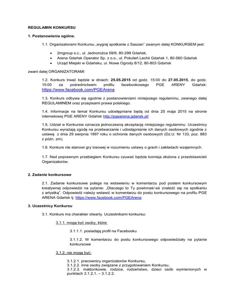 REGULAMIN KONKURSU 1. Postanowienia ogólne. 1.1. Organizatorami Konkursu „wygraj spotkanie z Saszan” zwanym dalej KONKURSEM jest: 2mgroup s.c., ul. Jednorożca 59/9, 80-299 Gdańsk, Arena Gdańsk Operator Sp. z o.o., ul. Pokoleń Lechii Gdańsk 1, 80-560 Gdańsk Urząd Miejski w Gdańsku, ul. Nowe Ogrody 8/12, 80-803 Gdańsk zwani dalej ORGANIZATORAMI 1.2. Konkurs trwać będzie w dniach: 25.05.2015 od godz. 15:00 do 27.05.2015, do godz. 15:00 za pośrednictwem profilu facebookowego PGE ARENY Gdańsk: https://www.facebook.com/PGEArena 1.3. Konkurs odbywa się zgodnie z postanowieniami niniejszego regulaminu, zwanego dalej REGULAMINEM oraz przepisami prawa polskiego. 1.4. Informacje na temat Konkursu udostępniane będą od dnia 25 maja 2015 na stronie internetowej PGE ARENY Gdańsk http://pgearena.gdansk.pl/ 1.5. Udział w Konkursie oznacza jednoczesną akceptację niniejszego regulaminu. Uczestnicy Konkursu wyrażają zgodę na przetwarzanie i udostępnianie ich danych osobowych zgodnie z ustawą z dnia 29 sierpnia 1997 roku o ochronie danych osobowych (Dz.U. Nr 133, poz. 883 z późn. zm). 1.6. Konkurs nie stanowi gry losowej w rozumieniu ustawy o grach i zakładach wzajemnych. 1.7. Nad poprawnym przebiegiem Konkursu czuwać będzie komisja złożona z przedstawicieli Organizatorów. 2. Zadanie konkursowe 2.1. Zadanie konkursowe polega na wstawieniu w komentarzu pod postem konkursowym kreatywnej odpowiedzi na pytanie: „Dlaczego to Ty powinnaś/-eś znaleźć się na spotkaniu z artystką”. Odpowiedź należy wstawić w komentarzu do postu konkursowego na profilu PGE ARENA Gdańsk tj. https://www.facebook.com/PGEArena 3. Uczestnicy Konkursu 3.1. Konkurs ma charakter otwarty. Uczestnikami konkursu: 3.1.1. mogą być osoby, które: 3.1.1.1. posiadają profil na Facebooku 3.1.1.2. W komentarzu do postu konkursowego odpowiedziały na pytanie konkursowe 3.1.2. nie mogą być: 3.1.2.1. pracownicy organizatorów Konkursu, 3.1.2.2. inne osoby związane z przygotowaniem Konkursu, 3.1.2.3. małżonkowie, rodzice, rodzeństwo, dzieci osób wymienionych w punktach 3.1.2.1. – 3.1.2.2. 4. Wyłonienie zwycięzcy 4.1. Informacja o zakończonym konkursie pojawi się na portalu społecznościowym Facebook 27 maja 2015 roku o godzinie 15:00 4.2. Wyłonienie zwycięzcy będzie się odbywać przez 3-osobowe jury, składające się z przedstawicieli 2mgroup, ZKM Gdańsk i Urzędu Miejskiego w Gdańsku. 4.3. Jury konkursowe dokona wyboru 13 najciekawszych odpowiedzi na pytania konkursowe biorąc pod uwagę kryterium oryginalności, kreatywności i zabawności oraz liczby like’ów do danej odpowiedzi. 4.4. Decyzja jury w sprawie wyłonienia zwycięzcy jest ostateczna. 4.5. Ogłoszenie wyników Konkursu i podanie listy zwycięzców odbędzie się w dniu 28 maja 2015 do godz.18.00. na portalu społecznościowym Facebook, na którym znajdować się będzie post konkursowy, a także na stronie www.pgearena.gdansk.com 4.6. Zwycięzcy zostaną poproszeni o podanie adresu e-mail w wiadomości do administratora profilu Facebookowego PGE ARENY Gdańsk 4.7. Na podane adresy e-mail zostanie wysłana informacja o sposobie realizacji nagrody 5. Nagrody 5.1. Nagrodą w konkursie jest udział w spotkaniu z artystką Saszan, dnia 31.05. 2015 na stadionie PGE ARENA przed koncertem, w trakcie Festynu Rodzinnego Gdańsk Dzieciom. 5.2. Zwycięzcy nie mogą zamienić nagród na gotówkę 5.3. Realizacja nagród 5.3.1. Termin i miejsce odbioru nagrody zostanie przedstawiony zwycięzcom w prywatnych wiadomościach mailowych. 5.3.2. Laureaci mogą odmówić prawa przyjęcia nagrody. 5.3.3. Zwycięzcy muszą wylegitymować się dokumentem potwierdzającym tożsamość przed odbiorem nagród. 6. Prawa autorskie 6.1 Uczestnik Konkursu przenosi na organizatorów nieodpłatnie autorskie prawa majątkowe do komentarza konkursowego, jednocześnie upoważniając Organizatorów do ich prezentacji na profilu PGE ARENA Gdańsk na facebooku (https://www.facebook.com/PGEArena) oraz na stronie www.pgearena.gdansk.pl Przeniesienie ww. praw nie jest ograniczone w czasie. 6.2. W przypadku, gdy uczestnik konkursu nie będzie autorem lub będzie współautorem komentarza konkursowego, zobowiązuje się on, iż będzie dysponował wszelkimi prawami oraz wymaganymi zgodami, w tym od autorów, współautorów lub właściwych organizacji zbiorowego zarządzania prawami autorskimi, niezbędnymi do opublikowania komentarza konkursowego w sieci Internet, łącznie z umożliwieniem takowej publikacji osobie trzeciej. 6.3. Uczestnicy, którzy nie będą autorami lub będą współautorami komentarza konkursowego i nie wypełnią obowiązku uzyskania praw i zgód w trybie ust. 7, są zobowiązani do pokrycia wszelkich kosztów poniesionych przez organizatorów w związku z naruszeniem praw autorskich w wyniku opublikowania materiału konkursowego w Sieci Internet bez zgody autorów, współautorów i/lub organizacji zbiorowego zarządzania prawami autorskimi. 6.4. Zwycięzcy konkursu wyrażają zgodę na wykorzystanie ich wizerunku, fotografowania podczas spotkania oraz opublikowania zdjęć w mediach. 7. Postanowienia końcowe 7.1 Organizatorzy mają prawo wykluczyć uczestnika z udziału w konkursie, jeśli komentarz konkursowy będzie zawierać treści sprzeczne z obowiązującym prawem, zasadami współżycia społecznego, dobrymi obyczajami, będzie naruszać postanowienia niniejszego Regulaminu, prawa organizatorów i prawa osób trzecich, dobra osobiste, będzie obraźliwy, wulgarny lub zawierający groźby skierowane pod adresem osób trzecich, zawierać będzie treści dyskryminujące płeć, rasę, narodowość, język, religię, nawołujące do przemocy lub posiadać będzie charakter pornograficzny.