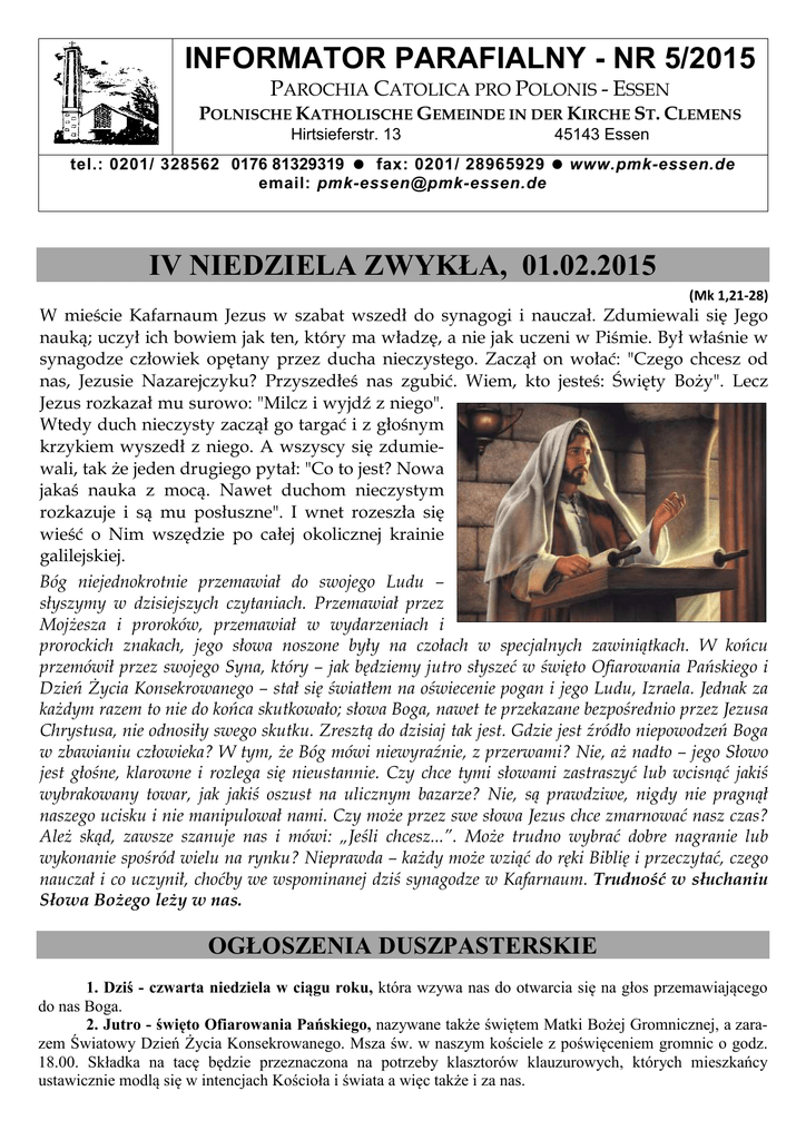 INFORMATOR PARAFIALNY - NR 5/2015 PAROCHIA CATOLICA PRO POLONIS - ESSEN POLNISCHE KATHOLISCHE GEMEINDE IN DER KIRCHE ST. CLEMENS Hirtsieferstr. 13 tel.: 0201/ 328562 0176 81329319 fax: 0201/ 28965929 email: [email protected] 45143 Essen www.pmk-essen.de IV NIEDZIELA ZWYKŁA, 01.02.2015 (Mk 1,21-28) W mieście Kafarnaum Jezus w szabat wszedł do synagogi i nauczał. Zdumiewali się Jego nauką; uczył ich bowiem jak ten, który ma władzę, a nie jak uczeni w Piśmie. Był właśnie w synagodze człowiek opętany przez ducha nieczystego. Zaczął on wołać: "Czego chcesz od nas, Jezusie Nazarejczyku? Przyszedłeś nas zgubić. Wiem, kto jesteś: Święty Boży". Lecz Jezus rozkazał mu surowo: "Milcz i wyjdź z niego". Wtedy duch nieczysty zaczął go targać i z głośnym krzykiem wyszedł z niego. A wszyscy się zdumiewali, tak że jeden drugiego pytał: "Co to jest? Nowa jakaś nauka z mocą. Nawet duchom nieczystym rozkazuje i są mu posłuszne". I wnet rozeszła się wieść o Nim wszędzie po całej okolicznej krainie galilejskiej. Bóg niejednokrotnie przemawiał do swojego Ludu – słyszymy w dzisiejszych czytaniach. Przemawiał przez Mojżesza i proroków, przemawiał w wydarzeniach i prorockich znakach, jego słowa noszone były na czołach w specjalnych zawiniątkach. W końcu przemówił przez swojego Syna, który – jak będziemy jutro słyszeć w święto Ofiarowania Pańskiego i Dzień Życia Konsekrowanego – stał się światłem na oświecenie pogan i jego Ludu, Izraela. Jednak za każdym razem to nie do końca skutkowało; słowa Boga, nawet te przekazane bezpośrednio przez Jezusa Chrystusa, nie odnosiły swego skutku. Zresztą do dzisiaj tak jest. Gdzie jest źródło niepowodzeń Boga w zbawianiu człowieka? W tym, że Bóg mówi niewyraźnie, z przerwami? Nie, aż nadto – jego Słowo jest głośne, klarowne i rozlega się nieustannie. Czy chce tymi słowami zastraszyć lub wcisnąć jakiś wybrakowany towar, jak jakiś oszust na ulicznym bazarze? Nie, są prawdziwe, nigdy nie pragnął naszego ucisku i nie manipulował nami. Czy może przez swe słowa Jezus chce zmarnować nasz czas? Ależ skąd, zawsze szanuje nas i mówi: „Jeśli chcesz...”. Może trudno wybrać dobre nagranie lub wykonanie spośród wielu na rynku? Nieprawda – każdy może wziąć do ręki Biblię i przeczytać, czego nauczał i co uczynił, choćby we wspominanej dziś synagodze w Kafarnaum. Trudność w słuchaniu Słowa Bożego leży w nas. OGŁOSZENIA DUSZPASTERSKIE 1. Dziś - czwarta niedziela w ciągu roku, która wzywa nas do otwarcia się na głos przemawiającego do nas Boga. 2. Jutro - święto Ofiarowania Pańskiego, nazywane także świętem Matki Bożej Gromnicznej, a zarazem Światowy Dzień Życia Konsekrowanego. Msza św. w naszym kościele z poświęceniem gromnic o godz. 18.00. Składka na tacę będzie przeznaczona na potrzeby klasztorów klauzurowych, których mieszkańcy ustawicznie modlą się w intencjach Kościoła i świata a więc także i za nas. 3. We wtorek, we wspomnienie św. Błażeja, biskupa i męczennika, Msza św. o godz. 12.00 z błogosławieństwem św. Błażeja, który jest patronem od chorób gardła. Błogosławieństwo także będzie udzielane w poniedziałek po Mszy św. Przed Mszą św. Koronka do Miłosierdzia Bożego. Po Mszy św. spotkanie Seniorów w sali parafialnej. Już dziś informujemy, że od 24-tego lutego Msze św. we wtorki sprawowane będą o godz. 15.00. 4. W środę, Msza św. o godz. 18.00. Po Mszy św. Nowenna do MBNP. Prośby i podziękowania Matce Bożej można składać wypisane na kartkach do koszyka przy obrazie Matki Bożej Częstochowskiej. 5. W pierwszy czwartek miesiąca zapraszamy do wspólnej modlitwy o nowe powołania kapłańskie i zakonne. Od godz. 17.00 wystawienie Najśw. Sakramentu, adoracja i o godz. 18.00 Msza św. Po Mszy Świętej – błogosławieństwo chleba (soli) i wody ku czci św. Agaty. 6. W pierwszy piątek miesiąca Msza św. o Najświętszym Sercu Pana Jezusa o godz. 18.00, od godz. 17.00 adoracja Najśw. Sakramentu i możliwość skorzystania z Sakramentu Pokuty. Odwiedziny chorych w piątek od godz. 9.00. 7. W pierwszą sobotę miesiąca, Msza św. wotywna ku czci Niepokalanego Serca NMP o godz. 9.00. Czciciele Matki Bożej 20 minut przed Mszą św. śpiewają „Godzinki” ku czci Niepokalanego Poczęcia NMP oraz po Mszy św. modlą się modlitwą różańcową. Serdecznie zapraszamy do praktykowania Nabożeństwa Pierwszych Sobót Miesiąca, o które prosiła Matka Boża s. Łucję. Bliższe informacje w wiadomościach parafialnych, cały tekst w wiadomościach elektronicznych. Zapraszamy na Kurs Przedmałżeński w sobotę 07.lutego do salki parafialnej. Początek o godz. 17.00. 8. Za tydzień, w niedzielę po Mszy św. o godz. 12.00, zapraszamy dzieci na zabawę karnawałową. Rodziców prosimy o kontakt z s. Anną. Ulotki wyłożone są w kościele. 9. Dziś bezpośrednio po Mszy św. o godz. 12.00 zapraszamy do pozostania w świątyni, i we wspólnocie pokolędować Jezusowi wśród nas obecnemu. 10. Biuro parafialne w tym tygodniu czynne we wtorek w godz. 9.00÷11.00 oraz we czwartek w godz. 15.00÷17.00 i od 19.00÷20.00. 11. Młodzież w piątek, dzieci w sobotę mają katechezy i j. polski według planu. 12. Organizujemy wyjazd z ministrantami do polskiego ośrodka „Concordia”. Zapisy u ks. Leszka. Wszystkich ministarntów i ich rodziców zapraszamy w sobotę 07.02.br. na spotkanie o godz. 10.00 w kościele. 13. Krąg Biblijny ma swoje spotkanie w środę po Mszy św. 14. Grupa modlitewna „Odnowa w Duchu św.” swoje spotkanie ma w piątek po Mszy św. 15. Wszystkim Jubilatom i Solenizantom tego tygodnia składamy nasze najlepsze życzenia: Bożego błogosławieństwa, opieki Matki Najśw. i wstawiennictwa św. Patronów. 16. Zapatrzeni w moc Jezusa, który wypędza złe duchy, z wiarą przyjmijmy Jego błogosławieństwo. INTENCJE MSZY ŚWIĘTEJ IV NIEDZIELA ZWYKŁA, 10 