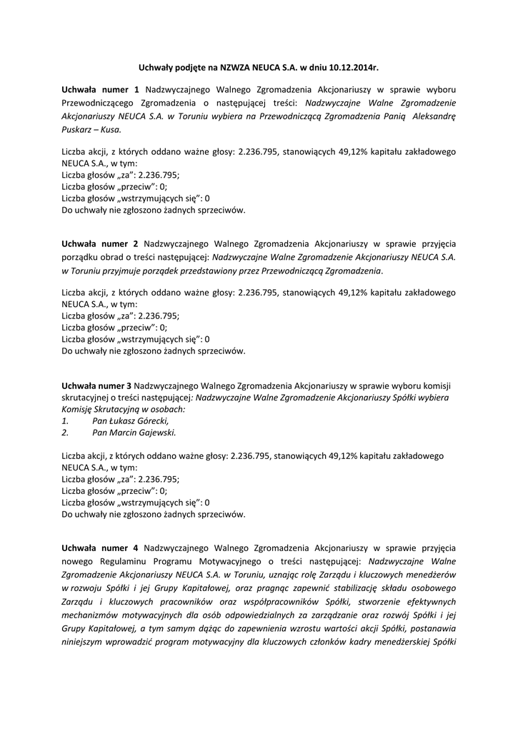 Uchwały podjęte na NZWZA NEUCA S.A. w dniu 10.12.2014r.