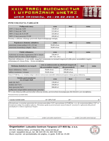 INNE USŁUGI NA TARGACH Podłączenie mocy cena 230V (1 faza) do 3 kW 145,00 zł 380V (3 fazy) do 7 kW 215,00 zł 380V (3 fazy) do 8-25 kW 325,00 zł 380V (3 fazy) powyŜej 25 kW 450,00 zł Prosimy o zabranie własnego przewodu doprowadzającego energię. Pojedyncze elementy zabudowy ustawienie ściany pełnej (1,0 x 2,5 m) ustawienie konstrukcji (słupki + fryz) Ulotki reklamowe ilość suma cena 50,00 zł/szt. 30,00 zł/szt. ilość suma cena ilość suma wyłoŜenie na stoisku organizatora lub w innym 250,00 zł miejscu hali (na okres całych targów) (do 5 tys. szt.) Materiały reklamowe, w tym ulotki, mogą być roznoszone na terenach targowych tylko przez uczestników targów, reklamujących własną firmę – forma nieodpłatna Reklama dodatkowa na targach baner reklamowy / balon tablice rozstawne i wiszące cena za umieszczenie na obiektach targowych dla uczestników targów dla pozostałych 50,00 zł/szt. 250,00 zł/szt. 50,00 zł/szt. 200,00 zł/szt. ilość suma Firma LCT-BIS Sp. z o.o. świadczy usługi w zakresie wykonywania materiałów reklamowych poprzez własną agencję reklamową. Stoisko gastronomiczne cena ilość suma na zewnątrz hali małe (do 4m²) 120,00 zł średnie (do 9 m²) 250,00 zł duŜe (powyŜej 9m²) 500,00 zł podłączenie energii (tabela zamieszczona powyŜej) W/w ceny dotyczą tylko powierzchni roboczej stoiska, powierzchnia konsumpcyjna dla klientów jest nieodpłatna. PowyŜsze kwoty są cenami netto. Łączna wartość netto . . . . . . . . . . . . . . . . . . . . . . . . zł + 23% VAT . . . . . . . . . . . . . . zł = . . . . . . . . . . . . . . . . . . . . . . . . . . . . . . . . zł Oświadczamy, Ŝe jesteśmy uprawnieni do otrzymywania faktur VAT i upowaŜniamy LCT-BIS Sp. z o.o. do wystawienia faktury VAT za świadczone usługi, bez podpisu nabywcy. WyraŜamy zgodę na przetwarzanie naszych danych zawartych w zgłoszeniu dla potrzeb niezbędnych w trakcie organizacji Targów. .............................. miejscowość i data ...................................... podpis i pieczątka organizatora ................................... podpis i pieczątka zamawiającego