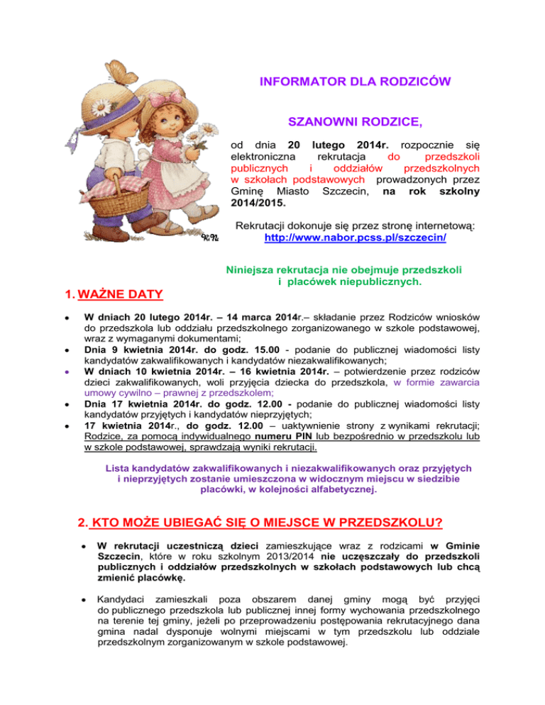 INFORMATOR DLA RODZICÓW SZANOWNI RODZICE, od dnia 20 lutego 2014r. rozpocznie się elektroniczna rekrutacja do przedszkoli publicznych i oddziałów przedszkolnych w szkołach podstawowych prowadzonych przez Gminę Miasto Szczecin, na rok szkolny 2014/2015. Rekrutacji dokonuje się przez stronę internetową: http://www.nabor.pcss.pl/szczecin/ Niniejsza rekrutacja nie obejmuje przedszkoli i placówek niepublicznych. 1. WAŻNE DATY W dniach 20 lutego 2014r. – 14 marca 2014r.– składanie przez Rodziców wniosków do przedszkola lub oddziału przedszkolnego zorganizowanego w szkole podstawowej, wraz z wymaganymi dokumentami; Dnia 9 kwietnia 2014r. do godz. 15.00 - podanie do publicznej wiadomości listy kandydatów zakwalifikowanych i kandydatów niezakwalifikowanych; W dniach 10 kwietnia 2014r. – 16 kwietnia 2014r. – potwierdzenie przez rodziców dzieci zakwalifikowanych, woli przyjęcia dziecka do przedszkola, w formie zawarcia umowy cywilno – prawnej z przedszkolem; Dnia 17 kwietnia 2014r. do godz. 12.00 - podanie do publicznej wiadomości listy kandydatów przyjętych i kandydatów nieprzyjętych; 17 kwietnia 2014r., do godz. 12.00 – uaktywnienie strony z wynikami rekrutacji; Rodzice, za pomocą indywidualnego numeru PIN lub bezpośrednio w przedszkolu lub w szkole podstawowej, sprawdzają wyniki rekrutacji. Lista kandydatów zakwalifikowanych i niezakwalifikowanych oraz przyjętych i nieprzyjętych zostanie umieszczona w widocznym miejscu w siedzibie placówki, w kolejności alfabetycznej. 2. KTO MOŻE UBIEGAĆ SIĘ O MIEJSCE W PRZEDSZKOLU? W rekrutacji uczestniczą dzieci zamieszkujące wraz z rodzicami w Gminie Szczecin, które w roku szkolnym 2013/2014 nie uczęszczały do przedszkoli publicznych i oddziałów przedszkolnych w szkołach podstawowych lub chcą zmienić placówkę. Kandydaci zamieszkali poza obszarem danej gminy mogą być przyjęci do publicznego przedszkola lub publicznej innej formy wychowania przedszkolnego na terenie tej gminy, jeżeli po przeprowadzeniu postępowania rekrutacyjnego dana gmina nadal dysponuje wolnymi miejscami w tym przedszkolu lub oddziale przedszkolnym zorganizowanym w szkole podstawowej. DZIECI 3 - 4 – LETNIE (rok urodzenia 2011-2010) Z dniem 1 września 2014r. na wniosek rodziców edukację przedszkolną mogą rozpocząć dzieci trzy i czteroletnie (rok urodzenia 2011-2010), a w szczególnie uzasadnionych przypadkach dzieci które ukończyły 2,5 roku. Zgodnie z powyższym dziecko w tym wieku jest uprawnione do korzystania z opieki przedszkolnej w: 1. przedszkolu publicznym, 2. oddziale przedszkolnym zorganizowanym w niektórych szkołach podstawowych. Możecie Państwo wybrać z listy trzy preferowane placówki. Na pierwszym miejscu proszę wpisać tę placówkę, na której najbardziej Państwu zależy. DZIECI 5 – LETNIE (rok urodzenia 2009) W roku szkolnym 2014/2015 obowiązkiem odbycia rocznego przygotowania przedszkolnego objęte będą wszystkie dzieci urodzone w 2009r. Obowiązek ten rozpoczyna się z początkiem roku szkolnego w roku kalendarzowym, w którym dziecko kończy 5 lat, tj. z dniem 1 września 2014r. Zgodnie z powyższym dziecko w wieku 5 lat jest obowiązane odbyć roczne przygotowanie przedszkolne w: 1. przedszkolu publicznym, 2. oddziale przedszkolnym zorganizowanym w szkole podstawowej. Można wybrać nie więcej niż trzy placówki. Zalecane jest, aby jednym z wyborów była szkoła podstawowa, w obwodzie której dziecko mieszka. Na pierwszym miejscu proszę wpisać tę placówkę, na której najbardziej Państwu zależy. DZIECI 6 – LETNIE urodzone w okresie od dnia 1 lipca 2008r. do dnia 31 grudnia 2008r. Dzieci urodzone w okresie od dnia 1 lipca 2008r. do dnia 31 grudnia 2008r. ponownie realizują przygotowanie przedszkolne w: 1. oddziale przedszkolnym zorganizowanym w szkole podstawowej, 2. przedszkolu. Na wniosek rodziców, dzieci urodzone w okresie od dnia 1 lipca 2008r. do dnia 31 grudnia 2008r. mogą także z dniem 1 września 2014r. rozpocząć naukę w klasie pierwszej. Można wybrać nie więcej niż trzy placówki. Zalecane jest, aby jednym z wyborów była szkoła podstawowa, w obwodzie której dziecko mieszka. Na pierwszym miejscu proszę wpisać tę placówkę, na której najbardziej Państwu zależy. UWAGA!!! Dzieci w wieku 5-6 – lat mogą realizować obowiązek rocznego przygotowania przedszkolnego również w przedszkolach i placówkach niepublicznych, które prowadzą odrębną rekrutację. DZIECI 6 – LETNIE urodzone w okresie od dnia 1 stycznia 2008r. do dnia 30 czerwca 2008r. Z dniem 1 września 2014r. dzieci 6-letnie, urodzone w okresie od 1 stycznia 2008r. do dnia 30 czerwca 2008r. nie biorą udziału w rekrutacji do przedszkoli publicznych i oddziałów przedszkolnych w szkołach podstawowych, gdyż są obowiązane do rozpoczęcia nauki w klasie pierwszej szkoły podstawowej. Wyjątek stanowią dzieci, które w okresie naboru posiadają aktualną decyzję dyrektora szkoły obwodowej w sprawie odroczenia obowiązku szkolnego. Zgodnie z ustawą o systemie oświaty decyzję w sprawie odroczenia obowiązku szkolnego podejmuje dyrektor publicznej szkoły podstawowej, w obwodzie której dziecko mieszka, po zasięgnięciu opinii poradni psychologiczno-pedagogicznej. W związku z powyższym opinia wydana przez poradnię psychologiczno – pedagogiczną lub zaświadczenie nie uprawniają dziecka do kontynuacji edukacji przedszkolnej. Jedynym dokumentem uprawniającym dziecko do kontynuacji wychowania przedszkolnego jest decyzja odraczająca obowiązek szkolny wydana przez dyrektora publicznej szkoły podstawowej, w obwodzie której dziecko mieszka. 3. KRYTERIA REKRUTACJI MINISTERIALNE KRYTERIA REKRUTACJI Do publicznego przedszkola i oddziału przedszkolnego w szkole podstawowej przyjmuje się kandydatów zamieszkałych na obszarze gminy Szczecin. W przypadku większej liczby kandydatów (zamieszkujących gminę Szczecin) niż wolnych miejsc, w pierwszym etapie postępowania rekrutac