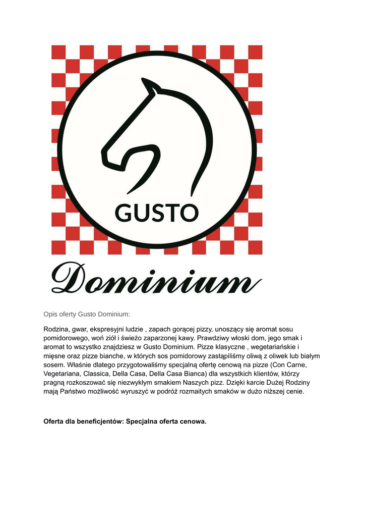 Opis oferty Gusto Dominium: Rodzina, gwar, ekspresyjni ludzie , zapach gorącej pizzy, unoszący się aromat sosu pomidorowego, woń ziół i świeżo zaparzonej kawy. Prawdziwy włoski dom, jego smak i aromat to wszystko znajdziesz w Gusto Dominium. Pizze klasyczne , wegetariańskie i mięsne oraz pizze bianche, w których sos pomidorowy zastąpiliśmy oliwą z oliwek lub białym sosem. Właśnie dlatego przygotowaliśmy specjalną ofertę cenową na pizze (Con Carne, Vegetariana, Classica, Della Casa, Della Casa Bianca) dla wszystkich klientów, którzy pragną rozkoszować się niezwykłym smakiem Naszych pizz. Dzięki karcie Dużej Rodziny mają Państwo możliwość wyruszyć w podróż rozmaitych smaków w dużo niższej cenie. Oferta dla beneficjentów: Specjalna oferta cenowa.