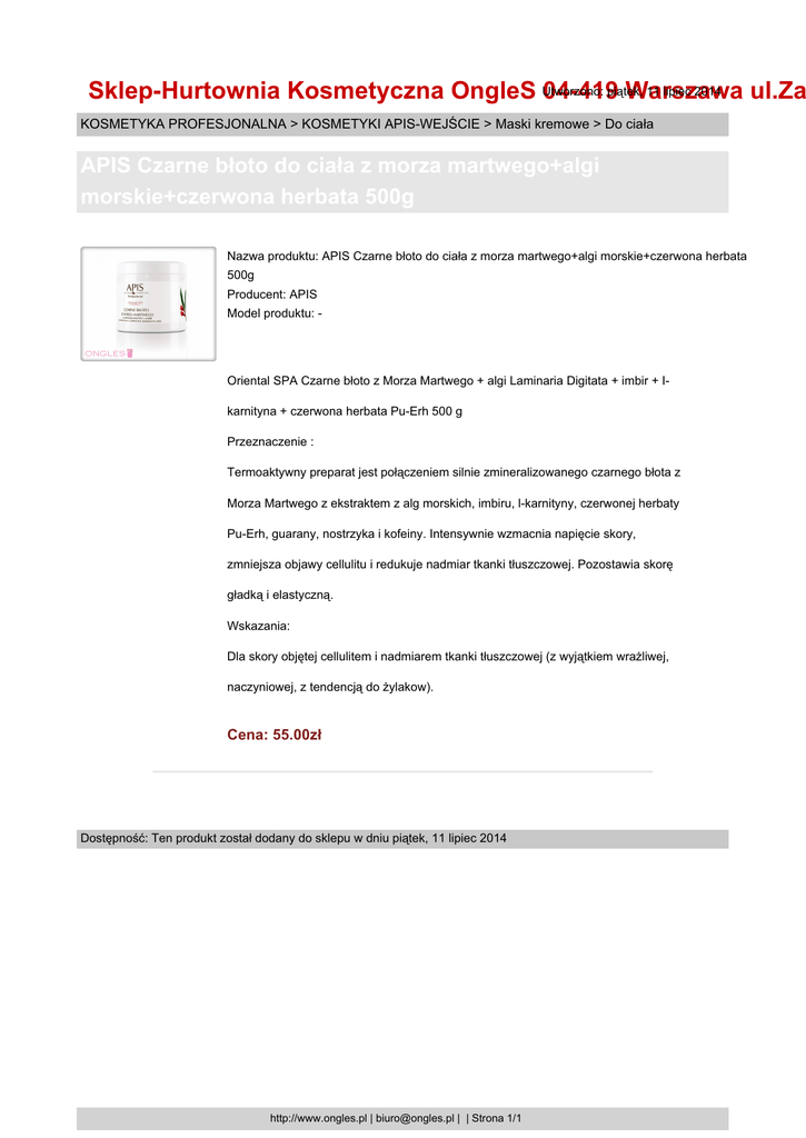 11 lipiec 2014 Sklep-Hurtownia Kosmetyczna OngleS Utworzono: 04-419piątek, Warszawa ul.Za KOSMETYKA PROFESJONALNA > KOSMETYKI APIS-WEJŚCIE > Maski kremowe > Do ciała APIS Czarne błoto do ciała z morza martwego+algi morskie+czerwona herbata 500g Nazwa produktu: APIS Czarne błoto do ciała z morza martwego+algi morskie+czerwona herbata 500g Producent: APIS Model produktu: - Oriental SPA Czarne błoto z Morza Martwego + algi Laminaria Digitata + imbir + Ikarnityna + czerwona herbata Pu-Erh 500 g Przeznaczenie : Termoaktywny preparat jest połączeniem silnie zmineralizowanego czarnego błota z Morza Martwego z ekstraktem z alg morskich, imbiru, l-karnityny, czerwonej herbaty Pu-Erh, guarany, nostrzyka i kofeiny. Intensywnie wzmacnia napięcie skory, zmniejsza objawy cellulitu i redukuje nadmiar tkanki tłuszczowej. Pozostawia skorę gładką i elastyczną. Wskazania: Dla skory objętej cellulitem i nadmiarem tkanki tłuszczowej (z wyjątkiem wrażliwej, naczyniowej, z tendencją do żylakow). Cena: 55.00zł Dostępność: Ten produkt został dodany do sklepu w dniu piątek, 11 lipiec 2014 http://www.ongles.pl | [email protected] | | Strona 1/1