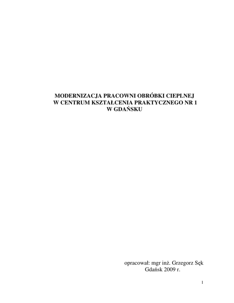 MODERNIZACJA PRACOWNI OBRÓBKI CIEPLNEJ W CENTRUM KSZTAŁCENIA PRAKTYCZNEGO NR 1 W GDAŃSKU opracował: mgr inŜ. Grzegorz Sęk Gdańsk 2009 r. 1 SPIS TREŚCI 1. 2. Wstęp…………………………………………………………..………1 Cel i zakres pracy………………………………………………………2 3. Stan obecny moŜliwości szkoleniowych i produkcyjnych warsztatu szkolnego Centrum Kształcenia Praktycznego Nr. 1 w Gdańsku……..3 3.1 Pracownia obróbki cieplnej…………………………………………....4 3.1.1 Stan obecny pracowni………………………………………………….6 3.2 3.3 3.4 4. 4.1 Pomiary twardości……………………………………………………..8 Pomiary temperatury oleju podczas hartowania………………………12 Obecny przebieg procesu hartowania…………………………………15 Propozycja modernizacji pracowni obróbki cieplnej………………….17 Dane techniczne nowych pozycji do wyposaŜenia pracowni obróbki cieplnej……………………………………………................20 Wnioski…………………………………………………….................26 Źródła………………………………………… ………………………27 2 1. Wstęp „Modernizacja procesu obróbki cieplnej metali w warsztatach szkolnych’’ -to temat pracy magisterskiej którą napisałem w trakcie studiów (w latach 2006-2009) o kierunku: edukacja techniczno-informatyczna na Uniwersytecie Kazimierza Wielkiego w Bydgoszczy pod kierunkiem promotora dr inŜ. T. Z. Woźniaka. Przedmiotem pracy magisterskiej jest pracownia obróbki cieplnej w Centrum Kształcenia Praktycznego Nr 1 w Gdańsku (CKP Nr 1). Z pracy magisterskiej, poniŜej przedstawiona została tylko część merytoryczna modernizacji pracowni obróbki cieplnej wraz z jej uzasadnieniem. 3 2. Cel i zakres pracy W celu poprawy jakości praktycznej nauki zawodu oraz zwiększenia wydajności pracy, podjęto działania mające na celu modernizację bazy techniczno– dydaktycznej pracowni obróbki cieplnej w CKP Nr 1. Opisany został tu stan obecny moŜliwości szkoleniowych i produkcyjnych pracowni obróbki cieplnej. W zilustrowany sposób na przykładzie operacji hartowania stali przedstawiono poszczególne czynności wykonywane ręcznie. Propozycja modernizacji polegać ma na wprowadzeniu do pracowni kilku rozwiązań technicznych, które usprawnią pracę i ograniczą do minimum wysiłek fizyczny człowieka. Modernizację tą przedstawiono w zilustrowany sposób z opisem poszczególnych czynności. 4 3. Stan obecny moŜliwości szkoleniowych i produkcyjnych warsztatu szkolnego Centrum Kształcenia Praktycznego Nr. 1 w Gdańsku Głównym zadaniem kaŜdego warsztatu szkolnego jest przede wszystkim nauka zawodu. Przygotowanie teoretyczne uczniowie i słuchacze otrzymują w szkołach macierzystych tj. Pomorskie Szkoły Rzemiosł, Ogólnokształcące Szkoły Sportowe i Zawodowe, Zespół Szkół Budownictwa Okrętowego, Zespół Szkół Samochodowych, AP - Edukacja, ,,Akademia”- Pomorskie Centrum Edukacyjne. Centrum Kształcenia Praktycznego prowadzi zajęcia i szkoli w zawodach: - programowanie i obsługa obrabiarek sterowanych numerycznie – certyfikat MTS; - technik mechanik; - technik mechatronik; - technik optyk; - technik bhp; - mechanik – monter maszyn i urządzeń; - monter kadłubów okrętowych; Świadczone są usługi w zakresie: - obróbki cieplnej i cieplno-chemicznej; - obróbki wiórowej; - prac ślusarskich; - prac spawalniczych; Ponadto placówka pełni rolę ośrodka egzaminacyjnego w którym za pośrednictwem Okręgowej Komisji Egzaminacyjnej w Gdańsku przeprowadzane są egzaminy z zakresu etapu praktycznego - egzaminu zawodowego. 5 3.1 Pracownia obróbki cieplnej Opis czynności wykonywanych w hartowni: - nadzorowanie pracy pieców hartowniczych, wanien i urządzeń hartowniczych w celu zmiany fizycznych i chemicznych właściwości części metalowych przy zastosowaniu metod kontrolowanego ogrzewania i chłodzenia jak: hartowanie, odpuszczanie, wyŜarzanie, nawęglanie; - nadzorowanie, regulowanie temperatur i czasu cyklu grzewczego oraz rodzaj i temperaturę wanien w celu osiągnięcia określonej twardości, wytrzymałości i plastyczności części przy zastosowaniu standardowych kart obróbki cieplnej i wykorzystaniu wiedzy o metodach, technologii i urządzeniach do obróbki cieplnej oraz właściwościach metali; - ustawianie regulatora pieca obserwacja termometru w celu osiągnięcia wymaganej temperatury; - załadowanie wsadu do pieca, wyjęcie go po upływie wymaganego czasu wygrzewania, oziębienie w kąpieli: wodnej lub olejowej albo pozwolenie na ostygnięcie w powietrzu a niekiedy wraz z piecem; - badanie twardości elementów poddanych obróbce cieplnej lub cieplno – chemicznej; - podnoszenie, przenoszenie i transport wewnętrzny detali: przed, w trakcie i po obróbce cieplnej lub cieplno chemicznej; - prostowanie wygiętych detali powstałych na skutek działania ciepła; ZagroŜenia występujące w pracowni obróbki cieplnej: - praca w środowisku gorącym, co moŜe być powodem problemów zdrowotnych związanych z zespołem przegrzania organizmu a takŜe poparzenia; - podczas hartowania wydzielają się toksyczne gazy i dymy a ich stęŜenie moŜe być niebezpieczne dla zdrowia; 6 - przenoszenie cięŜkich ładunków i wykonywanie czynności powtarzalnych, moŜe powodować urazy i dolegliwości bólowe wynikające z przeciąŜenia układu mięśniowo-szkieletowego. Czynniki środowiska pracy w hartowni oraz ich moŜliwe skutki dla zdrowia: A). Czynniki mogące powodować wypadki: - śliskie nawierzchnie – moŜliwość urazów w wyniku poślizgnięcia i upadku; - cięŜkie przedmioty – moŜliwość urazów stup w przypadku upuszczenia; - gorące przedmioty i części metalowe, gorący olej stosowany podczas hartowania w oleju – moŜliwość poparzeń; - stęŜenie tlenku 