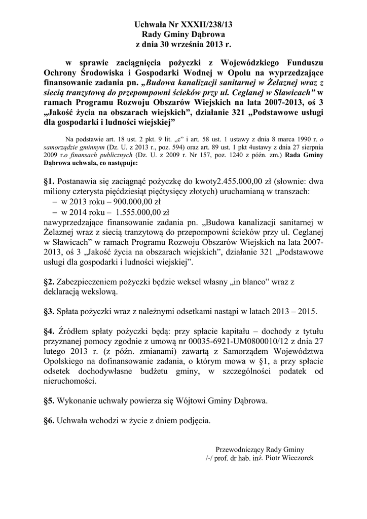 Uchwała Nr XXXII/238/13 Rady Gminy Dąbrowa z dnia 30 września 2013 r. w sprawie zaciągnięcia pożyczki z Wojewódzkiego Funduszu Ochrony Środowiska i Gospodarki Wodnej w Opolu na wyprzedzające finansowanie zadania pn. „Budowa kanalizacji sanitarnej w Żelaznej wraz z siecią tranzytową do przepompowni ścieków przy ul. Ceglanej w Sławicach” w ramach Programu Rozwoju Obszarów Wiejskich na lata 2007-2013, oś 3 „Jakość życia na obszarach wiejskich”, działanie 321 „Podstawowe usługi dla gospodarki i ludności wiejskiej” Na podstawie art. 18 ust. 2 pkt. 9 lit. „c” i art. 58 ust. 1 ustawy z dnia 8 marca 1990 r. o samorządzie gminnym (Dz. U. z 2013 r., poz. 594) oraz art. 89 ust. 1 pkt 4ustawy z dnia 27 sierpnia 2009 r.o finansach publicznych (Dz. U. z 2009 r. Nr 157, poz. 1240 z późn. zm.) Rada Gminy Dąbrowa uchwala, co następuje: §1. Postanawia się zaciągnąć pożyczkę do kwoty2.455.000,00 zł (słownie: dwa miliony czterysta pięćdziesiąt pięćtysięcy złotych) uruchamianą w transzach: − w 2013 roku – 900.000,00 zł − w 2014 roku – 1.555.000,00 zł nawyprzedzające finansowanie zadania pn. „Budowa kanalizacji sanitarnej w Żelaznej wraz z siecią tranzytową do przepompowni ścieków przy ul. Ceglanej w Sławicach” w ramach Programu Rozwoju Obszarów Wiejskich na lata 20072013, oś 3 „Jakość życia na obszarach wiejskich”, działanie 321 „Podstawowe usługi dla gospodarki i ludności wiejskiej”. §2. Zabezpieczeniem pożyczki będzie weksel własny „in blanco” wraz z deklaracją wekslową. §3. Spłata pożyczki wraz z należnymi odsetkami nastąpi w latach 2013 – 2015. §4. Źródłem spłaty pożyczki będą: przy spłacie kapitału – dochody z tytułu przyznanej pomocy zgodnie z umową nr 00035-6921-UM0800010/12 z dnia 27 lutego 2013 r. (z późn. zmianami) zawartą z Samorządem Województwa Opolskiego na dofinansowanie zadania, o którym mowa w §1, a przy spłacie odsetek dochodywłasne budżetu gminy, w szczególności podatek od nieruchomości. §5. Wykonanie uchwały powierza się Wójtowi Gminy Dąbrowa. §6. Uchwała wchodzi w życie z dniem podjęcia. Przewodniczący Rady Gminy /-/ prof. dr hab. inż. Piotr Wieczorek