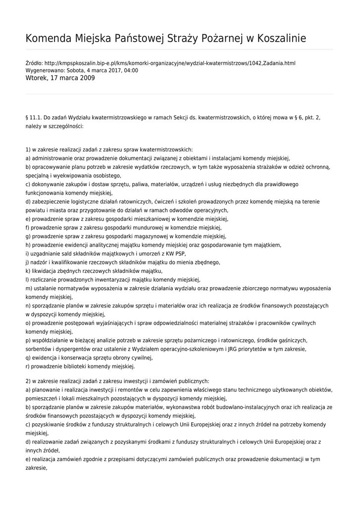 Komenda Miejska Państowej Straży Pożarnej w Koszalinie Źródło: http://kmpspkoszalin.bip-e.pl/kms/komorki-organizacyjne/wydzial-kwatermistrzows/1042,Zadania.html Wygenerowano: Sobota, 4 marca 2017, 04:00 Wtorek, 17 marca 2009 § 11.1. Do zadań Wydziału kwatermistrzowskiego w ramach Sekcji ds. kwatermistrzowskich, o której mowa w § 6, pkt. 2, należy w szczególności: 1) w zakresie realizacji zadań z zakresu spraw kwatermistrzowskich: a) administrowanie oraz prowadzenie dokumentacji związanej z obiektami i instalacjami komendy miejskiej, b) opracowywanie planu potrzeb w zakresie wydatków rzeczowych, w tym także wyposażenia strażaków w odzież ochronną, specjalną i wyekwipowania osobistego, c) dokonywanie zakupów i dostaw sprzętu, paliwa, materiałów, urządzeń i usług niezbędnych dla prawidłowego funkcjonowania komendy miejskiej, d) zabezpieczenie logistyczne działań ratowniczych, ćwiczeń i szkoleń prowadzonych przez komendę miejską na terenie powiatu i miasta oraz przygotowanie do działań w ramach odwodów operacyjnych, e) prowadzenie spraw z zakresu gospodarki mieszkaniowej w komendzie miejskiej, f) prowadzenie spraw z zakresu gospodarki mundurowej w komendzie miejskiej, g) prowadzenie spraw z zakresu gospodarki magazynowej w komendzie miejskiej, h) prowadzenie ewidencji analitycznej majątku komendy miejskiej oraz gospodarowanie tym majątkiem, i) uzgadnianie sald składników majątkowych i umorzeń z KW PSP, j) nadzór i kwalifikowanie rzeczowych składników majątku do mienia zbędnego, k) likwidacja zbędnych rzeczowych składników majątku, l) rozliczanie prowadzonych inwentaryzacji majątku komendy miejskiej, m) ustalanie normatywów wyposażenia w zakresie działania wydziału oraz prowadzenie zbiorczego normatywu wyposażenia komendy miejskiej, n) sporządzanie planów w zakresie zakupów sprzętu i materiałów oraz ich realizacja ze środków finansowych pozostających w dyspozycji komendy miejskiej, o) prowadzenie postępowań wyjaśniających i spraw odpowiedzialności materialnej strażaków i pracowników cywilnych komendy miejskiej, p) współdziałanie w bieżącej analizie potrzeb w zakresie sprzętu pożarniczego i ratowniczego, środków gaśniczych, sorbentów i dyspergentów oraz ustalenie z Wydziałem operacyjno-szkoleniowym i JRG priorytetów w tym zakresie, q) ewidencja i konserwacja sprzętu obrony cywilnej, r) prowadzenie biblioteki komendy miejskiej. 2) w zakresie realizacji zadań z zakresu inwestycji i zamówień publicznych: a) planowanie i realizacja inwestycji i remontów w celu zapewnienia właściwego stanu technicznego użytkowanych obiektów, pomieszczeń i lokali mieszkalnych pozostających w dyspozycji komendy miejskiej, b) sporządzanie planów w zakresie zakupów materiałów, wykonawstwa robót budowlano-instalacyjnych oraz ich realizacja ze środków finansowych pozostających w dyspozycji komendy miejskiej, c) pozyskiwanie środków z funduszy strukturalnych i celowych Unii Europejskiej oraz z innych źródeł na potrzeby komendy miejskiej, d) realizowanie zadań związanych z pozyskanymi środkami z funduszy strukturalnych i celowych Unii Europejskiej oraz z innych źródeł, e) realizacja zamówień zgodnie z przepisami dotyczącymi zamówień publicznych oraz prowadzenie dokumentacji w tym zakresie, f) realizacja sprawozdawczości z zakresu zamówień publicznych, w tym prowadzenie Księgi zamówień publicznych komendy miejskiej. 2. Do zadań Wydziału kwatermistrzowskiego w ramach sekcji ds. technicznych, o której mowa w § 6, pkt. 2, należy w szczególności: 1) w zakresie realizacji zadań z zakresu spraw techniki i transportu: a) inicjowanie i podejmowanie działań na rzecz utrzymania gotowości operacyjno-technicznej sprzętu transportowego, silnikowego oraz specjalistycznego, b) prowadzenie spraw dotyczących ewidencji, rejestracji i przeglądów technicznych sprzętu transportowego, silnikowego oraz specjalistycznego, c) obsługa transportowa komórek organizacyjnych komendy miejskiej, d) prowadzenie gospodarki częściami zamiennymi, olejami, smarami i innymi materiałami eksploatacyjnymi, e) nadzorowanie i analizowanie prawidłowości prowadzenia przez komórki organizacyjne komendy miejskiej dokumentacji związanej z samochodami i sprzętem silnikowym, a w szczególności rozliczania zużycia paliw, olejów, smarów i innych materiałów eksploatacyjnych, f) organizowanie przeglądów, napraw oraz konserwacji samochodów, sprzętu silnikowego, ratowniczego i innych urządzeń i instalacji technicznych, g) wypracowywanie wymogów parametrów technicznych dla nowo zakupywanych samochodów i sprzętu silnikowego, h) nadzorowanie realizacji i przestrzegania wytycznych w zakresie gospodarki transportowej, i) logistyczne zabezpieczenie działań jednostek PSP i wsparcie uprawnionych jednostek OSP z KSRG, na przydzielonym obszarze (10 powiatów województwa zachodniopomorskiego), w zakresie napraw i przeglądów okresowych sprzętu ochronnego i pojazdów pożarniczych, j) prowadzenie bieżącej obsługi z zakresu p.gaz.dym podczas prowadzonych działań ratowniczo-gaśniczych po zadysponowaniu przez MSK, k) prowadzenie spraw w zakresie funkcjonującego zaplecza technicznego komendy miejskiej, w tym warsztatu p.gaz.-dym. oraz stacji kontroli pojazdów. 2) w zakresie realizacji zadań z zakresu spraw łączności: a) planowanie systemów łączności dyspozycyjnej, dowodzenia i współdziałania, a także systemów alarmowania na obszarze działania komendy miejskiej, b) zapewnienie prawidłowego funkcjonowania łączności przewodowej oraz bezprzewodowej funkcjonującej w komendzie miejskiej, c) utrzymanie we właściwym stanie technicznym infrastruktury łączności w komendzie miejskiej, d) nadzór nad prawidłowym działaniem urządzeń łączności zainstalowanych w RTON na Górze Chełmskiej oraz ich bieżąca konserwacja i naprawa, e) prowadzenie ewidencji sprzętu łączności oraz łącz te