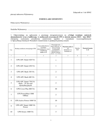 Załącznik nr 1 do SIWZ pieczęć adresowa Wykonawcy FORMULARZ OFERTOWY Pełna nazwa Wykonawcy ................................................................................................................................... .............................................................................................................................................................................. Siedziba Wykonawcy . ........................................................................................................................................ .............................................................................................................................................................................. 1. Odpowiadając na ogłoszenie o przetargu nieograniczonym na „Usługi wymiany zużytych akumulatorów wraz z kalibracją w zasilaczach awaryjnych UPS w okresie marzec 2015 - luty 2016” oferujemy wykonanie przedmiotu zamówienia zgodnie z warunkami wyszczególnionymi w Specyfikacji Istotnych Warunków Zamówienia w podanych poniżej cenach: L.p. Przewidywana Cena jednostkowa ilość UPS-ów, w wymiany których będą Rodzaj zasilacza awaryjnego UPS akumulatorów wraz wymieniane z kalibracją akumulatory w netto w zł okresie marzec 2015 – luty 2016 1 2 1 UPS APC Smart 420 VA 1 2 UPS APC Smart 450 VA 1 3 UPS APC Back 550 VA 2 4 UPS APC Back 600 VA 3 5 UPS APC Smart 750 VA Rack – 2U do szaf dystrybucyjnych 2 6 UPS Cover Plus 800 VA 30 7 UPS PowerMust 1000 Offline 2 8 UPS Active Power 1000 VA 10 9 UPS APC Smart 1000 VA Power 2 10 UPS Sweex 1000 VA 5 3 4 1 Wartość netto w zł (kolumna 3 x kolumna 4) Stawka VAT Wartość brutto w zł 5 6 7 1 2 11 UPS APC Smart 1400 VA 2 12 UPS APC Smart 1500 VA 1 13 UPS APC Smart 2200 VA 1 14 UPS APC Smart 2200 VA obudowa typu Rack 19’’ 2 3 4 5 6 7 Całkowita wartość oferty brutto w zł (suma kolumny 7) Słownie całkowita wartość oferty brutto w zł: ………………………………………..……………….…. ………………………………………………………………………………………………………………… 2. Informacje dotyczące terminu wykonania zamówienia oraz okresu gwarancji: 1) zobowiązujemy się do wykonania usługi w terminie: ……………… dni roboczych licząc od dnia następującego po dniu zgłoszenia, o którym mowa w § 3 ust. 2 projektu umowy stanowiącego załącznik nr 3 do SIWZ, Termin należy określić poprzez wskazanie liczby całkowitej od 1 do 7. 2) oferowany okres gwarancji na wymienione akumulatory wynosi: …………...... miesięcy licząc od dnia wykonania usługi. Okres gwarancji należy określić poprzez wskazanie liczby całkowitej nie mniejszej niż 12. 3. Oświadczamy, że w cenie oferty zostały uwzględnione wszystkie koszty wykonania zamówienia i realizacji przyszłego świadczenia umownego, w tym koszty robocizny, wymienianych akumulatorów, kalibracji, dojazdu itp. 4. Zapoznaliśmy się ze Specyfikacją Istotnych Warunków Zamówienia i nie wnosimy w stosunku do niej żadnych uwag. 5. Oświadczamy, że data produkcji akumulatorów montowanych w zasilaczach w ramach usługi nie przekroczy 3 miesięcy licząc od daty wymiany. 6. Oświadczamy, że zamierzamy powierzyć wykonanie podwykonawcom następujących części zamówienia: Części zamówienia, których wykonanie zostanie powierzone podwykonawcom Uwaga. W przypadku braku wskazania części zamówienia, której wykonanie będzie powierzone podwykonawcom, przyjmuje się, że całość zamówienia zostanie zrealizowana siłami własnymi Wykonawcy. 2 7. Wadium wpłacone w pieniądzu prosimy zwrócić na rachunek bankowy: ................................................. ....................................................................................................................................................................... Wszelką korespondencję w sprawie niniejszego postępowania należy kierować do: Imię i Nazwisko ………………………………………………………………………………………….. Adres: ………………………………………………………………………………………….. Telefon/Faks: ………………………………………………………………………………………….. Adres e-mail: ………………………………………………………………………………………….. Wzór podpisu i parafy osoby/osób podpisujących ofertę (Wykonawcy lub uprawnionego do reprezentacji Wykonawcy): Czytelne imię i nazwisko Podpis Parafa Ofertę niniejszą składamy na ……*** kolejno zaparafowanych i ponumerowanych stronach. Miejscowość i data ............................... Podpisano .................................................... (Podpis osoby lub osób uprawnionych do reprezentowania Wykonawcy na podstawie dokumentów rejestrowych lub pełnomocnictwa) *** Należy wpisać łączną ilość stron, tj. formularz oferty wraz ze wszystkimi załącznikami i dokumentami wymaganymi w SIWZ 3