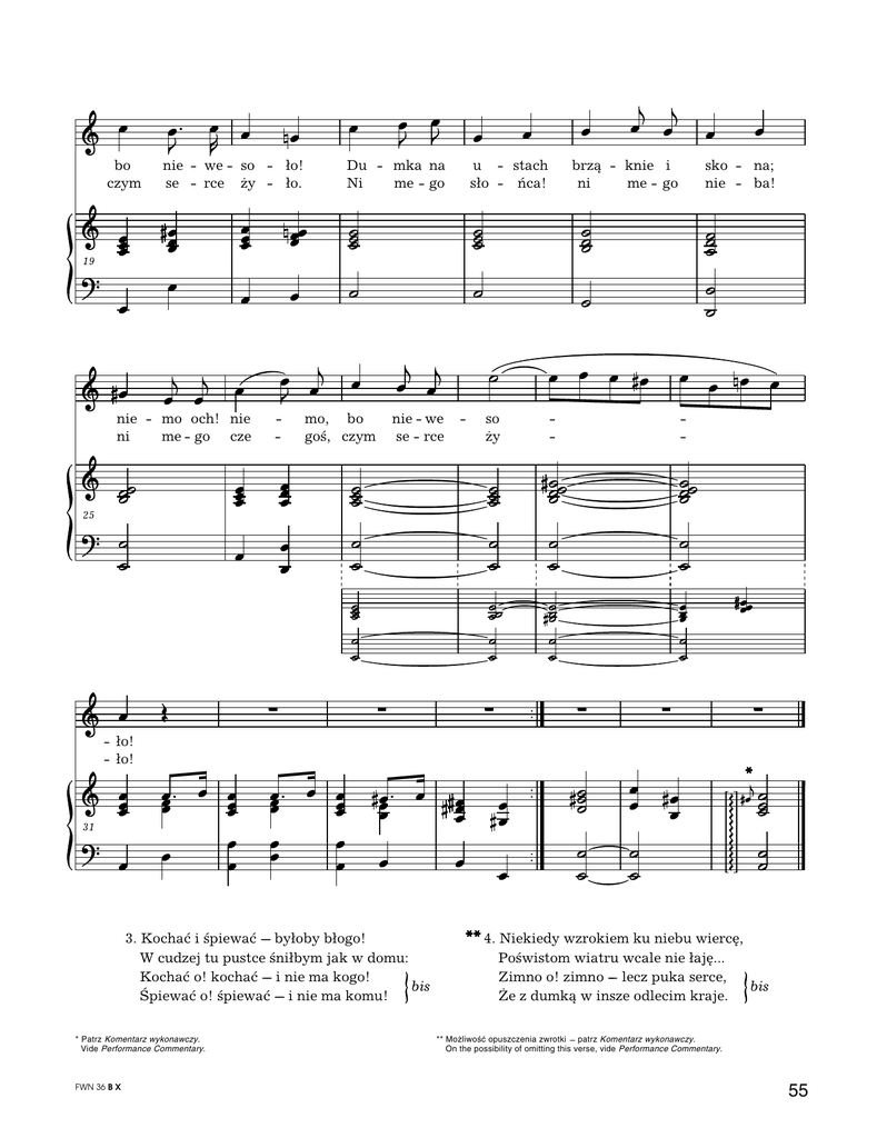 bo czym nie - we - so - ło! se - rce ży - ło. Du - mka na Ni me - go u - stach sło - ńca! brzą - knie i ni me - go sko - na; nie - ba! 19 nie - mo och! nie ni me - go cze - mo, bo goś, czym nie - we se - rce - so ży - - 25 - ło! - ło! 31 3. Kochać i śpiewać -- byłoby błogo! W cudzej tu pustce śniłbym jak w domu: Kochać o! kochać -- i nie ma kogo! bis Śpiewać o! śpiewać -- i nie ma komu! * Patrz Komentarz wykonawczy. Vide Performance Commentary. FWN 36 B X 4. Niekiedy wzrokiem ku niebu wiercę, Poświstom wiatru wcale nie łaję... Zimno o! zimno --- lecz puka serce, bis Że z dumką w insze odlecim kraje. ** Możliwość opuszczenia zwrotki patrz Komentarz wykonawczy. On the possibility of omitting this verse, vide Performance Commentary. 55 a sa - mi do tych nie we - jdą prze - strze - ni! Do go - dów ży - cia 25 ni- gdy nie za - się - dą, i na - wet, na - wet mo - że za - pomnieni, 31 za - po - mnie - ni, za - po - mnie - ni legatiss. 37 bę - - - dą! 43 FWN 36 B X 59