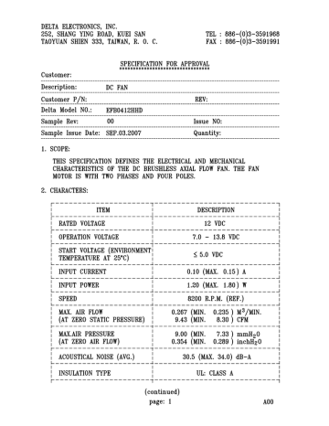 Descriptions: 1. Delta will not guarantee the performance of the products if the application condition falls outside the parameters set forth in the specification. 2. A written request should be submitted to Delta prior to approval if deviation from this specification is required. 3. Please exercise caution when handling fans. Damage may be caused when pressure is applied to the impeller, if the fans are handled by the lead wires, or if the fans are hard-dropped to the production floor. 4. Except as pertains to some special designs, there is no guarantee that the products will be free from any such safety problems or failures as caused by the introduction of powder, droplets of water or encroachment of insect into the hub. 5. The above-mentioned conditions are representative of some unique examples and viewed as the first point of reference prior to all other information. 6. It is very important to establish the correct polarity before connecting the fan to the power source. Positive (+) and Negative (-). Damage may be caused to the fans if connection is with reverse polarity, as there is no foolproof method to protect against such error. 7. Delta fans are not suitable where any corrosive fluids are introduced to their environment. 8. Please ensure all fans are stored according to the storage temperature limits specified. Do not store fans in a high humidity environment. We highly recommend performance testing is conducted before shipping, if the fans have been stored over 6 months. 9. Not all fans are provided with the Lock Rotor Protection feature. If you impair the rotation of the impeller for the fans that do not have this function, the performance of those fans will lead to failure. 10. Please be cautious when mounting the fan. Incorrect mounting of fans may cause excess resonance, vibration and subsequent noise. 11. It is important to consider safety when testing the fans. A suitable fan guard should be fitted to the fan to guard against any potential for personal injury. 12. Except where specifically stated, all tests are carried out at relative (ambient) temperature and humidity conditions of 25oC, 65%. The test value is only for fan performance itself. 13. Be certain to connect an “over 4.7µF” capacitor to the fan externally when the application calls for using multiple fans in parallel, to avoid any unstable power.