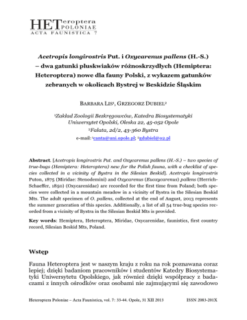 Acetropis longirostris Put. i Oxycarenus pallens (H.-S.) – dwa gatunki pluskwiaków różnoskrzydłych (Hemiptera: Heteroptera) nowe dla fauny Polski, z wykazem gatunków zebranych w okolicach Bystrej w Beskidzie Śląskim BARBARA LIS1, GRZEGORZ DUBIEL2 1Zakład Zoologii Bezkręgowców, Katedra Biosystematyki Uniwersytet Opolski, Oleska 22, 45-052 Opole 2Fałata, 2d/2, 43-360 Bystra e-mail: [email protected]; [email protected] Abstract. [Acetropis longirostris Put. and Oxycarenus pallens (H.-S.) – two species of true-bugs (Hemiptera: Heteroptera) new for the Polish fauna, with a checklist of species collected in a vicinity of Bystra in the Silesian Beskid]. Acetropis longirostris Puton, 1875 (Miridae: Stenodemini) and Oxycarenus (Euoxycarenus) pallens (HerrichSchaeffer, 1850) (Oxycarenidae) are recorded for the first time from Poland; both species were collected in a mountain meadow in a vicinity of Bystra in the Silesian Beskid Mts. The adult specimen of O. pallens, collected at the end of August, 2013 represents the summer generation of this species. Additionally, a list of all 54 true-bug species recorded from a vicinity of Bystra in the Silesian Beskid Mts is provided. Key words: Hemiptera, Heteroptera, Miridae, Oxycarenidae, faunistics, first country record, Silesian Beskid Mts, Poland. Wstęp Fauna Heteroptera jest w naszym kraju z roku na rok poznawana coraz lepiej; dzięki badaniom pracowników i studentów Katedry Biosystematyki Uniwersytetu Opolskiego, jak również dzięki współpracy z badaczami z innych ośrodków oraz osobami nie zajmującymi się zawodowo Heteroptera Poloniae – Acta Faunistica, vol. 7: 33-44. Opole, 31 XII 2013 ISSN 2083-201X 34 entomologią, w ostatnich latach stwierdzono występowanie w naszym kraju wielu gatunków Heteroptera do tej pory nieznanych z Polski (np.: Dicyphus annulatus – B. Lis 2000; Emblethis duplicatus – B. Lis i J.A. Lis 2002; Charagochilus weberi – B. Lis i in. 2004; Coranus woodroffei – J.A. Lis i B. Lis 2004; Heterogaster cathariae – B. Lis i J.A. Lis 2006; Leptoglossus occidentalis – J.A. Lis i in. 2008; Corythuca ciliata – B. Lis 2009; Arocatus longiceps – Gil i in. 2011; Scolopostethus grandis – B. Lis i Konciała 2012). Niniejsza praca przedstawia wyniki odłowów faunistycznych prowadzonych przez drugiego autora (G. Dubiel) w okolicach Bystrej w Beskidzie Śląskim. Owady odławiane były głównie czerpakiem entomologicznym (2 x 50 uderzeń) na czterech stanowiskach stanowiących nieużytkowane pola uprawne na terenach podgórskich podlegające obecnie naturalnej sukcesji. Każde ze stanowisk odwiedzane było minimum raz w miesiącu od maja do początku listopada 2013 roku. Gatunki nowe dla fauny Polski Oxycarenus pallens (Herrich-Schaeffer, 1850) (Oxycarenidae) (Ryc. 1-3) Materiał: 1 samica, Beskid Śląski, łąka między Meszną a Buczkowicami [CA61], 24. 08. 2013, (czerpak), leg. G. Dubiel. Zasięg tego gatunku ma postać pasa ciągnącego się od Europy i północnej Afryki, przez zachodnią i środkową Azję, aż po północne Chiny i Indie (Péricart 1999). W Europie północna granica tego gatunku przebiega przez centralną Francję, południowe Niemcy, Czechy, Słowację i Ukrainę (Péricart 2001; Wachmann i in. 2007). U naszych południowych sąsiadów występuje już od lat pięćdziesiątych ubiegłego stulecia (Krist i Kment 2006; Stehlík i Vavřinová 1996). Analizując dane zawarte w pracy Krista i Kmenta (2006) można stwierdzić stopniowe przesuwanie się granicy zasięgu tego gatunku ku północy, a ostanie dane z Moraw dotyczą stanowisk oddalonych zaledwie kilkadziesiąt kilometrów od granicy naszego kraju. Gatunek pokarmowo związany z różnymi roślinami z rodziny Asteraceae, np. Cirsium sp., Sonchus sp., głównie jednak podawany jest z Centaurea sp. (Putshkov, 1969; Péricart, 1999). Heteroptera Poloniae – Acta Faunistica, vol. 7: 33-44. Opole, 31 XII 2013 ISSN 2083-201X 35 Ryc. 1-3. 1 – samica Oxycarenus pallens, 2-3 – miejsce odłowu okazu. Figs. 1-3. 1 – female of Oxycarenus pallens, 2-3 – collecting locality. Cykl życiowy tego gatunku jest nie do końca poznany. Zwykle traktowany jako biwoltynny, jednak zarówno Putshkov (1969), jak i Wachmann i in. (2007) sugerują, że ukończenie rozwoju drugiego pokolenia nie zawsze jest możliwe. Nimfy drugiego pokolenia, które licznie występują pod koniec lata, nie są odnajdywane wiosną (Stehlík i Vavřinová 1996). Podobne zjawisko zaobserwowano w przypadku gatunku Eremocoris plebejus (Fallén) (Konciała i B. Lis 2013). W obu wypadkach wydaje się, że gatunki te, które w południowej części Europy mają pełne dwa pokolenia, nie kończą pełnego cyklu rozwojowego w krajach Europy Środkowej ze względu na krótsze lato i niższe średnie temperatury miesięcy letnich. Heteroptera Poloniae – Acta Faunistica, vol. 7: 33-44. Opole, 31 XII 2013 ISSN 2083-201X 36 Okaz znaleziony w Polsce to przedstawiciel nowego pokolenia, co można poznać po jasno zabarwionej głowie i jasnobrązowym pasie w przedniej części przedplecza (u osobników po przezimowaniu zarówno głowa, jak i pas na przedpleczu, mają barwę ciemnobrązową lub czarną). Acetropis longirostris Puton, 1875 (Miridae) (Ryc. 4-6) Materiał: 1 samiec, Beskid Śląski, łąka między Meszną a Buczkowicami [CA51], 9. 06. 2013, leg. G. Dubiel. Gatunek wschodnioeuropejski (Remane i Günther 2008), podawany z Austrii, Czech, Słowacji i Węgier. Na wschodzie swego zasięgu sięga Uralu i północnych wybrzeży Morza Czarnego i Kaspijskiego (Kerzhner i Josifov 1999). Z Polski wymieniane były do tej pory dwa gatunki zaliczane do rodzaju Acetropis Fieber, mianowicie A. gimmerthalii (Flor) i A. carinata (Herrich-Schaeffer) (Gorczyca 2004). A. longirostris od obu wymienionych gatunków różni się przede wszystkim długim labium sięgającym co najmniej II (a często nawet IV) sternitu odwłokowego (Remane i Günther 2008) (Fot. 5). U wymienionych wcześn