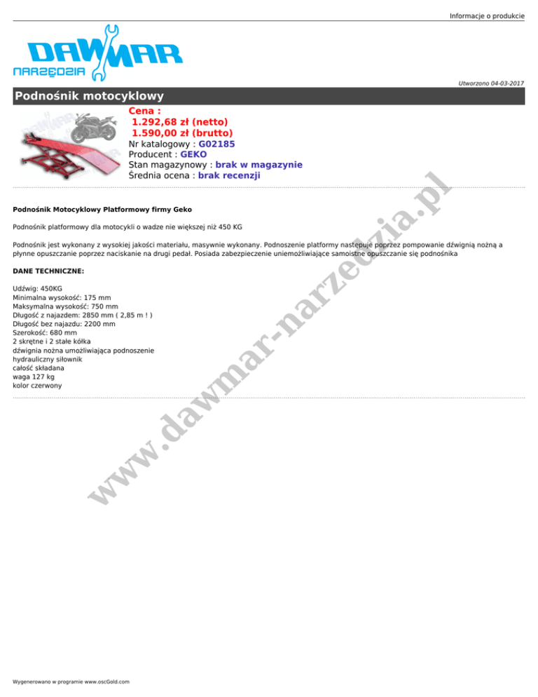 Informacje o produkcie Utworzono 04-03-2017 Podnośnik motocyklowy Cena : 1.292,68 zł (netto) 1.590,00 zł (brutto) zi a. p l Nr katalogowy : G02185 Producent : GEKO Stan magazynowy : brak w magazynie Średnia ocena : brak recenzji Podnośnik Motocyklowy Platformowy firmy Geko Podnośnik platformowy dla motocykli o wadze nie większej niż 450 KG ar ze d Podnośnik jest wykonany z wysokiej jakości materiału, masywnie wykonany. Podnoszenie platformy następuje poprzez pompowanie dźwignią nożną a płynne opuszczanie poprzez naciskanie na drugi pedał. Posiada zabezpieczenie uniemożliwiające samoistne opuszczanie się podnośnika w w w .d m aw Udźwig: 450KG Minimalna wysokość: 175 mm Maksymalna wysokość: 750 mm Długość z najazdem: 2850 mm ( 2,85 m ! ) Długość bez najazdu: 2200 mm Szerokość: 680 mm 2 skrętne i 2 stałe kółka dźwignia nożna umożliwiająca podnoszenie hydrauliczny siłownik całość składana waga 127 kg kolor czerwony ar -n DANE TECHNICZNE: Wygenerowano w programie www.oscGold.com