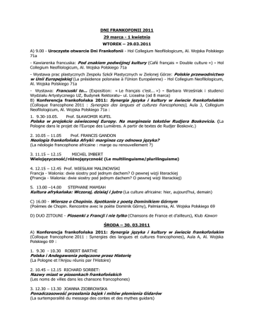 DNI FRANKOFONII 2011 29 marca - 1 kwietnia WTOREK – 29.03.2011 A) 9.00 - Uroczyste otwarcie Dni Frankofonii - Hol Collegium Neofilologicum, Al. Wojska Polskiego 71a - Kawiarenka francuska: Pod znakiem podwójnej kultury (Café français « Double culture ») - Hol Collegium Neofilologicum, Al. Wojska Polskiego 71a - Wystawa prac plastycznych Zespołu Szkół Plastycznych w Zielonej Górze: Polskie przewodnictwo w Unii Europejskiej (La présidence polonaise à l’Union Européenne) - Hol Collegium Neofilologicum, Al. Wojska Polskiego 71a - Wystawa: Francuski to... (Exposition: « Le français c’est... ») - Barbara Wrześniak i studenci Wydziału Artystycznego UZ, Budynek Rektoratu– ul. Licealna (od 8 marca) B) Konferencja frankofońska 2011: Synergia języka i kultury w świecie frankofońskim (Colloque francophone 2011 : Synergies des langues et cultures francophones) , Aula J, Collegium Neofilologicum, Al. Wojska Polskiego 71a : 1. 9.30-10.05. Prof. SŁAWOMIR KUFEL Polska w projekcie oświeconej Europy. Na marginesie tekstów Rudjera Boskovicia. (La Pologne dans le projet de l’Europe des Lumières. A partir de textes de Rudjer Boskovic.) 2. 10.05 – 11.05 Prof. FRANCIS GANDON Neologia frankofońska Afryki: margines czy odnowa języka? (La néologie francophone africaine : marge ou renouvellement ?) 3. 11.15 – 12.15 MICHEL IMBERT Wielojęzyczność/różnojęzyczność (Le multilinguisme/plurilinguisme) 4. 12.15 – 12.45 Prof. WIESŁAW MALINOWSKI Francja - Walonia: dwie siostry pod jednym dachem? O pewnej wizji literackiej (Francja - Walonia: dwie siostry pod jednym dachem? O pewnej wizji literackiej) 5. 13.00 –14.00 STEPHANE MAMIAH Kultura afrykańska: Wczoraj, dzisiaj i jutro (La culture africaine: hier, aujourd’hui, demain) C) 16.00 - Wiersze o Chopinie. Spotkanie z poetą Dominikiem Górnym (Poèmes de Chopin. Rencontre avec le poète Dominik Górny), Palmiarnia, Al. Wojska Polskiego 69 D) DUO ZITOUNI - Piosenki z Francji i nie tylko (Chansons de France et d’ailleurs), Klub Kawon ŚRODA – 30. 03.2011 A) Konferencja frankofońska 2011: Synergia języka i kultury w świecie frankofońskim (Colloque francophone 2011 : Synergies des langues et cultures francophones), Aula A, Al. Wojska Polskiego 69 : 1. 9.30 - 10.30 ROBERT BARTHE Polska i Andegawenia połączone przez Historię (La Pologne et l'Anjou réunis par l'Histoire) 2. 10.45 – 12.15 RICHARD SORBET: Nazwy miast w piosenkach frankofońskich (Les noms de villes dans les chansons francophones) 3. 12.30 – 13.30 JOANNA ZIOBROWSKA Ponadczasowość przesłania bajek i mitów plemienia Gidarów (La surtemporalité du message des contes et des mythes guidars) 4. 13.30 – 14.00 AGATA WOJCIECHOWSKA Młodzi w sercu frankofońskiego miasteczka (Des jeunes au coeur du village francophone) B) 18.00 - Wieczór piosenki francuskiej – studenci Filologii Romańskiej i przyjaciele (Soirée chanson française - Par les Étudiants de la Philologie Romane et leurs Amis), Klub U Ojca C) 21.00 - Karaoke bez granic – angielskie, francuskie, polskie, włoskie (Karaoké sans frontières – anglaise, français, polonais, italien), Klub U Ojca CZWARTEK – 31. 03.2011 A) 10.00 - Konkurs dla gimnazjalistów « Au camping », Aula J, Collegium Neofilologicum, Al. Wojska Polskiego 71a B) 12.00 -– Muzyczny antrakt z DUO ZITOUNI (Entracte avec Duo Zitouni) Hol Collegium Neofilologicum, Al. Wojska Polskiego 71a C) 13.00 - Konkurs wiedzy o krajach frankofońskich dla szkół ponadgimnazjalnych (Concours sur les pays francophones pour les lycéens) Aula J, Collegium Neofilologicum, Al. Wojska Polskiego 71a D) 16.00 - Nowenna /La Neuvaine /– projekcja filmu kanadyjskiego (francuska wersja językowa) i dyskusja, Aula A, Al. Wojska Polskiego 69 E) 21.00 – Wieczór hitów francuskich, Klub Straszny Dwór PIĄTEK – 01. 04.2011 A) 10h-12h Przedpołudnie dla uczniów szkół średnich regionu (Avant-midi didactique pour les jeunes apprenants de français) 1) Warsztaty językowe - studenci II roku ZFR (Atelier de langue) 2) Wykład: Jak zachęcić do nauki języka francuskiego?– Richard Sorbet (45 min pour donner l’envie d’apprendre le français?) B) 14.00 – Warsztaty dla nauczycieli języka francuskiego, Stowarzyszenie PROF-EUROPE, s. 214, Collegium Neofilologicum, Al. Wojska Polskiego 71a