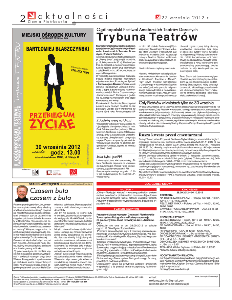 2 aktualności 27 września 2012 r Ziemia Piotrkowska Ogólnopolski Festiwal Amatorskich Teatrów Dorosłych Trybuna Teatrów Stanisława Celińska, będzie gościem specjalnym Ogólnopolskiego Festiwalu Amatorskich Teatrów Dorosłych „TrybunaTeatrów”. Aktorka zainauguruje festiwal recitalem pt. „Piękny świat”, już jutro (28 września, g. 19, bilety w cenie 30 zł). Festiwal potrwa do niedzieli, a na scenie zaprezentuje się łącznie osiem grup teatralnych z całej Polski, m.in. z Krakowa, Warszawy czy Białegostoku. W niedzielę, na zakończenie festiwalu, będzie można obejrzeć monodram w jednym akcie – „Przebiegum Życiae” z Bartłomiejem Błaszczyńskim w roli głównej i specjalnym udziałem Ireneusza Czopa. Sztukę oparto na motywach powieści Piotra Czerwińskiego „Kartonowa sieć”. Początek o godzinie 13.Wstęp na monodram oraz część konkursową jest wolny. Piotrkowianin Bartłomiej Błaszczyński pokaże się w naszym mieście po raz pierwszy. Urodził się w Piotrkowie 10 marca 1988 roku. Po ukończeniu SP Z Jagiełłą ruszą na Ujazd W niedziele wybieramy się w okolice m. Ujazd gdzie planujemy zwiedzic min. Park Edukacyjno-Rozrywkowy „Mikrokosmos”.Spotkanie o godz.9.00 na poarkingu przy ul. Narutowicza. Uczestnicy zostaną ubezpieczeni i otrzymają napoje.Zapraszamy osoby pełnoletnie. Wpisowe 5 zł (również na zbiórce). Organizator Fundacja Jagiełło. Inf również tel. 660 216 049 Jaka była i jest PPS Uniwersytet Jana Kochanowskiego Filia w Piotrkowie zaprasza na konferencję naukową pn. Polska Patia Socjalistyczna, a parlamentaryzm II RP. Rozpoczęcie nastąpi o godz. 10.30 w sali audytoryjnej nr 14, budynek „3”. Wstęp wolny. STANISŁAW STĘPIEŃ Na stronie teatru czytamy o nim m.in. Niewielu rówieśnikom trafia się taki zestaw w debiutanckim sezonie: Laertes w „Hamlecie”, Trieplew w „Mewie”. Przy czym Trieplew karkołomny: u Gietzky’ego w katowickim Śląskim ma to być jadowita parodia reżyserskiego przemądrzalca, z namaszczeniem cytującego Hegle, Artaudy i Lehmany. A aktor musi ten prześmiewczy miewicz, publicysta „Rzeczpospolitej” znany z dość chłodnego stosunku do noblisty. Jak by nie patrzeć, to trochę buty w tym było, podobnie jak w wypowiedzi Wałęsy dla Moniki Olejnik, że demonstrantów należy pałować, bo takie jest prawo, nawet związkowców z „Solidarności”. Minęło prawie albo i więcej niż ćwierć wieku i okazuje się, że teraz pałowanie przez służby porządkowe jest de mode. Jeszcze chwilę i dojdziemy do wniosku, że obecne pałowanie musi boleć mniej niż dawniej, bo jest demokratyczne, bo wówczas było w słusznej sprawie, a teraz protest to tylko fanaberią niezadowolonych. Jednak punkt wciąż widzenia zależy od punktu siedzenia. Nawet noblista Wałęsa też się czasem gubi. Albo może właśnie się odnazał w nowych czasach, kiedy już nic nie musi. A my musimy codziennie być w swoich butach. obrazek zgrać z jaką taką obroną wrażliwości rówieśnika, bez tego w ogóle nie byłoby warto zwracać na niego uwagi. Walczy konsekwentnie, celnie karykaturuje, ani przez chwilę nie obniża tonu.Ale na to finałowe spotkanie z Niną, które winno być emocjonalną przeciwwagą, trochę braknie mu siły. Warto patrzeć, co z nim będzie dalej. Teatr Śląski już dawno nie mógł pochwalić się tak bezbłędnym castingiem. W rolę Trieplewa wcielił się Bartłomiej Błaszczyński, który dołączył do zespołu aktorskiego przed zaledwie kilkoma miesiącami. Nowy „nabytek” to strzał w dziesiątkę i obietnica wielu znakomitych kreacji. Cały Piotrków w kwiatach tylko do 30 września W dniu 30 września 2012 r. upływa termin składania prac fotograficznych do 42 edycji konkursu „Cały Piotrków w kwiatach”, którego celem jest m.in.wieloaspektowa dokumentacja i prezentacja piotrkowskiej zieleni oraz piękna miejskich ogro.dów, rabat, balkonów mających znaczący wpływ na urodę naszego miasta, szczególnie ukazanych w połączeniu z charakterystycznymi miejscami i obiektami piotrkowskiej architektury, ulic, skwerów, ogródków osiedlowych. Konkurs ma charakter otwarty, udział w nim może wziąć każdy. Zaprasza Zarząd Towarzystwa Przyjaciół Piotrkowa Trybunalskiego. Rusza kwesta przed cmentarzami Zarząd Towarzystwa Przyjaciół Piotrkowa Trybunalskiego, wzorem lat ubiegłych, organizuje również w roku bieżącym w Dniu Święta Zmarłych (01.11.2012 r.) i w następujące po nim dni, tj.: piątek (02.11.2012), sobotę (03.11.2012 r.) i niedzielę (04.11.2012 r.) - kwestę przy bramach piotrkowskich cmentarzy, z której uzyskane środki pieniężne przeznaczane są na remonty i konserwację zabytkowych grobów na Starym Cmentarzu Rzymsko-Katolickim w naszym mieście. Zbiórka pieniędzy odbywać się będzie w dniach: 01 listopada ( czwartek) w godz. od 8,00 do 18,00, oraz w dniach 02 listopada ( piątek), 03 listopada (sobota), 04 listopada (niedziela) w godz. 10:00 – 17:00 przed bramami cmentarza. Biorąc pod uwagę ilość cennych nagrobków znajdujących się na naszych cmentarzach wymagających konserwacji, remontów itp., zachęcamy Piotrkowian do wsparcia naszych działań. Aby ułatwić kontakt z osobami chętnymi do kwestowania Zarząd Towarzystwa wyznaczył dyżury w siedzibie TPPT, a mianowicie w każdą środę i sobotę w godz. 15,30 – 16,30. CO?, GDZIE? KIEDY? [email protected] Czasem buta czasem z buta Pisałem przed tygodniem, że „potrzeba nam szybko nowej afery, abyśmy szybko zapomnieli o starej”. I pojawił się minister Gowin ze swoimi paragrafami w uszach czy za uszami oraz ciąg dalszy tożsamości ofiar katastrofy w Smoleńsku. Ktoś czegoś nie dopilnował i czy ważne jest teraz czy zamieniono ciała, numerki czy zamieniono trumny? Wałęsa przypomina, że postulował jedną wspólną mogiłę, skoro nie wiadomo dokładnie które zwłoki są kompletne itp. Zrobiono inaczej. Czasami aż się słuchać o tym ws