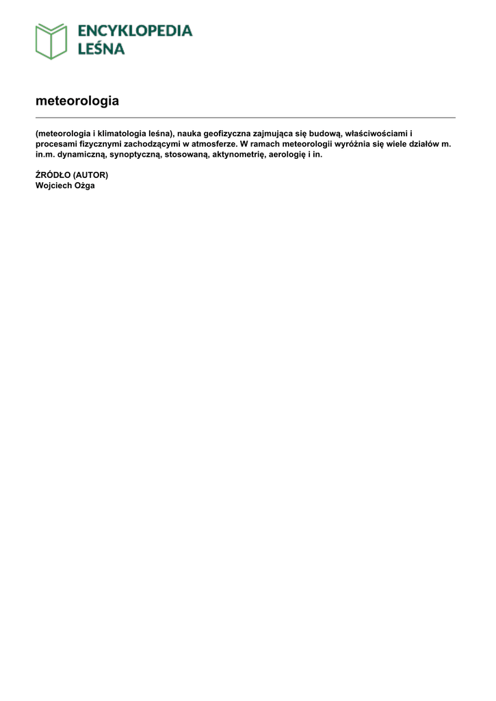 meteorologia (meteorologia i klimatologia leśna), nauka geofizyczna zajmująca się budową, właściwościami i procesami fizycznymi zachodzącymi w atmosferze. W ramach meteorologii wyróżnia się wiele działów m. in.m. dynamiczną, synoptyczną, stosowaną, aktynometrię, aerologię i in. ŹRÓDŁO (AUTOR) Wojciech Ożga