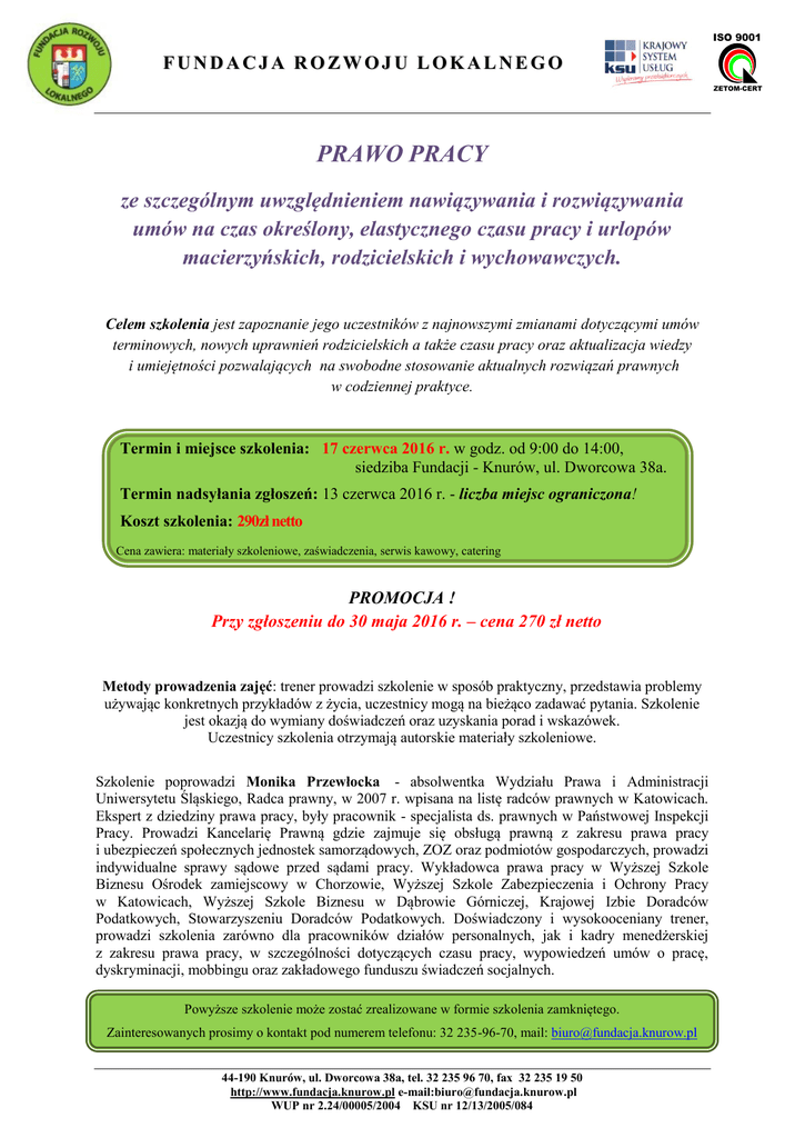 ISO 9001 FUNDACJA ROZWOJU LOKALNEGO ZETOM-CERT PRAWO PRACY ze szczególnym uwzględnieniem nawiązywania i rozwiązywania umów na czas określony, elastycznego czasu pracy i urlopów macierzyńskich, rodzicielskich i wychowawczych. Celem szkolenia jest zapoznanie jego uczestników z najnowszymi zmianami dotyczącymi umów terminowych, nowych uprawnień rodzicielskich a także czasu pracy oraz aktualizacja wiedzy i umiejętności pozwalających na swobodne stosowanie aktualnych rozwiązań prawnych w codziennej praktyce. Termin i miejsce szkolenia: 17 czerwca 2016 r. w godz. od 9:00 do 14:00, siedziba Fundacji - Knurów, ul. Dworcowa 38a. Termin nadsyłania zgłoszeń: 13 czerwca 2016 r. - liczba miejsc ograniczona! Koszt szkolenia: 290zł netto Cena zawiera: materiały szkoleniowe, zaświadczenia, serwis kawowy, catering PROMOCJA ! Przy zgłoszeniu do 30 maja 2016 r. – cena 270 zł netto Metody prowadzenia zajęć: trener prowadzi szkolenie w sposób praktyczny, przedstawia problemy używając konkretnych przykładów z życia, uczestnicy mogą na bieżąco zadawać pytania. Szkolenie jest okazją do wymiany doświadczeń oraz uzyskania porad i wskazówek. Uczestnicy szkolenia otrzymają autorskie materiały szkoleniowe. Szkolenie poprowadzi Monika Przewłocka - absolwentka Wydziału Prawa i Administracji Uniwersytetu Śląskiego, Radca prawny, w 2007 r. wpisana na listę radców prawnych w Katowicach. Ekspert z dziedziny prawa pracy, były pracownik - specjalista ds. prawnych w Państwowej Inspekcji Pracy. Prowadzi Kancelarię Prawną gdzie zajmuje się obsługą prawną z zakresu prawa pracy i ubezpieczeń społecznych jednostek samorządowych, ZOZ oraz podmiotów gospodarczych, prowadzi indywidualne sprawy sądowe przed sądami pracy. Wykładowca prawa pracy w Wyższej Szkole Biznesu Ośrodek zamiejscowy w Chorzowie, Wyższej Szkole Zabezpieczenia i Ochrony Pracy w Katowicach, Wyższej Szkole Biznesu w Dąbrowie Górniczej, Krajowej Izbie Doradców Podatkowych, Stowarzyszeniu Doradców Podatkowych. Doświadczony i wysokooceniany trener, prowadzi szkolenia zarówno dla pracowników działów personalnych, jak i kadry menedżerskiej z zakresu prawa pracy, w szczególności dotyczących czasu pracy, wypowiedzeń umów o pracę, dyskryminacji, mobbingu oraz zakładowego funduszu świadczeń socjalnych. Powyższe szkolenie może zostać zrealizowane w formie szkolenia zamkniętego. Zainteresowanych prosimy o kontakt pod numerem telefonu: 32 235-96-70, mail: [email protected] 44-190 Knurów, ul. Dworcowa 38a, tel. 32 235 96 70, fax 32 235 19 50 http://www.fundacja.knurow.pl e-mail:[email protected] WUP nr 2.24/00005/2004 KSU nr 12/13/2005/084 ISO 9001 FUNDACJA ROZWOJU LOKALNEGO ZETOM-CERT Program szkolenia: 1. Umowy pracownicze: umowa o pracę a umowa cywilnoprawna, nawiązanie stosunku pracy – rodzaje umów o pracę, rozwiązanie stosunku pracy, obowiązek wydania świadectwa pracy – świadectwo pracy po 2 latach, nowa umowa na czas określony i okres próbny. 2. Czas pracy. Rozliczanie czasu pracy: norma i wymiar czasu pracy, rozkład czasu pracy, okres rozliczeniowy, wydłużony okres rozliczeniowy do 12 miesięcy, praca w dobowych godzinach nadliczbowych i jej rekompensata, praca w średniotygodniowych godzinach nadliczbowych i jej rekompensata, elastyczny czas pracy, możliwość naruszenia doby pracowniczej, systemy czasu pracy. 3. Urlopy pracownicze: prawo do urlopu a wymiar urlopu, urlop osoby zatrudnionej w niepełnym wymiarze czasu pracy, urlop na żądanie, urlop macierzyński, urlop rodzicielski, zasady udzielania urlopu ojcowskiego, urlop wychowawczy. 4. Wynagrodzenie za pracę : ustalanie wynagrodzenia za pracę, ochrona wynagrodzenia, zasady potrącania z wynagrodzenia za pracę, inne świadczenia niż wynagrodzenie – obowiązkowe i fakultatywne. 44-190 Knurów, ul. Dworcowa 38a, tel. 32 235 96 70, fax 32 235 19 50 http://www.fundacja.knurow.pl e-mail:[email protected] WUP nr 2.24/00005/2004 KSU nr 12/13/2005/084 ISO 9001 FUNDACJA ROZWOJU LOKALNEGO ZETOM-CERT FORMULARZ ZGŁOSZENIOWY Niniejszym zgłaszam udział w szkoleniu z zakresu: Prawo pracy ze szczególnym uwzględnieniem nawiązania i rozwiązania umów na czas określony, elastycznego czasu pracy i urlopów macierzyńskich, rodzicielskich i wychowawczych. Imię i Nazwisko: Stanowisko: Nazwa instytucji: Adres Tel/fax: Adres e-mail: - 270,00 zł/os + 23% VAT (promocja do 30 maja 2016 r.) - 270,00 zł/os (promocja do 30 maja 2016 r.) zwolnienie z VAT dla opłacających szkolenie ze środków publicznych - 290,00 zł/os + 23% VAT - 290,00 zł/os zwolnienie z VAT dla opłacających szkolenie ze środków publicznych Podpis: Zgłoszenia można przesyłać faxem pod nr 32 235-19-50 lub na adres e-mail: [email protected] 44-190 Knurów, ul. Dworcowa 38a, tel. 32 235 96 70, fax 32 235 19 50 http://www.fundacja.knurow.pl e-mail:[email protected] WUP nr 2.24/00005/2004 KSU nr 12/13/2005/084 ISO 9001 FUNDACJA ROZWOJU LOKALNEGO ZETOM-CERT OŚWIADCZENIE Oświadczenie ma na celu możliwość zastosowania zwolnienia z podatku VAT zgodnie z art. 43 ust. 1 pkt 29 lit. c ustawy o podatku od towarów i usług z dnia 11 marca 2004 r. z późniejszymi zmianami. …………………………………………………………………………………………………………………………………………………….. (nazwa instytucji) Oświadczamy, że usługa szkoleniowa nabyta od Fundacji Rozwoju Lokalnego Tytuł szkolenia: Prawo pracy ze szczególnym uwzględnieniem nawiązania i rozwiązania umów na czas określony, elastycznego czasu pracy i urlopów macierzyńskich, rodzicielskich i wychowawczych Termin i miejsce realizacji: ................................................................................................................................ Imię i nazwisko uczestnika: ................................................................................................................................. ma c