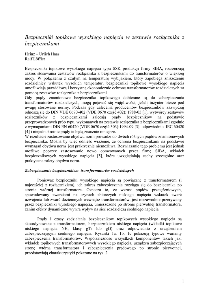 Bezpieczniki topikowe wysokiego napięcia w zestawie rozłącznika z bezpiecznikami Heinz – Urlich Haas Ralf Löffler Bezpieczniki topikowe wysokiego napięcia typu SSK produkcji firmy SIBA, rozszerzają zakres stosowania zestawów rozłącznika z bezpiecznikami do transformatorów o większej mocy. W połączeniu z czułym na temperaturę wybijakiem, który zapobiega zniszczeniu rozdzielnicy wskutek wysokich temperatur, bezpieczniki topikowe wysokiego napięcia umożliwiają prawidłową i korzystną ekonomicznie ochronę transformatorów rozdzielczych za pomocą zestawów rozłącznika z bezpiecznikami. Gdy prądy znamionowe bezpiecznika topikowego dobierane są do zabezpieczania transformatorów rozdzielczych, mogą pojawić się wątpliwości, jeżeli inżynier bierze pod uwagę stosowane normy. Podczas gdy zalecenia producentów bezpieczników zazwyczaj odnoszą się do DIN VDE 0670-402 (VDE 0670 część 402): 1988-05 [1], wytwórcy zestawów rozłączników z bezpiecznikami zalecają prądy bezpieczników na podstawie przeprowadzonych prób typu, wykonanych na zestawie rozłącznika z bezpiecznikami zgodnie z wymaganiami DIN EN 60420 (VDE 0670 część 303):1994-09 [3], odpowiednio IEC 60420 [4] i niejednokrotnie prądy te będą znacznie mniejsze. W rezultacie zastosowanie obydwu norm prowadzi do dwóch różnych prądów znamionowych bezpiecznika. Można by więc odnieść wrażenie, że ochrona bezpiecznikami na podstawie wymagań obydwu norm jest praktycznie niemożliwa. Rozwiązanie tego problemu jest jednak możliwe poprzez zastosowanie nowo opracowanych przez firmę SIBA, wkładek bezpiecznikowych wysokiego napięcia [5], które uwzględniają cechy szczególne oraz praktyczne zalety obydwu norm. Zabezpieczanie bezpiecznikiem transformatorów rozdzielczych Ponieważ bezpieczniki wysokiego napięcia są powiązane z transformatorem (i najczęściej z rozłącznikiem), ich zakres zabezpieczania rozciąga się do bezpiecznika po stronie wtórnej transformatora. Oznacza to, że wzrost prądów przetężeniowych, spowodowany zwarciami na szynach zbiorczych niskiego napięcia wskutek zwarć uzwojenia lub zwarć doziemnych wewnątrz transformatorów, jest niezawodnie przerywany przez bezpieczniki wysokiego napięcia, umieszczone po stronie pierwotnej transformatora, zanim efekty dynamiczne wywrą wpływ na sieć rozdzielczą średniego napięcia. Prądy i czasy zadziałania bezpieczników topikowych wysokiego napięcia są skoordynowane z transformatorem, bezpiecznikiem niskiego napięcia (wkładki topikowe niskiego napięcia NH, klasy gTr lub gG) oraz odpowiednio z urządzeniem zabezpieczającym średniego napięcia. Rysunki 1a, 1b, 1c pokazują typowe warianty zabezpieczenia transformatorów. Współzależność wszystkich komponentów takich jak: wkładek topikowych transformatorowych wysokiego napięcia, urządzeń zabezpieczających stronę wtórną transformatora i zabezpieczenia prądowego po stronie pierwotnej, przedstawiają charakterystyki pokazane na rys. 2. 1 Bezpiecznik topikowy wysokiego napięcia powinien spełniać następujące kryteria: • Bezpiecznik topikowy wysokiego napięcia powinien wytrzymać magnesujący prąd załączania transformatora (rys. 2, punkt A), który może mieć wartość od 6 do 20 razy większą od prądu znamionowego transformatora (w ciągu 0,1 s), zależnie od mocy transformatora. • Maksymalny prąd zwarciowy, określony na podstawie napięcia zwarcia transformatora uk musi być wyłączony w czasie dopuszczanym przez normę DIN 57532-5 (VDE 0532 część 5): 1985-05 [6]. • Bezpiecznik topikowy wysokiego napięcia musi być zdolny do przewodzenia w sposób ciągły prądu roboczego transformatora (prądu znamionowego transformatora). • Przy przeciążeniu transformatora do 150% (przeciążenie dozwolone) nie może być przekroczona dopuszczalna temperatura dla aparatury rozdzielczej. • Charakterystyka czasowo-prądowa, czasy i prąd zadziałania bezpiecznika topikowego wysokiego napięcia muszą być selektywne z bezpiecznikami topikowymi niskiego napięcia. Ewentualne punkty przecięcia obydwu charakterystyk prądowych mogą być zaakceptowane tylko powyżej maksymalnego prądu zwarciowego (rys. 2, punkt B). • Po stronie wysokiego napięcia transformatora musi być zachowana selektywność z zabezpieczeniem prądowym sieci zasilającej. Unikanie niepożądanych wysokich temperatur Wkładki topikowe wysokiego napięcia wyposażone są w wybijaki, które spełniają jednocześnie rolę wskaźników zadziałania. Wkładki te, umieszczone w zestawie rozłącznika z bezpiecznikami, dzięki wybijakom otwierają rozłącznik poprzez jego mechanizm wyzwalający i wyłączają wszystkie trzy fazy. W celu uniknięcia niepożądanych, wysokich temperatur w rozdzielnicy, wkładki topikowe wysokiego napięcia firmy SIBA, wyposażone są w zintegrowane wybijaki ograniczające temperaturę. Wysokie temperatury mogą wystąpić, na przykład wtedy, gdy bezpieczniki pracują w tzw. niedozwolonych zakresach, tzn. poniżej minimalnego prądu wyłączeniowego. Wyższe temperatury mogą także pojawiać się gdy wyładowanie atmosferyczne wpływa na wkładkę topikową. Rys.1. Transformator rozdzielczy z typowymi wariantami zabezpieczenia (a-c) 2 Zadziałanie wrażliwego na temperaturę wybijaka prowadzi do niezawodnego przerwania obwodu przez zestaw rozłącznika z bezpiecznikami, co zapobiega termicznemu uszkodzeniu rozdzielnicy [7]. Wkładki topikowe wysokiego napięcia zgodne z VDE 0670 część 402 Aby dobór wkładek topikowych stał się łatwiejszy dla użytkownika, charakterystyki czasowo-prądowe bezpieczników wysokiego napięcia zostały w roku 1988 ujednolicone w normie DIN VDE 0670-402 (VDE 0670 część 402): 1988-05 [1]. W zakresie między 10 milisekund a 10 sekund, zostały określone dolne i górne graniczne linie dla bezpieczników na poszczególne prądy znamionowe. W połączeniu z wyżej wymienionymi kryteriami dla bezpiec