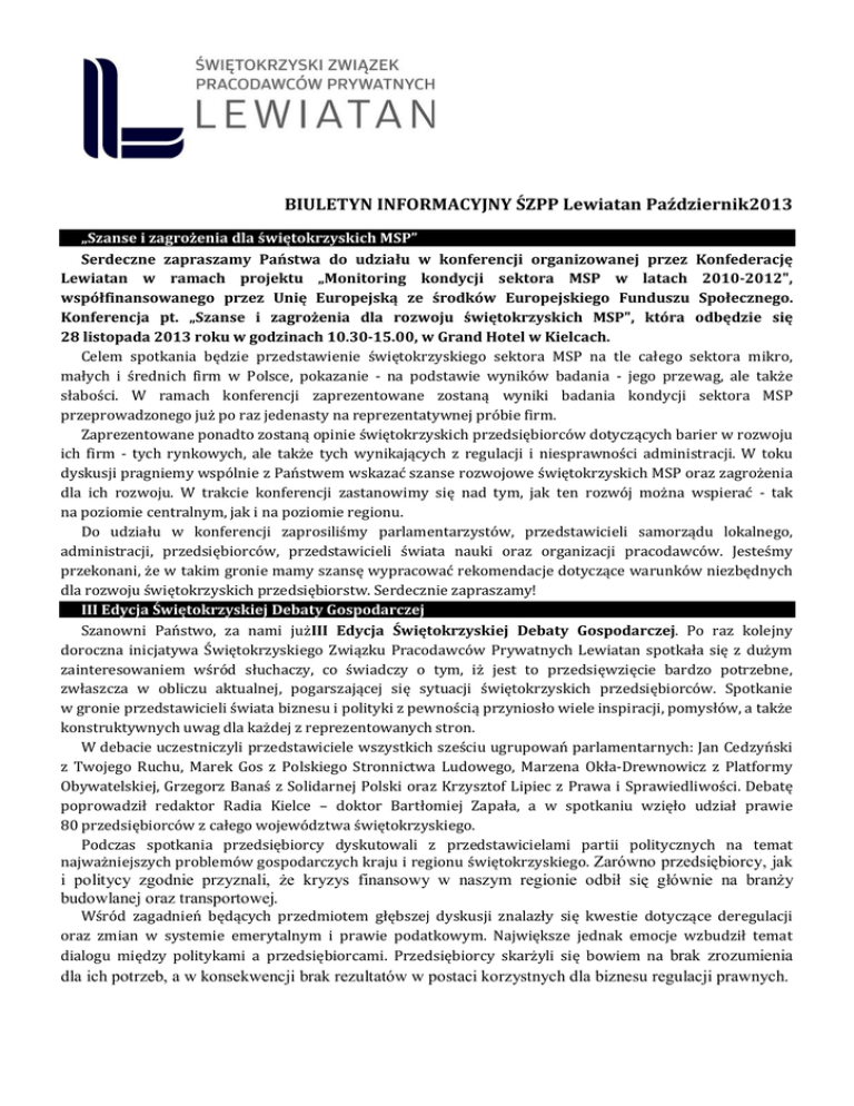 BIULETYN INFORMACYJNY ŚZPP Lewiatan Październik2013 „Szanse i zagrożenia dla świętokrzyskich MSP” Serdeczne zapraszamy Państwa do udziału w konferencji organizowanej przez Konfederację Lewiatan w ramach projektu „Monitoring kondycji sektora MSP w latach 2010-2012", współfinansowanego przez Unię Europejską ze środków Europejskiego Funduszu Społecznego. Konferencja pt. „Szanse i zagrożenia dla rozwoju świętokrzyskich MSP", która odbędzie się 28 listopada 2013 roku w godzinach 10.30-15.00, w Grand Hotel w Kielcach. Celem spotkania będzie przedstawienie świętokrzyskiego sektora MSP na tle całego sektora mikro, małych i średnich firm w Polsce, pokazanie - na podstawie wyników badania - jego przewag, ale także słabości. W ramach konferencji zaprezentowane zostaną wyniki badania kondycji sektora MSP przeprowadzonego już po raz jedenasty na reprezentatywnej próbie firm. Zaprezentowane ponadto zostaną opinie świętokrzyskich przedsiębiorców dotyczących barier w rozwoju ich firm - tych rynkowych, ale także tych wynikających z regulacji i niesprawności administracji. W toku dyskusji pragniemy wspólnie z Państwem wskazać szanse rozwojowe świętokrzyskich MSP oraz zagrożenia dla ich rozwoju. W trakcie konferencji zastanowimy się nad tym, jak ten rozwój można wspierać - tak na poziomie centralnym, jak i na poziomie regionu. Do udziału w konferencji zaprosiliśmy parlamentarzystów, przedstawicieli samorządu lokalnego, administracji, przedsiębiorców, przedstawicieli świata nauki oraz organizacji pracodawców. Jesteśmy przekonani, że w takim gronie mamy szansę wypracować rekomendacje dotyczące warunków niezbędnych dla rozwoju świętokrzyskich przedsiębiorstw. Serdecznie zapraszamy! III Edycja Świętokrzyskiej Debaty Gospodarczej Szanowni Państwo, za nami jużIII Edycja Świętokrzyskiej Debaty Gospodarczej. Po raz kolejny doroczna inicjatywa Świętokrzyskiego Związku Pracodawców Prywatnych Lewiatan spotkała się z dużym zainteresowaniem wśród słuchaczy, co świadczy o tym, iż jest to przedsięwzięcie bardzo potrzebne, zwłaszcza w obliczu aktualnej, pogarszającej się sytuacji świętokrzyskich przedsiębiorców. Spotkanie w gronie przedstawicieli świata biznesu i polityki z pewnością przyniosło wiele inspiracji, pomysłów, a także konstruktywnych uwag dla każdej z reprezentowanych stron. W debacie uczestniczyli przedstawiciele wszystkich sześciu ugrupowań parlamentarnych: Jan Cedzyński z Twojego Ruchu, Marek Gos z Polskiego Stronnictwa Ludowego, Marzena Okła-Drewnowicz z Platformy Obywatelskiej, Grzegorz Banaś z Solidarnej Polski oraz Krzysztof Lipiec z Prawa i Sprawiedliwości. Debatę poprowadził redaktor Radia Kielce – doktor Bartłomiej Zapała, a w spotkaniu wzięło udział prawie 80 przedsiębiorców z całego województwa świętokrzyskiego. Podczas spotkania przedsiębiorcy dyskutowali z przedstawicielami partii politycznych na temat najważniejszych problemów gospodarczych kraju i regionu świętokrzyskiego. Zarówno przedsiębiorcy, jak i politycy zgodnie przyznali, że kryzys finansowy w naszym regionie odbił się głównie na branży budowlanej oraz transportowej. Wśród zagadnień będących przedmiotem głębszej dyskusji znalazły się kwestie dotyczące deregulacji oraz zmian w systemie emerytalnym i prawie podatkowym. Największe jednak emocje wzbudził temat dialogu między politykami a przedsiębiorcami. Przedsiębiorcy skarżyli się bowiem na brak zrozumienia dla ich potrzeb, a w konsekwencji brak rezultatów w postaci korzystnych dla biznesu regulacji prawnych. „O biznesie przy kawie” na temat funduszy dla przedsiębiorców 24 października br. w Kawiarni Blikle w Kielcach przy Placu Artystów odbyło się kolejne z serii spotkań „O biznesie przy kawie”. Tym razem tematem przewodnim spotkania były fundusze europejskie skierowane dla przedsiębiorców w nowej perspektywie 2014-2020. Gośćmi specjalnymi spotkania byli: Kazimierz Kotowski – Członek Zarządu Województwa Świętokrzyskiego, Irena Sochacka – Dyrektor Departamentu Funduszy Strukturalnych Urzędu Marszałkowskiego, Jolanta Zwierzchowska – Z-ca Dyrektora Departamentu Polityki Regionalnej Urzędu Marszałkowskiego, Tomasz Janusz – Z- ca Dyrektora Departamentu Polityki Regionalnej Urzędu Marszałkowskiego oraz Krzysztof Kobryń – Prezes Zarządu Funduszu Pożyczkowego Województwa Świętokrzyskiego. Przedmiotem spotkania było omówienie kluczowych dla przedsiębiorców tematów dotyczących funduszy europejskich i procedur wyłaniania zwycięzców w konkursach w kontekście perspektywy 2014-2020. Przedsiębiorcy postulowali głównie za skoncentrowaniem środków na wsparciu przedsiębiorców, stworzeniem klarownego i czytelnego katalogu nazw działań w ramach powstającego RPO oraz za stworzeniem mechanizmów budowy bardziej zaawansowanej gospodarki na terenie województwa świętokrzyskiego. Ponadto poruszone zostały również kwestie usprawnienia procedury konkursowej, uściślenia kwot przyporządkowanych do poszczególnych celów tematycznych oraz zasadności i efektywności dotychczas wydatkowanych środków. Podsumowując spotkanie uczestnicy zgodnie odnieśli się do kwestii potrzeby przeprowadzenia warsztatów dla przedsiębiorców zainteresowanych uzyskaniem dofinansowania w przyszłej perspektywie finansowej, konsultacji harmonogramów konkursów, współpracy przy tworzeniu katalogu kryteriów wyboru projektów oraz możliwości aplikowania za pomocą internetowych narzędzi. Konieczne zmiany w zamówieniach publicznych Poselski projekt nowelizacji Prawa zamówień publicznych został bardzo dobrze oceniony w ramach konsultacji społecznych i uzyskał pozytywną opinię biura analiz Sejmu. Konfederacja Lewiatan uważa, że może poprawić sytuację na rynku zamówień publicznych. Zaproponowane w nim zwiększenie obowiązków Prezesa Urzędu Zamówień Publicznych i Rady Ministrów 