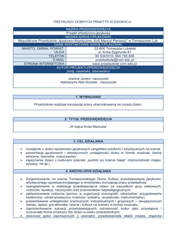 PRZYKŁADY DOBRYCH PRAKTYK W EDUKACJI NAZWA PRZEDSIĘWZIĘCIA Projekt artystyczno-językowy NAZWA SZKOŁY/PLACÓWKI Niepubliczne Przedszkole Językowo-Artystyczne „Król Maciuś Pierwszy” w Tomaszowie Lub. DANE KONTAKTOWE SZKOŁY/PLACÓWKI MIASTO, GMINA, POWIAT, 22-600 Tomaszów Lubelski ULICA ul. Króla Zygmunta 61 TELEFON 84 5341010, 600 755 605 E-MAIL [email protected] STRONA INTERNETOWA www.przedszkole.com.edu.pl AUTOR PROJEKTU/PRZEDSIĘWZIĘCIA (imię, nazwisko, stanowisko) Joanna Joniec- nauczyciel Aleksandra Rak-Gozdek - nauczyciel 1. WYMAGANIE Przedszkole realizuje koncepcję pracy ukierunkowaną na rozwój dzieci. 2. TYTUŁ PRZEDSIĘWZIĘCIA „W bajce Króla Maciusia” 3. CEL DZIAŁANIA rozwijanie u dzieci sprawności językowych (angielsko-polskich) i artystycznych na scenie, prezentacja językowych i artystycznych umiejętności dzieci w formie musicalu (tańce etniczne, dworskie, nowoczesne) zapoznanie dzieci z kulturami poprzez „podróż po krainie bajek” (różnorodność miejsc, sytuacji, ról itp.) 4. KRÓTKI OPIS DZIAŁANIA Zorganizowanie na scenie Tomaszowskiego Domu Kultury przedsięwzięcia językowoartystycznego upowszechniającego w środowisku koncepcję pracy przedszkola; zaangażowanie w realizację przedsięwzięcia dzieci ze wszystkich grup wiekowych, rodziców, dyrekcji, nauczycieli oraz pracowników niepedagogicznych; zaktywizowanie rodziców (pomoc w organizacji scenografii, rekwizytów, przygotowanie kostiumów, udział artystyczny rodziców: wokalny, recytatorski, instrumentalny); prezentowanie umiejętności scenicznych: indywidualnych i grupowych – dwujęzycznych (taniec, śpiew, gra aktorska, obycie i kultura na scenie) w formie musicalu; zaprezentowanie sytuacji przedstawiających odmienność kultur jako przystępna i zrozumiała forma przekazu dla dzieci w wieku przedszkolnym; obecność gości zaproszonych z zewnątrz: przedstawiciele władz miasta, organów współpracujących z przedszkolem, absolwentów i rodziców. 5. EFEKTY Promocja koncepcji i dorobku placówki w środowisku lokalnym i mediach, uściślenie współpracy przedszkola z władzami miasta oraz środowiskiem lokalnym i rodzicami, ukazanie możliwości językowo-artystycznych grupowych, wyłonienie talentów indywidualnych: język angielski, taniec, śpiew, gra aktorska, recytacja, aktywizowanie dzieci oraz zapewnienie o sukcesie indywidualnym i grupowym, wywołanie pozytywnych emocji związanych z odgrywaniem sytuacji bajkowych. 6. RADY I PRZESTROGI Warto zadbać o: zaangażowanie wszystkich dzieci, rodziców, nauczycieli oraz pracowników przedszkola – powszechne uświadomienie celów i zadań realizowanych w projekcie, utrwalanie wybranych elementów przedstawienia w czasie zajęć dydaktycznych, oswojenie dzieci z tremą sceniczną - częste próby w docelowym miejscu, umożliwienie dzieciom pozytywnej swobody w działaniu podczas występu, prawidłową organizację (odpowiednie rozłożenie w czasie, przydzielenie ról osobom zaangażowanym). SPOSOBY UPOWSZECHNIANIA bogata informacja umieszczona na stronie WWW, galeria na profilu społecznościowym „Facebook”, notatka w prasie lokalnej, przekazanie rodzicom i zainteresowanym osobom płyt DVD z przedsięwzięcia, zaproszenie przedstawicieli władz miasta i organów współpracujących z przedszkolem oraz absolwentów i rodziców.