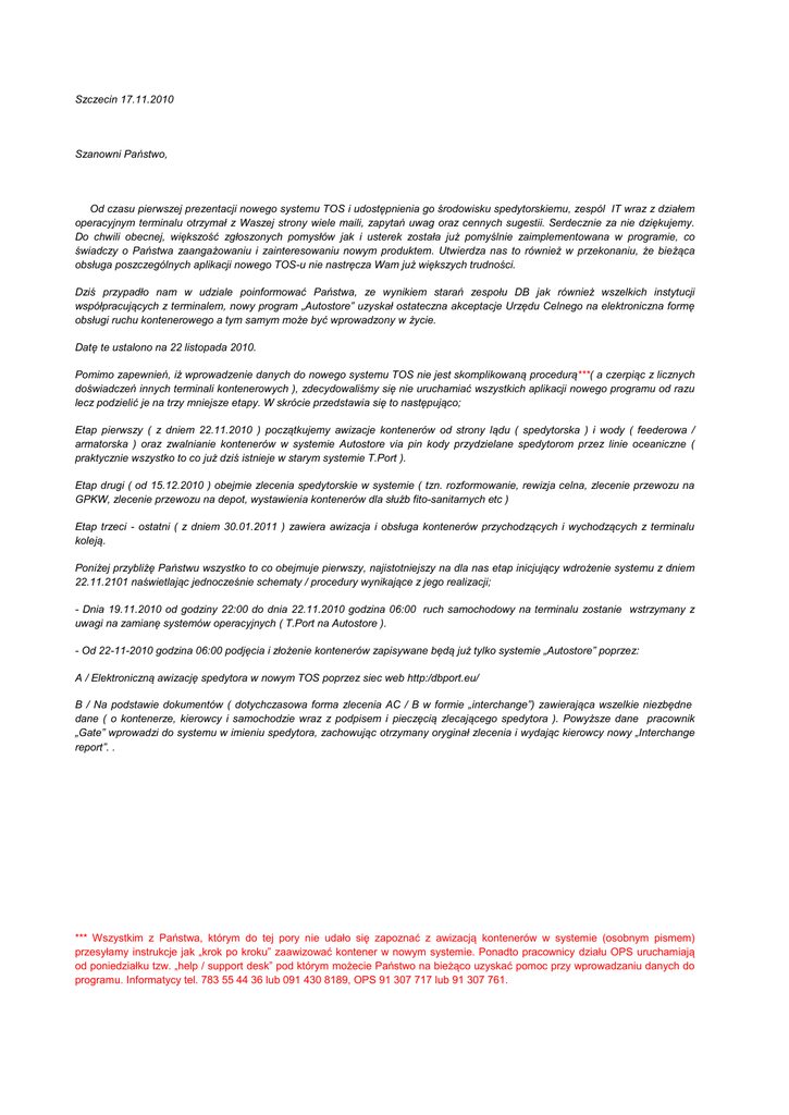 Szczecin 17.11.2010 Szanowni Państwo, Od czasu pierwszej prezentacji nowego systemu TOS i udostępnienia go środowisku spedytorskiemu, zespól IT wraz z działem operacyjnym terminalu otrzymał z Waszej strony wiele maili, zapytań uwag oraz cennych sugestii. Serdecznie za nie dziękujemy. Do chwili obecnej, większość zgłoszonych pomysłów jak i usterek została już pomyślnie zaimplementowana w programie, co świadczy o Państwa zaangażowaniu i zainteresowaniu nowym produktem. Utwierdza nas to również w przekonaniu, że bieżąca obsługa poszczególnych aplikacji nowego TOS-u nie nastręcza Wam już większych trudności. Dziś przypadło nam w udziale poinformować Państwa, ze wynikiem starań zespołu DB jak również wszelkich instytucji współpracujących z terminalem, nowy program „Autostore” uzyskał ostateczna akceptacje Urzędu Celnego na elektroniczna formę obsługi ruchu kontenerowego a tym samym może być wprowadzony w życie. Datę te ustalono na 22 listopada 2010. Pomimo zapewnień, iż wprowadzenie danych do nowego systemu TOS nie jest skomplikowaną procedurą***( a czerpiąc z licznych doświadczeń innych terminali kontenerowych ), zdecydowaliśmy się nie uruchamiać wszystkich aplikacji nowego programu od razu lecz podzielić je na trzy mniejsze etapy. W skrócie przedstawia się to następująco; Etap pierwszy ( z dniem 22.11.2010 ) początkujemy awizacje kontenerów od strony lądu ( spedytorska ) i wody ( feederowa / armatorska ) oraz zwalnianie kontenerów w systemie Autostore via pin kody przydzielane spedytorom przez linie oceaniczne ( praktycznie wszystko to co już dziś istnieje w starym systemie T.Port ). Etap drugi ( od 15.12.2010 ) obejmie zlecenia spedytorskie w systemie ( tzn. rozformowanie, rewizja celna, zlecenie przewozu na GPKW, zlecenie przewozu na depot, wystawienia kontenerów dla służb fito-sanitarnych etc ) Etap trzeci - ostatni ( z dniem 30.01.2011 ) zawiera awizacja i obsługa kontenerów przychodzących i wychodzących z terminalu koleją. Poniżej przybliżę Państwu wszystko to co obejmuje pierwszy, najistotniejszy na dla nas etap inicjujący wdrożenie systemu z dniem 22.11.2101 naświetlając jednocześnie schematy / procedury wynikające z jego realizacji; - Dnia 19.11.2010 od godziny 22:00 do dnia 22.11.2010 godzina 06:00 ruch samochodowy na terminalu zostanie wstrzymany z uwagi na zamianę systemów operacyjnych ( T.Port na Autostore ). - Od 22-11-2010 godzina 06:00 podjęcia i złożenie kontenerów zapisywane będą już tylko systemie „Autostore” poprzez: A / Elektroniczną awizację spedytora w nowym TOS poprzez siec web http:/dbport.eu/ B / Na podstawie dokumentów ( dotychczasowa forma zlecenia AC / B w formie „interchange”) zawierająca wszelkie niezbędne dane ( o kontenerze, kierowcy i samochodzie wraz z podpisem i pieczęcią zlecającego spedytora ). Powyższe dane pracownik „Gate” wprowadzi do systemu w imieniu spedytora, zachowując otrzymany oryginał zlecenia i wydając kierowcy nowy „Interchange report”. . *** Wszystkim z Państwa, którym do tej pory nie udało się zapoznać z awizacją kontenerów w systemie (osobnym pismem) przesyłamy instrukcje jak „krok po kroku” zaawizować kontener w nowym systemie. Ponadto pracownicy działu OPS uruchamiają od poniedziałku tzw. „help / support desk” pod którym możecie Państwo na bieżąco uzyskać pomoc przy wprowadzaniu danych do programu. Informatycy tel. 783 55 44 36 lub 091 430 8189, OPS 91 307 717 lub 91 307 761. Schematy postępowania w ruchu kontenerowym na terminalu; A/ Procedura „zlozenia kontenerow”: 1) Wjeżdżając na plac buforowy kierowca kieruje się na pas oznaczony białymi literami BK 2) Po dotarciu do „oznaczonej linii zatrzymania” lub ewentualnego ustawieniu się w kolejce tracków kierowca zgłasza się na Gate do operatora. 3) Jeżeli kierowca i kontener zostali zaawizowani przez spedytora elektronicznie w systemie Autostore, ciągnik podjeżdża do kontroli pod budynek Gate w miejsce oznaczone do kontroli stanu kontenera. 4) Jeżeli kontener i kierowca nie zostali zaawizowani, kierowca przedstawia dokument złożenia ( dotychczasowe zlecenie AC/B ) i zostaje wpisany do systemu Autostore po czym podjeżdża do kontroli pod budynek Gate w miejsce oznaczone do kontroli stanu kontenera. 5) Podczas kontroli kontenera kierowca zobowiązany jest udostępnić kontener do sprawdzenia jego cech zewnętrznych a w przypadku pustych kontenerów ich otwarcia w celu stwierdzenia stanu wnętrza ( Interchange na puste dokonywany będzie na Gate jak ma to miejsce na innych terminalach a nie na Depot kontenerowym ) 6) Po kontroli stanu kontenera kierowca otrzyma dwie kopie „Interchange report” ( nowa forma widoczna dla Was w programie ) co jest równoznaczne z potwierdzeniem złożenia kontenera na terminalu ( do podpisu kierowcy ) oraz numer CAB, który jest jednocześnie jego identyfikatorem na terenie portu. Kierowca wskazuje się miejsce ( blok, sektor widoczny na interchange ), w które ma pojechać w celu dokonania operacji przeładunkowych. 7) Kierowca pokazuje numer CAB pracownikowi firmy Komandos i na tej podstawie zostaje wpuszczony na teren portu. Jeżeli przed złożeniem kontenera zaistnieje konieczność skanowania - kierowca udaje się do skanera UC 8) Po dojechaniu w miejsce, w którym mają być dokonane operacje przeładunkowe kierowca jest zobowiązany pokazać operatorowi RS lub RTG numer CAB, który otrzymał na Gate-cie ( tzn suwnica RTG lub reachstacker identyfikuje ciagnik kontenerowy i kierowcę ) poprzez numer CAB umieszczony za szyba ). 9) Po złożeniu kontenera na placu kierowca bezzwłocznie udaje się do Gate celem zdania numeru CAB i opuszcza teren terminalu / portu. B/ Procedura postępowania dla „podjęć kontenerowych”: 1) Wjeżdżając na plac buforowy kierowca kieruje się na pas oznaczony białymi literami BK 2) Po dojechaniu do linii bezwzględnego zatrzymania lub ust