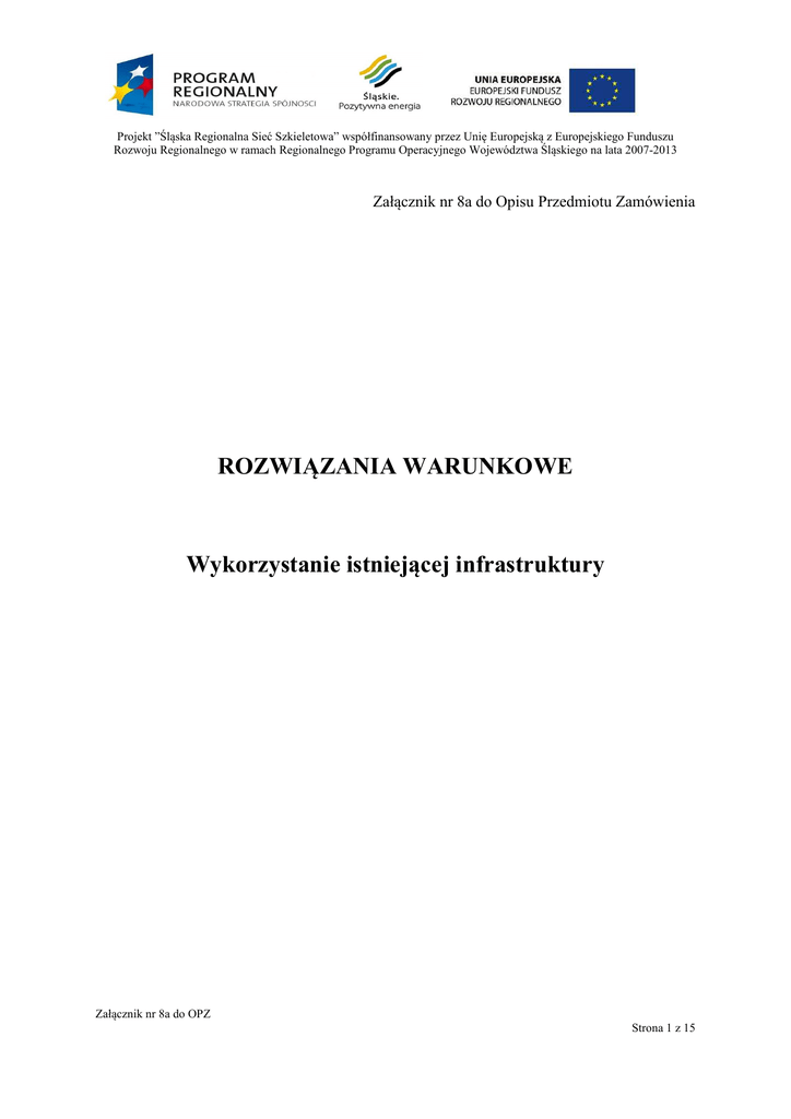 Projekt ”Śląska Regionalna Sieć Szkieletowa” współfinansowany przez Unię Europejską z Europejskiego Funduszu Rozwoju Regionalnego w ramach Regionalnego Programu Operacyjnego Województwa Śląskiego na lata 2007-2013 Załącznik nr 8a do Opisu Przedmiotu Zamówienia ROZWIĄZANIA WARUNKOWE Wykorzystanie istniejącej infrastruktury Załącznik nr 8a do OPZ Strona 1 z 15 Projekt ”Śląska Regionalna Sieć Szkieletowa” współfinansowany przez Unię Europejską z Europejskiego Funduszu Rozwoju Regionalnego w ramach Regionalnego Programu Operacyjnego Województwa Śląskiego na lata 2007-2013 SPIS TREŚCI 1) Model bazowy .................................................................................................................... 3 2) Model warunkowy związany z Pozyskaniem istniejącej Infrastruktury ............................ 3 3) Rozwiązanie równoważne- mikrokanalizacja światłowodowa .......................................... 5 4) Wymagania szczegółowe dla mikrorurek........................................................................... 6 5) Zalecana konstrukcja mikrorurki ze standardową ścianką ................................................. 7 6) Wymagania dodatkowe dla mikrorurek wzmacnianych .................................................... 8 7) Wymagania dodatkowe dla mikrorurek budynkowych ...................................................... 8 8) Elementy i akcesoria połączeniowe mikrorurek – wymagania ogólne .............................. 9 9) Wymagania dla złączek i zatyczek mikrorurek .................................................................. 9 10) Wymagania szczegółowe dotyczące mikrokabli światłowodowych ............................ 10 Załącznik nr 8a do OPZ Strona 2 z 15 Projekt ”Śląska Regionalna Sieć Szkieletowa” współfinansowany przez Unię Europejską z Europejskiego Funduszu Rozwoju Regionalnego w ramach Regionalnego Programu Operacyjnego Województwa Śląskiego na lata 2007-2013 Zamawiający dopuszcza zastosowanie rozwiązań warunkowych w stosunku do modelu bazowego. 1) Model bazowy Bazowym modelem realizacji inwestycji jest zaprojektowanie i wybudowanie nowego 4-otworowego rurociągu ułożonego w ziemi, wybudowanie węzłów szkieletowych typu A i szkieletowych typu B, adaptacja pomieszczeń dla tych węzłów, wybudowanie kabli światłowodowych i zakończenie ich na przełącznicach. Parametry funkcjonalnoużytkowe i zasady wykonania i odbioru prac dla tego modelu zostały określone w OPZ i PFU. Zamawiający dopuszcza jednak również zastosowanie rozwiązań warunkowych opisanych poniżej. 2) Model warunkowy związany z pozyskaniem istniejącej infrastruktury W wyniku wykorzystania pozyskanej infrastruktury muszą zostać zachowane podstawowe wymagania funkcjonalno-użytkowe wybudowanej sieci, do których należą: - zapewnienie funkcjonalności sieci nie gorszej niż opisana w PFU, tj. kanalizacja RHDPE 4 otworowa w tym jedna rura wypełniona światłowodem min 72J.; zapewnienie technologii światłowodowej; zapewnienie instalacji węzłów telekomunikacyjnych w miejscowościach wyszczególnionych w Programie Funkcjonalno-Użytkowym. Zamawiający dopuszcza rozwiązania warunkowe w stosunku do modelu bazowego w zakresie zapewnienia teletechnicznej kanalizacji 4-otworowej na całej długości sieci, polegające na wykorzystaniu pozyskanej w formie zakupu lub dzierżawy lub innej formie trwałego korzystania : - istniejącej infrastruktury teletechnicznej składającej się z 4 rur HDPE, które posiadają średnicę zewnętrzną 40 mm i grubości ścianek: 3,7 mm; - istniejącej infrastruktury teletechnicznej zapewniającej instalację mikrokanalizacji o pojemności minimum 4 mikrorurek. Możliwe jest pozyskanie kanalizacji bez mikroruek – Wykonawca odpowiada za ich wprowadzenie do rurociągu lub pozyskanie kanalizacji wypełnionej mikrorurkami. Wymagane jest zapewnienie mikrorurek o parametrach umożliwiających wbudowanie kabli światłowodowych o pojemności min 72J każda. Pozyskana rura ma zostać w całości zapełniona mikrokanalizacją. Warunkowe wykorzystanie Pozyskanej Infrastruktury musi być zastosowane na całej długości relacji międzywęzłowej lub (od studni kablowej do studni kablowej). Połączenie rozwiązań bazowego i pozyskanej infrastruktury Wykonawca wykona w studni kablowej lub zasobniku. Załącznik nr 8a do OPZ Strona 3 z 15 Projekt ”Śląska Regionalna Sieć Szkieletowa” współfinansowany przez Unię Europejską z Europejskiego Funduszu Rozwoju Regionalnego w ramach Regionalnego Programu Operacyjnego Województwa Śląskiego na lata 2007-2013 Przesłankami do wykorzystania Pozyskania infrastruktury będzie wystąpienie łącznie czynników: - Uzyskanie równoważności funkcjonalnej zastosowanego rozwiązania pozwalające na zaciągnięcie minimum 4 kabli światłowodowych o pojemności min 72J każdy do 4 rurek (średnica rurek musi być dostosowana do planowanych przekroi kabli światłowodowych); - Przesłanka ekonomiczna – niższy koszt inwestycji oraz eksploatacji, przy czym za koszt pozyskania infrastruktury uznaje się: a) w przypadku nabycia własności – pełną wartość w tym cenę brutto nabycia oraz wszelkie związane z tą ceną obciążenia publicznoprawne oraz wszelkie inne wydatki bezpośrednio związane z nabyciem jakie musi ponieść Zamawiający b) w przypadku dzierżawy lub innej formy trwałego korzystania – pełną wartość czynszu lub innej odpowiedniej opłaty brutto za cały okres umówionej dzierżawy lub innej formy korzystania - Przesłanka funkcjonalna – wykorzystanie istniejącej infrastruktury musi obejmować całe relacje międzywęzłowe lub między studniami kablowym; - Istniejąca infrastruktura pozyskana w formie zakupu musi być nie starsza niż 5 lat; - Infrastruktura musi zapewnić funkcjonalność sieci przez okres minimum 25 lat. W celu warunkowego wykorzystania Pozyskanej infrastruktury Wykonawca przedstaw