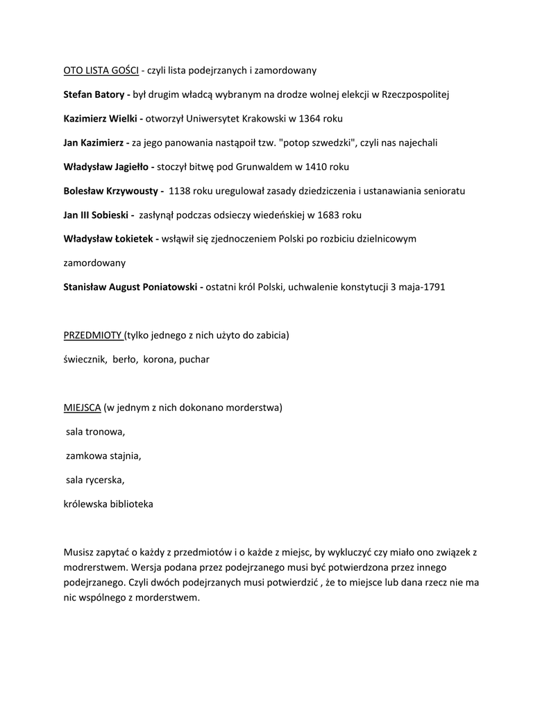OTO LISTA GOŚCI - czyli lista podejrzanych i zamordowany Stefan Batory - był drugim władcą wybranym na drodze wolnej elekcji w Rzeczpospolitej Kazimierz Wielki - otworzył Uniwersytet Krakowski w 1364 roku Jan Kazimierz - za jego panowania nastąpoił tzw. "potop szwedzki", czyli nas najechali Władysław Jagiełło - stoczył bitwę pod Grunwaldem w 1410 roku Bolesław Krzywousty - 1138 roku uregulował zasady dziedziczenia i ustanawiania senioratu Jan III Sobieski - zasłynął podczas odsieczy wiedeńskiej w 1683 roku Władysław Łokietek - wsłąwił się zjednoczeniem Polski po rozbiciu dzielnicowym zamordowany Stanisław August Poniatowski - ostatni król Polski, uchwalenie konstytucji 3 maja-1791 PRZEDMIOTY (tylko jednego z nich użyto do zabicia) świecznik, berło, korona, puchar MIEJSCA (w jednym z nich dokonano morderstwa) sala tronowa, zamkowa stajnia, sala rycerska, królewska biblioteka Musisz zapytać o każdy z przedmiotów i o każde z miejsc, by wykluczyć czy miało ono związek z modrerstwem. Wersja podana przez podejrzanego musi być potwierdzona przez innego podejrzanego. Czyli dwóch podejrzanych musi potwierdzić , że to miejsce lub dana rzecz nie ma nic wspólnego z morderstwem.