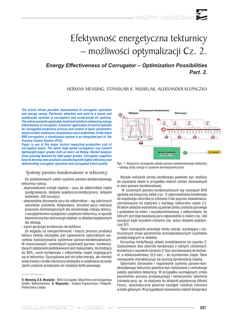 MASZYNY I URZĄDZENIA Efektywność energetyczna tekturnicy – możliwości optymalizacji Cz. 2. Energy Effectiveness of Corrugator – Optimization Possibilities Part. 2. Herman Mensing, Stanisław K. Musielak, Aleksander Klepaczka The article shows possible improvement of corrugator operation and energy saving. Particular attention was paid to a steam and condensate systems in corrugators and compressed air systems. The article presents applicable technical solutions enhancing energy effectiveness of corrugator. A need for application of control systems for corrugated production process and control of basic parameters based on their continuous visualization were underlined. In the latest BHS corrugators, a visualization system is an integrated part of the Process Control System (PCS). Paper is one of the major factors impacting production cost of corrugated board. The latest high-speed corrugators can convert lightweight paper grades both as liners ad fluting. Market analysis show growing demand for light paper grades. Corrugator suppliers have to develop new solutions considering both higher efficiency and deteriorating corrugator operation and corrugated board quality. Systemy parowo-kondensatowe w tekturnicy Do podstawowych zadań systemu parowo-kondensatowego tekturnicy należą: - doprowadzanie energii cieplnej – pary do odbiorników ciepła (podgrzewacze, sklejarki pojedyncze,kondycjonery, sklejarki podwójne, stół suszący), - odpowiednie dozowanie pary do odbiorników – wg założonych warunków (ciśnienie, temperatura, strumień pary) realizacji procesów technologicznych dla określonego rodzaju tektury, z uwzględnieniem wydajności i prędkości tekturnicy, w sposób ekonomiczny bez strat energii cieplnej i w układzie bezpiecznym dla obsługi, - zwrot gorącego kondensatu do kotłowni. Ze względu na energochłonność i koszty procesu produkcji tektury falistej niezbędne jest zapewnienie optymalnych warunków funkcjonowania systemów parowo-kondensatowych. W nowoczesnych, zamkniętych systemach parowo- kondensatowych założeniem podstawowym jest maksymalny, dochodzący do 90%, zwrot kondensatu z odbiorników ciepła znajdujących się w tekturnicy. Oszczędzana jest nie tylko energia, ale również woda świeża i środki chemiczne niezbędne w uzdatnianiu tej wody zanim zostanie przekazana do instalacji kotła parowego. H. Mensing, S.K. Musielak – BHS-Corrugated .Maschinen und Anlagenbau GmBH, Weiherhammer; A. Klepaczka – Instytut Papiernictwa i Poligrafii, Politechnika Łódzka PRZEGLĄD PAPIERNICZY · 68 · CZERWIEC 2012 Rys. 1. Klasyczne rozwiązanie układu parowo-kondensatowego tekturnicy – istnieją straty energii w systemie termodynamicznym Wysoki wskaźnik zwrotu kondensatu powinien być możliwy do uzyskania nawet w przypadku niskich ciśnień stosowanych w sieci parowo-kondensatowej. W systemach parowo-kondensatowych wg rozwiązań BHS spotyka się klasyczny układ (rys. 1) odprowadzania kondensatu do wspólnego zbiornika (o ciśnieniu 5 bar poprzez odwadniacze, zainstalowane na odpływie z każdego odbiornika ciepła (1). W takim układzie wydzielone są jednak strefy zasilania parowego z podziałem na nisko- i wysokociśnieniową, z odbiornikami, do których jest doprowadzana para odpowiednio o niskim (np. stół suszący) bądź wysokim ciśnieniu (np. walce sklejarki pojedynczej SF). Takie rozwiązanie powoduje straty energii, wynikające z wymuszonych zmian parametrów termodynamicznych czynników przepływających w układzie. Korzystną modyfikację układu przedstawiono na rysunku 2. Zastosowano dwa zbiorniki kondensatu o różnych ciśnieniach. Kondensat o wysokim ciśnieniu (7 bar) jest kierowany do kotłowni, a niskociśnieniowy (0,5 bar) – do wymiennika ciepła .Takie rozwiązanie charakteryzuje się wyższą sprawnością cieplną. Optymalne sterowanie i regulowanie systemu parowo-kondensatowego tekturnicy powinno być realizowane z centralnego pulpitu operatora tekturnicy. W przypadku wymaganych zmian parametrów procesu produkcyjnego i konieczności obniżenia ciśnienia pary, np. na dopływie do sklejarki pojedynczej (Modul Facer), automatycznie powinna nastąpić redukcja ciśnienia w kotle głównym. W przypadkach stosowania niskich temperatur 331 MASZYNY I URZĄDZENIA Rys. 2. Układ parowo-kondensatowy tekturnicy. Rozdział linii kondensatów o różnych ciśnieniach poprawia sprawność cieplną całego układu Rys. 3. Porównanie kosztów eksploatacj pomp kleju zasilanych pneumatycznie i elektrycznie Funkcjonowanie i utrzymanie eksploatacyjne stacji sprężarek jest energochłonne i kosztowne. Szczególnie nieekonomiczne są takie odbiorniki energii w systemie tekturnicy, jak zasilane powietrzem klasyczne membranowe pompy w obiegach kleju dostarczanego do sklejarek. Wymiana ich na pompy ślimakowe z elektronicznym sterowaniem zapewnia uzyskanie wymiernych efektów ekonomicznych. Wynikają one z rozwiązania technicznego, zastosowanego w nowoczesnych pompach ślimakowych, obniżającego tzw. „siły nożycowe”. Obniżenie tych sił nie powoduje pogorszenia parametrów reologicznych stosowanego kleju. Jego lepkość nie ulega zmianie. Na rysunku 3 przedstawiono porównanie kosztów eksploatacji pomp klejowych z zasilaniem pneumatycznym i elektrycznym. Wymierne efekty ekonomiczne może spowodować zredukowanie liczby cyklów załączania i wyłączania sprężarek. Istotny jest właściwy dobór pojemności zbiorników akumulujących sprężone powietrze. Zbiorniki o większej pojemności sprężonego powietrza są zdecydowanie lepsze, płynnie reagują np. na gwałtowne obciążenie sieci. Ciśnienie w zbiornikach i sieci sprężonego powietrza powino być redukowane do wartości 6,5-7 bar. Obniżenie ciśnienia o 1 bar powoduje oszczędności energii w układzie o ok. 6%. Aby uzyskać energooszczędną eksploatację sieci sprężonego powietrza zaleca się m.in.: • stosowanie wysokiego wskaźnika obciążenia sieci, 