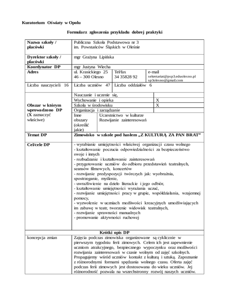 Kuratorium Oświaty w Opolu Formularz zgłoszenia przykładu dobrej praktyki Nazwa szkoły / placówki Publiczna Szkoła Podstawowa nr 3 im. Powstańców Śląskich w Oleśnie Dyrektor szkoły / placówki Koordynator DP Adres mgr Grażyna Lipińska Liczba nauczycieli 16 Obszar w którym wprowadzono DP (X zaznaczyć właściwe) Temat DP Cel/cele DP koncepcja zmian mgr Justyna Wiecha ul. Krasickiego 25 Tel/fax 46 – 300 Olesno 34 35828 92 e-mail [email protected] [email protected] Liczba uczniów 47 Liczba oddziałów 6 Nauczanie i uczenie się, Wychowanie i opieka X Szkoła w środowisku X Organizacja i zarządzanie Inne Uczestnictwo w kulturze obszary Rozwijanie zainteresowań (określić jakie) Zimowisko w szkole pod hasłem „Z KULTURĄ ZA PAN BRAT” - wyrabianie umiejętności właściwej organizacji czasu wolnego - kształtowanie poczucia odpowiedzialności za bezpieczeństwo swoje i innych - rozbudzanie i kształtowanie zainteresowań - przygotowanie uczniów do odbioru przedstawień teatralnych, seansów filmowych, koncertów - rozwijanie predyspozycji twórczych jak: wyobraźnia, spostrzeganie, myślenie, - uwrażliwienie na dzieło literackie i jego odbiór, - kształtowanie umiejętności wyrażania uczuć, - rozwijanie umiejętności pracy w grupie, współdziałania, wzajemnej pomocy, - wyzwolenie w uczniach możliwości kreacyjnych umożliwiających im zabawę w teatr, tworzenie widowisk teatralnych, - rozwijanie sprawności manualnych - promowanie aktywności ruchowej Krótki opis DP Zajęcia podczas zimowiska organizowane są cyklicznie w pierwszym tygodniu ferii zimowych. Celem ich jest zapewnienie uczniom atrakcyjnego, bezpiecznego wypoczynku oraz możliwości rozwijania zainteresowań w czasie wolnym od zajęć szkolnych. Propagujemy wśród uczniów kontakt z kulturą i sztuką. Zapoznanie z różnorodnymi formami spędzania wolnego czasu. Oferta zajęć podczas ferii zimowych jest dostosowana do wieku uczniów. Jej różnorodność pozwala na wszechstronny rozwój naszych uczniów. metody realizacji uczestnicy i ich rola w DP Zaangażowane środki a) osobowe b) materialne środki finansowe czas realizacji efekty W programie zimowiska są wyjazdy do teatru, kina, filharmonii. Jednocześnie dbamy o rozwój zdolności manualnych organizując warsztaty malowania na szkle oraz zajęcia na krytej pływalni. - metody eksponujące (teatr, film, koncert) - metody aktywizujące (zajęcia teatralne) - metody praktyczne - metody zabawowo – klasyczne - metody podające (wykład dotyczący techniki malowania na szkle) Uczestnicy zimowiska to uczniowie kl. I – III PSP Nr 3 a. Dyrektor szkoły mgr Grażyna Lipińska , koordynator zimowiska – mgr Justyna Wiecha, nauczyciele pełniący funkcję wychowawcy podczas wyjazdów b. gry planszowe, chusta animacyjna Gmina Olesno, sponsorzy Cyklicznie co roku w pierwszym tygodniu ferii zimowych – 109.01.23.01.2015 Korzyści zastosowania DP: Oczekiwane efekty: - Zdobycie podstawowej wiedzy o teatrze, muzyce - Poznanie podstawowych pojęć związanych z teatrem, filmem, muzyką - Uwrażliwienie na kulturę - Rozwijanie zainteresowań, uzdolnień - Poznanie nowych technik plastycznych - Pokonanie własnej nieśmiałości, słabości - Integracja ze społecznością szkolną - Odkrywanie talentów - Poznanie innych form spędzania wolnego czasu - Rozwijanie sprawności fizycznej wpływ na uczniów wpływ na pracę szkoły, wpływ na środowisko lokalne. DB mają pozytywny wpływ na rozwój funkcji poznawczych uczniów, przyczyniają się do odkrywania i kształtowania zainteresowań i pasji. Uczniowie zapoznają się z zasadami zachowania się w teatrze, filharmonii, kinie czy krytej pływalni. Mają możliwość aktywnie spędzić wolny czas. Uczą się współdziałania w grupie nie tylko klasowej ale też i szkolnej. W ten sposób nawiązują nowe znajomości, integrują się z innymi uczestnikami. Organizacja zajęć podczas ferii zimowych wzbogaca ofertę szkoły dla uczniów i rodziców. Uczniowie poprzez otwarcie się na kulturę, sztukę zdobywają wiedzę co w przyszłości będzie procentowało w wynikach. W zorganizowanie zimowiska zaangażowani są rodzice uczestników, sponsorzy oraz Urząd Gminy. Poprzez wspólne działania następuje zbliżenie tych środowisk, które mają wspólny cel. formy monitorowania, metoda pomiaru wyników DP działania które się sprawdziły wnioski, uwagi, trudności w realizacji DP: załączniki (np. prezentacja) Monitoring/ewaluacja Wymiernym wynikiem jest liczba uczestników, ogromne zainteresowanie rodziców i dzieci uczestnictwem w zimowisku. Istotnym elementem jest zadowolenie zarówno dzieci jak i rodziców z organizacji zajęć. Zimowisko w naszej szkole organizowane jest od 10 lat. Każdego roku mamy bardzo duże zainteresowanie wśród dzieci i rodziców. Program zimowiska jest za każdym razem różnorodny i atrakcyjny co sprzyja frekwencji. Uczniowie mają możliwość spędzenia wolnego czasu w towarzystwie rówieśników. Największą trudnością jest zdobycie środków finansowych. Informacja na stronie szkoły: http://psp3.mojeolesno.pl Wyrażam zgodę na opublikowanie na stronie internetowej PODN w Kluczborku przedstawionego przykładu dobrej praktyki. Olesno, 12.02.2015 Podpis dyrektora szkoły/placówki
