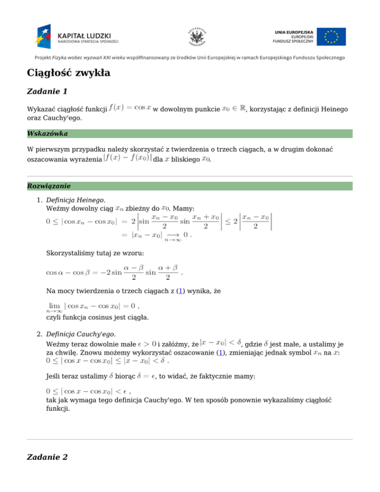 Ciągłość zwykła Zadanie 1 Wykazać ciągłość funkcji oraz Cauchy'ego. w dowolnym punkcie , korzystając z definicji Heinego Wskazówka W pierwszym przypadku należy skorzystać z twierdzenia o trzech ciągach, a w drugim dokonać oszacowania wyrażenia dla bliskiego . Rozwiązanie 1. Definicja Heinego. Weźmy dowolny ciąg zbieżny do . Mamy: Skorzystaliśmy tutaj ze wzoru: Na mocy twierdzenia o trzech ciągach z (1) wynika, że czyli funkcja cosinus jest ciągła. 2. Definicja Cauchy'ego. Weźmy teraz dowolnie małe i załóżmy, że , gdzie jest małe, a ustalimy je za chwilę. Znowu możemy wykorzystać oszacowanie (1), zmieniając jednak symbol na : Jeśli teraz ustalimy biorąc , to widać, że faktycznie mamy: tak jak wymaga tego definicja Cauchy'ego. W ten sposób ponownie wykazaliśmy ciągłość funkcji. Zadanie 2 Wykazać ciągłość funkcji Heinego oraz Cauchy'ego. w dowolnym punkcie , korzystając z definicji Wskazówka W pierwszym przypadku należy skorzystać z twierdzenia o trzech ciągach, a w drugim dokonać oszacowania wyrażenia dla bliskiego . Rozwiązanie 1. Definicja Heinego. Weźmy dowolny ciąg zbieżny do . Mamy: gdzie skorzystaliśmy z nieparzystości funkcji arcus tangens. Wykorzystaliśmy także wzór: który słuszny jest dla rzeczywistych i , dla których . Warunek ten w (6) oznacza, że , co naturalnie jest spełnione dla odpowiednio dużych , gdyż . Oszacujemy teraz wyrażenie w mianowniku: dla dużych (pierwszy wyraz jest niezależny od rosnącym zbiega do zera). Zatem a ponieważ funkcja i większy od jedynki, a drugi wraz z jest rosnąca, więc także Ta ostatnia nierówność jest konsekwencją faktu, że Mamy zatem oszacowanie: i na mocy twierdzenia o trzech ciągach zachodzi: , skąd wynika, że . czyli funkcja arcus tangens jest ciągła. 2. Definicja Cauchy'ego. Weźmy teraz dowolnie małe i załóżmy, że , gdzie jest małe, a ustalimy je za chwilę. Można teraz powtórzyć rozumowanie, które pozwoliło nam napisać układ nierówności (11), zmieniając jedynie symbol na : Ustalając , mamy: tak jak wymaga tego definicja Cauchy'ego. Zadanie 3 Wykazać ciągłość funkcji oraz Cauchy'ego. w dowolnym punkcie , korzystając z definicji Heinego Wskazówka W pierwszym przypadku należy skorzystać z twierdzenia o trzech ciągach, a w drugim dokonać oszacowania wyrażenia dla bliskiego . Rozwiązanie 1. Definicja Heinego. Weźmy dowolny ciąg zbieżny do . Zachodzi: Wykażemy poniżej, że W tym celu wykorzystamy znane oszacowanie: . Zmieniając na i ograniczając się do W efekcie mamy układ nierówności (dla ): , które słuszne jest dla dowolnego , mamy także: Dla dodatnich można to przepisać w formie: a dla ujemnych Podstawiając teraz w miejsce wyrażenie widzimy, że z powyższych nierówności faktycznie wynika (16), a w konsekwencji ciąg po prawej stronie (15) zbiega do zera. Wykazaliśmy więc, że co wypełnia definicję Heinego. 2. Definicja Cauchy'ego. Weźmy teraz dowolnie małe i załóżmy, że , gdzie także jest małe, a ustalimy je za chwilę. Powtarzając rachunki prowadzące do oszacowań (18), zmieniając symbol na , możemy napisać: Jeśli , przy czym jest bardzo małe, to mamy: Pozwala nam to napisać: Ustalając , mamy: tak jak wymaga tego definicja Cauchy'ego. Zadanie 4 Wykazać ciągłość funkcji definicji Heinego oraz Cauchy'ego. dla i w dowolnym punkcie , korzystając z Wskazówka W pierwszym przypadku należy skorzystać z twierdzenia o trzech ciągach, a w drugim dokonać oszacowania wyrażenia dla bliskiego . Rozwiązanie 1. Definicja Heinego. Weźmy dowolny ciąg zbieżny do . Mamy naturalnie: przy użyciu tożsamości: Skoro , to możemy przyjąć, że dla odpowiednio dużych Mamy wówczas oszacowanie dla mianownika w (26): zachodzi: . [Error parsing LaTeX formula. Error 1: ] gdzie skorzystaliśmy z wzoru na sumę wyrazów ciągu geometrycznego. Mamy zatem oszacowanie: Gdy , to prawa strona zbiega do zera, co pociąga za sobą wniosek Ciągłość funkcji jest więc wykazana. 2. Definicja Cauchy'ego. Weźmy dowolnie małe i załóżmy, że , gdzie także jest małe, a ustalimy je za chwilę. Na razie wystarczy nam przyjąć, że , co jest możliwe, gdyż Powtarzamy teraz rachunki prowadzące do oszacowania (28), zmieniając symbol konsekwencji możemy napisać: . na . W Biorąc teraz otrzymujemy: tak jak wymaga tego definicja Cauchy'ego. Zadanie 5 Wykazać ciągłość funkcji oraz Cauchy'ego. w dowolnym punkcie , korzystając z definicji Heinego Wskazówka W pierwszym przypadku należy skorzystać z twierdzenia o trzech ciągach, a w drugim dokonać oszacowania wyrażenia dla bliskiego . Rozwiązanie 1. Definicja Heinego. Weźmy dowolny ciąg zbieżny do . Zachodzi: gdzie wykorzystaliśmy wzór Ponieważ spełniona jest nierówność: (i oczywiście ), możemy uzyskać oszacowanie: Dla ciągów wynika, iż prawa strona zbiega do zera (lewa jest stale równa zeru) i z reguły trzech co kończy dowód. 2. Definicja Cauchy'ego. Weźmy dowolnie małe i załóżmy, że , gdzie także jest małe, a ustalimy je za chwilę. Wykorzystujemy oszacowanie (35), zmieniając symbol na : Przyjmijmy, że wybieramy , co jest możliwe, gdyż . W konsekwencji możemy napisać: Biorąc teraz otrzymujemy: tak jak wymaga tego definicja Cauchy'ego. Zadanie 6 Zbadać ciągłość funkcji: . Wówczas musi zachodzić: gdzie oznacza część całkowitą liczby rzeczywistej (tzw. funkcję entier). Wskazówka Stosując definicję Cauchy'ego, należy znaleźć oszacowanie wielkości osobno przypadki gdy oraz gdy . , rozpatrując Rozwiązanie Wykorzystamy definicję Cauchy'ego ciągłości funkcji. Wybierzmy pewne, dowolnie małe Będziemy się starali oszacować wyrażenie: Rozpatrzymy dwa przypadki: gdy 1. i oraz gdy . . . Weźmy małe i zażądajmy aby warunek. Mamy wówczas: . Przykładowo spełnia ten Skorzystaliśmy tutaj ze wzoru: Dla małego pierwszy wyraz w ostatniej linijce (43) także jest bardzo mały, a drugi ma 