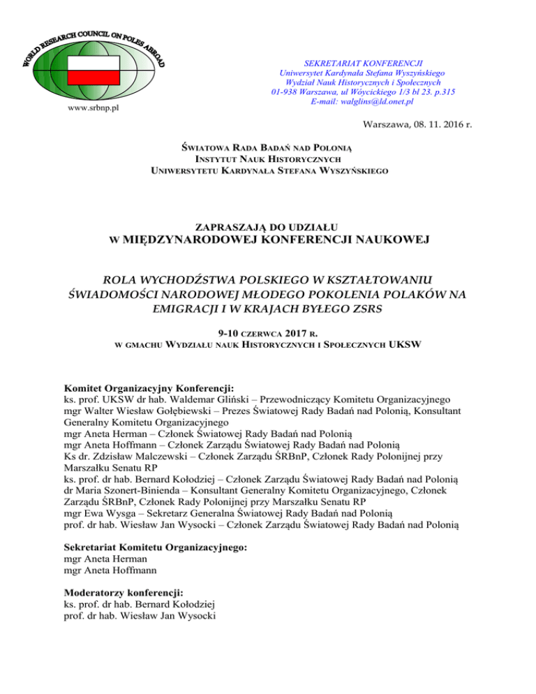 SEKRETARIAT KONFERENCJI Uniwersytet Kardynała Stefana Wyszyńskiego Wydział Nauk Historycznych i Społecznych 01-938 Warszawa, ul Wóycickiego 1/3 bl 23. p.315 E-mail: [email protected] www.srbnp.pl Warszawa, 08. 11. 2016 r. ŚWIATOWA RADA BADAŃ NAD POLONIĄ INSTYTUT NAUK HISTORYCZNYCH UNIWERSYTETU KARDYNAŁA STEFANA WYSZYŃSKIEGO ZAPRASZAJĄ DO UDZIAŁU W MIĘDZYNARODOWEJ KONFERENCJI NAUKOWEJ ROLA WYCHODŹSTWA POLSKIEGO W KSZTAŁTOWANIU ŚWIADOMOŚCI NARODOWEJ MŁODEGO POKOLENIA POLAKÓW NA EMIGRACJI I W KRAJACH BYŁEGO ZSRS W GMACHU 9-10 CZERWCA 2017 R. WYDZIAŁU NAUK HISTORYCZNYCH I SPOŁECZNYCH UKSW Komitet Organizacyjny Konferencji: ks. prof. UKSW dr hab. Waldemar Gliński – Przewodniczący Komitetu Organizacyjnego mgr Walter Wiesław Gołębiewski – Prezes Światowej Rady Badań nad Polonią, Konsultant Generalny Komitetu Organizacyjnego mgr Aneta Herman – Członek Światowej Rady Badań nad Polonią mgr Aneta Hoffmann – Członek Zarządu Światowej Rady Badań nad Polonią Ks dr. Zdzisław Malczewski – Członek Zarządu ŚRBnP, Członek Rady Polonijnej przy Marszałku Senatu RP ks. prof. dr hab. Bernard Kołodziej – Członek Zarządu Światowej Rady Badań nad Polonią dr Maria Szonert-Binienda – Konsultant Generalny Komitetu Organizacyjnego, Członek Zarządu ŚRBnP, Członek Rady Polonijnej przy Marszałku Senatu RP mgr Ewa Wysga – Sekretarz Generalna Światowej Rady Badań nad Polonią prof. dr hab. Wiesław Jan Wysocki – Członek Zarządu Światowej Rady Badań nad Polonią Sekretariat Komitetu Organizacyjnego: mgr Aneta Herman mgr Aneta Hoffmann Moderatorzy konferencji: ks. prof. dr hab. Bernard Kołodziej prof. dr hab. Wiesław Jan Wysocki Cele konferencji: Celem konferencji jest przedstawienie i omówienie wielowątkowego tematu zachowania tożsamości narodowej Polaków na emigracji oraz zamieszkałych w krajach byłego ZSRS. Ze szczególną uwagą podjęte zostaną zagadnienia związane z funkcjonowaniem różnego rodzaju organizacji i instytucji służących kształceniu i wychowaniu młodego pokolenia Polaków: szkolnictwo, organizacje skautingowe, zespoły artystyczne, środki przekazu masowego i in. Ukazana zostanie rola Kościoła katolickiego oraz duszpasterstwa polonijnego w zakresie podtrzymywania tożsamości narodowej. Przedstawimy również wybitne osobistości na emigracji, które zasłużyły się w tej dziedzinie. Organizatorzy podejmą starania zmierzające do wydania wygłoszonych referatów w publikacji pokonferencyjnej. W załącznikach przesyłamy formularz zgłoszeniowy. Po jego wypełnieniu prosimy o przesłanie na adres: Wydział Nauk Historycznych i Społecznych Uniwersytetu Kardynała Stefana Wyszyńskiego, 01 – 938 Warszawa, ul. Wóycickiego 1/3, bl. 23, pokój 315, e-mail: [email protected] w terminie do 15 marca 2017 r. Teksty referatów prosimy przesłać na wskazany powyżej adres w terminie do 1 czerwca 2017 r. Liczymy na udział Państwa w naszym przedsięwzięciu zarówno w formie przygotowanych wystąpień, jak i w charakterze uczestników. Z wyrazami szacunku, ks. dr hab. Waldemar Gliński, prof. UKSW- Wiceprezes do Spraw Naukowych Światowej Rady Badań nad Polonią Walter Wiesław Gołębiewski, MBA – Prezes Światowej Rady Badań nad Polonią