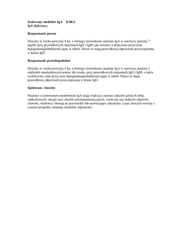 Izolowany niedobór IgA IgA deficiency D 80.2 Rozpoznanie pewne Dziecko w wieku powyżej 4 lat, u którego stwierdzono stężenie IgA w surowicy poniżej 7 mg/dl, przy prawidłowych stężeniach IgG i IgM, jak również wykluczono przyczyny hipogammaglobulinemii ujęte w tabeli. Dzieci te mają prawidłową odpowiedź poszczepienną w klasie IgG. Rozpoznanie prawdopodobne Dziecko w wieku powyżej 4 lat, u którego stwierdzono stężenie IgA w surowicy poniżej 2 odchyleń standardowych normy dla wieku, przy prawidłowych stężeniach IgG i IgM, a także wykluczono inne przyczyny hipogammaglobulinemii ujęte w tabeli. Dzieci te maja prawidłową odpowiedź poszczepienną w klasie IgG. Spektrum choroby Pacjenci z izolowanym niedoborem IgA mają większą częstość zakażeń górnych dróg oddechowych, alergii oraz chorób autoimmunizacyjnych, wielu nie ma żadnych objawów choroby, niektórzy chorują na przewlekłe lub nawracające zakażenia, część chorych rozwija z czasem pospolity zmienny niedobór odporności.