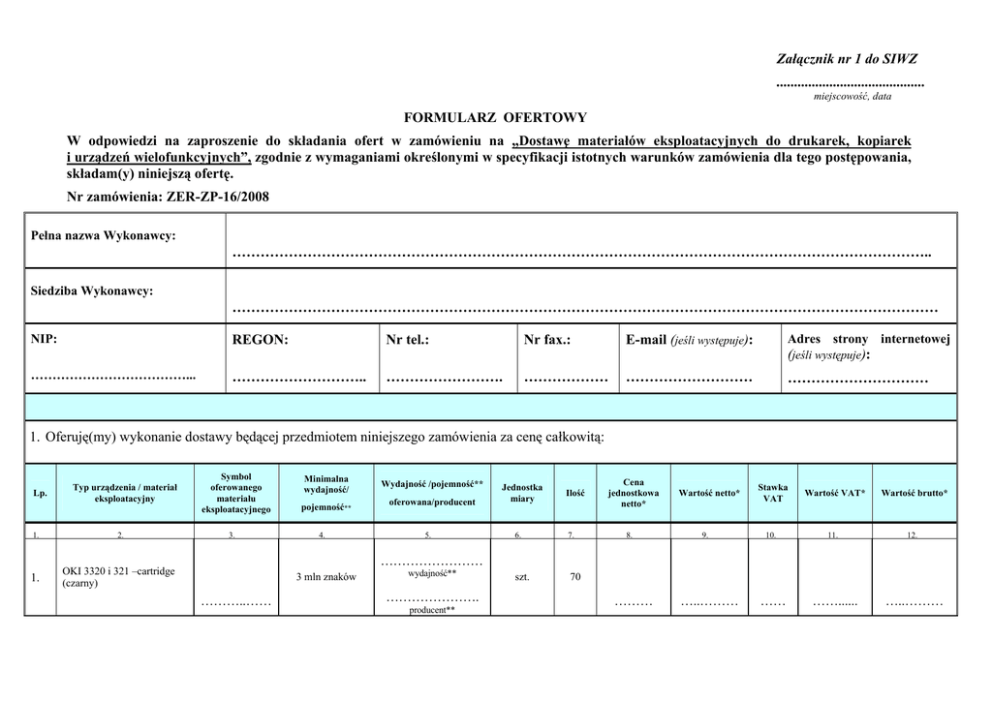 Załącznik nr 1 do SIWZ .......................................... miejscowość, data FORMULARZ OFERTOWY W odpowiedzi na zaproszenie do składania ofert w zamówieniu na „Dostawę materiałów eksploatacyjnych do drukarek, kopiarek i urządzeń wielofunkcyjnych”, zgodnie z wymaganiami określonymi w specyfikacji istotnych warunków zamówienia dla tego postępowania, składam(y) niniejszą ofertę. Nr zamówienia: ZER-ZP-16/2008 Pełna nazwa Wykonawcy: ………………………………………………………………………………………………………………………………….. Siedziba Wykonawcy: …………………………………………………………………………………………………………………………………… NIP: ………………………………... REGON: Nr tel.: Nr fax.: E-mail (jeśli występuje): Adres strony internetowej ……………………….. ……………………. ……………… ……………………… ………………………… (jeśli występuje): 1. Oferuję(my) wykonanie dostawy będącej przedmiotem niniejszego zamówienia za cenę całkowitą: Lp. Typ urządzenia / materiał eksploatacyjny 1. 2. 1. OKI 3320 i 321 –cartridge (czarny) Symbol oferowanego materiału eksploatacyjnego 3. Minimalna wydajność/ pojemność** 4. Wydajność /pojemność** oferowana/producent 5. Jednostka miary Ilość 6. 7. szt. 70 Cena jednostkowa netto* 8. Wartość netto* 9. Stawka VAT Wartość VAT* Wartość brutto* 10. 11. 12. …… ……...... …..……… …………………… 3 mln znaków ………..…… wydajność** …………………. producent** ……… …..……… 2. HP LJ 1100 - toner ………..…… 3. 4. HP LJ 1010/1015/1022N/1020 toner ………..…… 2500 stron A4, zgodnie ze standardem ISO/IEC 19752 wydajność** szt. 2 …………………. producent** 2000 stron A4, zgodnie ze standardem ISO/IEC 19752 wydajność** szt. …..……… …… ……...... …..……… ……… …..……… …… ……...... …..……… ……… …..……… …… ……...... …..……… ……… …..……… …… ……...... …..……… ……… …..……… …… ……...... …..……… ……… …..……… …… ……...... …..……… 200 …………………. …………………… wydajność** szt. 2 …………………. ………..…… ……… …………………… producent** 4000 stron A4 przy pokryciu 5% HP LJ 5P - toner …………………… producent** …………………… 5. 800 stron przy pokryciu 5%, pojemność: 40 ml HP DJ 400 – tusz czarny wydajność** …………………… szt. 1 pojemność** …………………. ………..…… producent** …………………… 6. 165 stron przy pokryciu 15%, pojemność: 19,5 ml HP DJ 400 – tusz kolor wydajność** …………………… szt. 1 pojemność** …………………. ………..…… producent** …………………… 7. HP DJ 1218/3820/930C/PSC950 tusz kolor 970 stron A4 przy pokryciu 15%, pojemność 38 ml ………..…… wydajność** …………………… szt. 4 pojemność** …………………. producent** 2/7/ …………………… 8. 450 stron A4 przy pokryciu 5%, pojemność: 19 ml HP OFIS JET PSC 2210 – tusz czarny wydajność** …………………… szt. 2 pojemność** …………………. ………..…… producent** ……… …..……… …… ……...... …..……… ……… …..……… …… ……...... …..……… ……… …..……… …… ……...... …..……… ……… …..……… …… ……...... …..……… ……… …..……… …… ……...... …..……… …………………… 9. 400 stron A4 przy pokryciu 15%, pojemność: 17 ml HP OFIS JET PSC 2210 – tusz kolor wydajność** …………………… szt. 2 pojemność** …………………. ………..…… producent** …………………… wydajność** 10. CANON i80 / ip90 – tusz czarny 100 stron A4 przy pokryciu 5% …………………… szt. 2 pojemność** …………………. ………..…… producent** …………………… wydajność** 11. 100 stron A4 przy pokryciu 5% CANON ip90 – tusz kolor 12. 2 producent** 20000 stron A4 przy pokryciu 5% ………..…… szt. pojemność** …………………. ………..…… KYOCERA MITA KM 2560*- toner …………………… …………………… wydajność** …………………. producent** szt. 12 3/7/ 13. KYOCERA MITA FS 1118 - toner 7200 stron A4 przy pokryciu 5% 16. ----------------- ………..…… opk. producent** ----------------- …………………. rola 4 szt. 20 producent** 400 ml pojemność** …………………. producent** …… ……...... …..……… ……… …..…… …… ……...... …..……… ……… …..……… …… ……...... …..……… ……… …..……… …… ……...... …..……… ……… …..…… …… ……...... …..……… ……… …..……… …… ……...... …..……… ……… …..……… …… ……...... …..……… ……… …..…… …… ……...... …..……… …………………… --------------- 400 ml pojemność** szt. 20 producent** 18. …..…… 4 …………………. Spray do czyszczenia monitorów LCD ……… …………………… Spray do czyszczenia ekranów Spray do czyszczenia obudów komputera pojemność** …………………. --------------- 17. 20 …………………… RISOGRAPH GR 3750 (A3) – farba (1 opk. = 2 szt.) RISOGRAPH GR 3750 (A3) - matryca szt. producent** ………..…… 15. wydajność** …………………. ………..…… 14. …………………… …………………… --------------- 250 ml pojemność** szt. 10 …………………. producent** …………………… 19. Spray - sprężone powietrze --------------- 400 ml