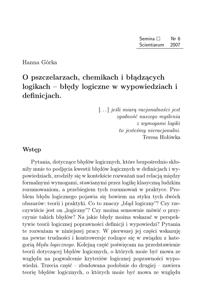 Semina Scientiarum Nr 6 2007 Hanna Górka O pszczelarzach, chemikach i błądzących logikach – błędy logiczne w wypowiedziach i definicjach. [. . . ] jeśli miarą racjonalności jest zgodność naszego myślenia z wymogami logiki to jesteśmy nieracjonalni. Teresa Hołówka Wstęp Pytania, dotyczące błędów logicznych, które bezpośrednio skłoniły mnie to podjęcia kwestii błędów logicznych w definicjach i wypowiedziach, zrodziły się w kontekście rozważań nad relacją między formalnymi wymogami, stawianymi przez logikę klasyczną ludzkim rozumowaniom, a przebiegiem tych rozumowań w praktyce. Problem błędu logicznego pojawia się bowiem na styku tych dwóch obszarów: teorii i praktyki. Co to znaczy „błąd logiczny”? Czy rzeczywiście jest on „logiczny”? Czy można sensownie mówić o przyczynie takich błędów? Na jakie błędy można wskazać w perspektywie teorii logicznej poprawności definicji i wypowiedzi? Pytania te rozważam w niniejszej pracy. W pierwszej jej części wskazuję na pewne trudności i kontrowersje rodzące się w związku z kategorią błędu logicznego. Kolejną część poświęcam na przedstawienie teorii dotyczącej błędów logicznych, o których może być mowa ze względu na pogwałcenie kryteriów logicznej poprawności wypowiedzi. Trzecia część – zbudowana podobnie do drugiej – zawiera teorię błędów logicznych, o których może być mowa ze względu 98 | Hanna Górka na pogwałcenie kryteriów logicznej poprawności definicji (definicja także jest rodzajem wypowiedzi). W przedostatniej części mojej pracy analizuję fragmenty tekstów, które zawierają błędy logiczne. Przykłady te zaczerpnęłam z podręczników logiki, a także pism o charakterze naukowym, których autorami są logicy. Ostatni rozdział zawiera opis „eksperymentu”, który, w pewnym sensie, przypadkowo przeprowadziłam na grupie moich koleżanek i kolegów, a który uchylił przede mną „rąbka tajemnicy” błędów logicznych. Wnioski przedkładam w zakończeniu. Błądzenie wokół błędu Teresa Hołówka, w książce Błędy, spory argumenty wskazuje na przyczyny, z powodu których niełatwo jest jednoznacznie zdefiniować pojęcie błędu logicznego1 . Zasadnicze pytanie dotyczy prawomocności stosowania tej kategorii. Czy uchybienia, które w literaturze fachowej nazywa się „błędami logicznymi” rzeczywiście nimi są? To znaczy, czy faktycznie „[. . . ] stanowią one przypadki złamania jakiś norm, które zostały przez logików jasno i eksplicite sformułowane?” 2 . Okazuje się, że nawet jeśli tak jest – nawet jeśli błędem logicznym określona zostaje nieprawidłowość w rozumowaniu, o której można mówić w perspektywie logicznej reguły poprawności tego rozumowania, to jednak od tej reguły jest wiele wyjątków. Praca ta dotyczy zagadnienia błędów logicznych w definicjach i wypowiedziach, ale w tej jej części chcę wspomnieć także o trudnościach, które dotyczą kwestii błędu logicznego w odniesieniu do ludzkich rozumowań w ogóle. Mam tu na myśli: przeprowadzanie wnioskowań, argumentowanie, definiowanie i formułowanie wypowiedzi. Wszystkie te czynności nazywam „rozumowaniami” (choć często pojęcie rozumowania stosowane jest zamiennie z pojęciem wnioskowania), ponieważ uważam je za racjonalne w tym sensie, 1 T. Hołówka, Błędy, spory, argumenty. Szkice z logiki stosowanej, Wydział Filozofii i Socjologii UW, Warszawa 1998, s. 7–27. 2 Tamże, s. 7. O pszczelarzach, chemikach i błądzących logikach 99 że są one procesami myślowymi, przebiegającymi w pewien – mniej lub bardziej – określony sposób. Między innymi dlatego, jak sądzę, można w ogóle wskazywać na reguły ich poprawności (reguły według których powinny być one przeprowadzane), a także mówić o błędach, jakie mogą zostać popełnione w przypadku złamania tych reguł. Ogólna uwaga, którą można poczynić odnośnie tak pojmowanych rozumowań także odnosi się do ich poprawności. Poprawność rozumowań „[. . . ] osiągniemy jedynie wówczas, gdy kierować się będziemy przy ich przeprowadzaniu postulatem krytycyzmu, inaczej zasadą racji dostatecznej (lex rationis determinantis sive sufficientis). [. . . ] Konsekwencją akceptowania zasady racji dostatecznej jest twierdzenie, że każdy przyjmowany przez nas sąd powinien być uzasadniony” 3 . Myśl ta oznacza, że przede wszystkim argumentacje i wypowiedzi, w których wyrażane są sądy na określony temat, powinny być przez ich autorów uzasadnione. W tym kontekście warto, moim zdaniem, wspomnieć krótko o rodzajach uzasadnień, które, ze względu na charakter, dzieli się na: uzasadnienia bezpośrednie i pośrednie. Metody uzasadnienia bezpośredniego, to: spostrzeżenia, obserwacje, eksperymenty. Wiążą się one z uzasadnieniem empirycznym, w które zaangażowane są ludzkie zmysły. Uzasadnienia pośrednie, to wnioskowania: dedukcyjne (sensu stricto, dowód wprost, dowód niewprost) i niededukcyjne (tłumaczenie, sprawdzanie, wnioskowanie przez analogię, wnioskowania indukcyjne)4 . Można więc powiedzieć, że choć argumentacja pełni rolę uzasadniającą w dyskusji, sama także musi być uzasadniona. Stosowany w dyskusji argument może mieć, np. uzasadnienie w obserwacji (czy „z obserwacji”), czy we wnioskowaniu. Przywołujący w dyskusji argument A musi móc wskazać na podstawy, które pozwalają mu tego argumentu użyć. Takie pojmowanie pozwala także mówić o błędnej argumentacji, która takiego uzasadnienia nie posiada, np. argumetnum ad hominem (argument 3 S. Lewandowski, H. Machińska, A. Malinowski, J. Petzel, Logika dla prawników, Wydawnictwo Prawnicze „LexisNexis”, Warszawa 2003, s. 177. 4 Por. tamże, s. 178–198. 100 | Hanna Górka odwołujący się do poglądów przeciwnika niezależnie od tego, czy argumentujący podziela poglądy przeciwnika, czy nie). Myślę, że o argumentacji m