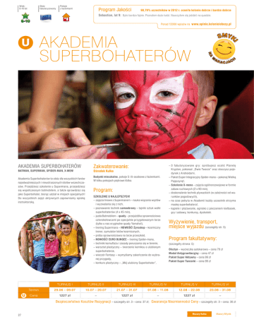 Wiek: 6-10 lat Obóz fabularyzowany Pokoje z!#azienkami Program Jako&ci 98,79% uczestników w 2012 r. oceni%o kolonie dobrze i bardzo dobrze Sebastian, lat 9: By#o bardzo fajnie. Pozna#em du o ludzi. Nauczy#em si" je(dzi% na quadzie. Ponad 12000 wpisów na www.opinie.kolonieiobozy.pl AKADEMIA SUPERBOHATERÓW Zakwaterowanie: BATMAN, SUPERMAN, SPIDER-MAN, X-MEN! O!rodek Kulka Akademia Superbohaterów to obóz dla wszystkich fanów najodwa niejszych i!nieustraszonych idolów wszechczasów. Przejdziesz szkolenie u!Supermana, przejedziesz si" wspó#czesnym batmobilem, a!tak e sprawdzisz si" jako Superbohater, bior$c udzia# w!misjach specjalnych! Do wszystkich zaj"% aktywnych zapewniamy opiek" instruktorsk$. U Budynki mieszkalne, pokoje 5 i!6-osobowe z!#azienkami. W!kilku pokojach pi"trowe #ó ka. Program: SZKOLENIE U NAJLEPSZYCH! – zaj"cia linowe z!Supermanem – nauka wi$zania w"z#ów i!wyzwalania si" z!nich, – poznawanie technik samoobrony – tajniki sztuk walki superbohaterów (4!x!45 min), – jazda Batmobilem – quady – przeja d ka sprawno&ciowa czteroko#owcami po specjalnie przygotowanym torze (tylko u!nas oryginalne quady Yamaha!), – trening Supermana – NOWO"#! $yroskop – kosmiczny trener, symulator lotów kosmicznych, – próba sprawno&ciowa na torze przeszkód, – NOWO"#! EURO BUNGEE – trening Spider-mana, – techniki kamufla u i!zasady poruszania si" w!terenie, – warsztat plastyczny – tworzenie komiksu o!ulubionym superbohaterze, – wieczór Fantasy – wymy&lamy zako'czenie do wybranej przygody, – konkurs plastyczny – „Mój ulubiony Superbohater”, NA AKADEMIA SUPERBOHATERÓW I U SMYK W AK A C JAC H – 3 fabularyzowane gry: spróbujesz ocali% Planet" Krypton, pokona% „Dwie Twarze” oraz stoczysz pojedynek z!Androidami, – Pakiet Super Integracyjny Spider-mana – pokonaj Wielk$ Paj"czyn"!, – Szkolenie X-mena – zaj"cia ogólnorozwojowe w!formie zabaw ruchowych (2!x!90 min), – doskonalenie technik p#ywackich (w!zale no&ci od warunków pogodowych), – na czas pobytu w!Akademii ka dy uczestnik otrzyma mask" superbohatera!, – k$piele i!pla owanie, ognisko z!pieczeniem kie#basek, gry i!zabawy, konkursy, dyskoteki. Wy ywienie, transport, miejsce wyjazdu (szczegó#y str. 5) Program fakultatywny: (szczegó#y strona: 5) Olsztyn – wycieczka autokarowa – cena 79 z# Modu% Antygrawitacyjny – cena 47 z# Pakiet Super Aktywny – cena 99 z# Pakiet Super Tancerki – cena 99 z# TURNUS I TURNUS II TURNUS III TURNUS IV TURNUS V TURNUS VI Termin 29.06 – 09.07 10.07 – 20.07 21.07 – 31.07 01.08 – 11.08 12.08 – 22.08 23.08 – 31.08 Cena 1227 z – 1227 z – 1227 z – Bezpiecze'stwo Kosztów Rezygnacji – szczegó#y str. 3 – cena: 37 z#; Gwarancja Niezmienno&ci Ceny – szczegó#y str. 3 – cena:!30 z# 27 Mazury Kulka Mazury M#ynik