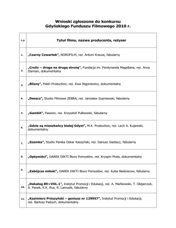 Wnioski zgłoszone do konkursu Gdyńskiego Funduszu Filmowego 2010 r. L.p Tytuł filmu, nazwa producenta, reżyser 1. „Czarny Czwartek”, NORDFILM, reż. Antoni Krauze, fabularny 2. „Crulic – droga na drugą stronę”, Fundacja im. Ferdynanda Magellana, reż. Anca Damian, dokumentalny 3. „Blizny”, Flash Production, reż. Ewa Stępniewicz, dokumentalny 4. „Deszcz”, Studio Filmowe ZEBRA, reż. Jarosław Sypniewski, fabularny 5. „Gambit”, Passion, reż. Krzysztof Pulkowski, fabularny 6. „Gdzie są mieszkańcy białej Gdyni”, M.K. Production, reż. Lech A. Kujawski, dokumentalny 7. „Szamka”, Studio Panika Oskar Kaszyński, reż. Dariusz Siastacz, fabularny 8. „Optymiści”, DAREK DIKTI Biuro Pomysłów, reż. Kryspin Pluta, dokumentalny 9. „Zabójcza miłość”, DAREK DIKTI Biuro Pomysłów, reż. Kuba Nieścierow, fabularny 10. 11. „Dekalog 89+VOL.1”, Instytut Promocji i Edukacji, reż. A. Mańkowski, T. Olejarczyk, A. Panek, K.K. Rus, R. Lamusik, fabularny „Kazimierz Prószyński – geniusz nr 129957”, Instytut Promocji i Edukacji, reż. Bartosz Paduch, dokumentalny 12. „Zimowy Ojciec”, Studio Efekt-Pokromski Studio, reż. Johannes Schmid, fabularny 13. „Mój Topos”, Studio Panika Oskar Kaszyński, reż. Katarzyna Zawadowicz, fabularny 14. „Xawery Czernicki”, SIDMA Alina Mackiewicz, reż. Janusz Sidor, dokumentalny 15. „Opener w Gdyni”, De Lord Sp. z o.o., reż. Adam Bortnowski, dokumentalny 16. „Lebensraum”, Picaresque Maciej Pawlicki, reż. Jolanta Kessler-Chojecka, dokumentalny 17. „Felix, Net i Nika oraz Teoretycznie Możliwa Katastrofa”, Wytwórnia Filmów Dokumentalnych i Dokumentalnych, reż. Wiktor Skrzynecki, fabularny 18. „ORP Orzeł”, Szyby Niebieskie Jan Pawlicki, reż. Jan Pawlicki, dokumentalny 19. „Wolność moja jedyna”, Sopocka Wytwórnia Filmowa Andrzej Reichel, reż. Przemysław Reichel, dokumentalny 20. „Dwa światy Michała Leszczyńskiego”, Fundacja Filmów i Programów Katolickich Video Studio Gdańsk, reż. Tomasz Radziemski, dokumentalny 21. „Ludzie Gdyni”, Komedia Mirosław Bork, reż. Mirosław Bork, dokumentalny 22. „Odcienie bursztynu”, Grupa dr. A.R. Kwiecińskiego – Film Studio Kwieciński, reż. Athena Sawidis, serial