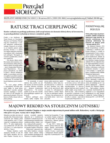 BEZPŁATNY MIESIĘCZNIK | Nr 3/2015 | 1-30 czerwca 2015 r. | ISSN 2391-9604 | www.przegladstoleczny.pl | Nakład: 200 000 egz. OSZUSTWA KOMUNIKACJA RATUSZ TRACI CIERPLIWOŚĆ Koniec czekania na parkingi podziemne. Jeśli urząd miasta nie dostanie dobrej oferty od inwestorów, to prawdopodobnie wybuduje je któraś z miejskich spółek. Chodzi o trzy lokalizacje: pl. Trzech Krzyży, pl. Powstańców Warszawy i pl. Teatralny. Parkingi mają być wybudowane w systemie partnerstwa publiczno-prywatnego. Oznacza to, że za budowę na miejskim gruncie zapłaci prywatny inwestor, a w zamian za to będzie mógł przez określony czas pobierać zyski z eksploatacji tych parkingów. Wymagania inwestorów są jednak duże, a miasto traci cierpliwość. ‒ Nie chcemy dłużej czekać. Rozważamy taki scenariusz, że jeśli nie dostaniemy dobrej oferty, to budową zajmie się miejska spółka – mówi wiceprezydent Warszawy Jacek Wojciechowicz. ‒ Nie jest jeszcze przesądzone, czy będzie to któraś z obecnie działających spółek, czy powołamy nową, która mogłaby na przykład zarządzać wszystkimi miejskimi parkingami w Warszawie. Te wszystkie możliwości będziemy jeszcze analizować. Na czym polega problem w negocjacjach? Prywatne podmioty żądają, by urząd miasta zlikwidował wszystkie parkingi naziemne znajdujące w promieniu nawet do pół kilometra od planowanych postojów. Wówczas kierowcy byliby skazani tylko na płatne parkingi. ‒ To zrozumiałe, że przedsiębiorcy chcą zarobić, my jednak musimy się kierować przede wszystkim interesem mieszkańców – tłumaczy wiceprezydent Wojciechowicz. ‒ Nie możemy zgodzić się na tak ostre warunki, nieuwzględniające aspektów społecznych. Budowa parkingów przez miejską spółkę mogłaby mieć jeszcze jeden pozytywny aspekt. Przedsiębiorcy, którzy będą mogli partycypować w zyskach tylko przez określony czas, będą dążyć do jak najwyższych opłat za postój, by zrekompensować koszty budowy i zarobić. Miasto nie musi na parkingach zarabiać. – Możemy więc przypuszczać, że ceny byłyby niższe – mówi wiceprezydent. Urząd miasta czeka na oferty do końca czerwca. Jeśli żadna z nich nie będzie dla urzędników satysfakcjonująca, to pierwszy parking budowany przez miejską spółkę mógłby zacząć działać za około trzy lata. – Jeśli ta formuła się sprawdzi, to będziemy w tym trybie budowali kolejne parkingi, nie tylko w centrum – zapowiada wiceprezydent Wojciechowicz. st PODSZYWAJĄ SIĘ POD ZUS Osoby podszywające się pod pracowników Zakładu Ubezpieczeń Społecznych mogą kierować do emerytów zawirusowaną korespondencję elektroniczną lub namawiać do płatnych porad – ostrzega stołeczny ZUS. Do niektórych klientów ZUS dotarła korespondencja e-mailowa z informacją o możliwości przeliczenia emerytury w związku ze zmianą przepisów Ustawy o emeryturach i rentach z Funduszu Ubezpieczeń Społecznych. Znalazły się tam między innymi adres kontaktowy dyrektora i zastępcy dyrektora oddziału ZUS oraz załącznik, który był najprawdopodobniej zawirusowany. Inni klienci odebrali z kolei telefony z informacją o możliwości przeliczenia emerytury w oparciu o nowe przepisy i z sugestią spotkania z przedstawicielem Zakładu Ubezpieczeń Społecznych. ‒ Nasi pracownicy nie przesyłają klientom korespondencji e-mailowej z informacją o możliwości skorzystania z przeliczenia świadczenia, nie kontaktują się też w tej sprawie telefonicznie – zapewnia rzecznik ZUS Wojciech Andrusewicz. – Stąd uczulamy i prosimy o ostrożność. Jeżeli ktokolwiek ma wątpliwość co do wiarygodności kontaktujących się osób, prosimy o telefon do Centrum Obsługi Telefonicznej ZUS – nr 22 560 16 00. al SAMOLOTY MAJOWY REKORD NA STOŁECZNYM LOTNISKU Po raz pierwszy w historii Lotniska Chopina w maju zostało odprawionych ponad milion osób. Rekordowy wynik z bieżącego roku jest o 5,1 proc. wyższy niż w maju 2014 r. Rekordowy jest także cały okres od początku roku. Od stycznia do maja warszawski port obsłużył ponad 4 mln pasażerów, czyli o 7,5 proc. więcej niż w analogicznym okresie 2014 r. W ruchu międzynarodowym podróżowało 3,58 mln osób (+9,3 proc.), a w ruchu krajowym 445,8 tys. (‒5 proc.). ‒ Kolejny rekordowy wynik miesięczny dowodzi, że cały rok 2015 będzie rekordowy dla Lotniska Chopina. Cieszymy się, że możemy wszystkich pasażerów odprawiać już w komfortowych warunkach w rozbudowanym i bardziej przestronnym terminalu, który zmodernizowaliśmy właśnie z myślą o większej liczbie pasażerów – mówi Michał Kaczmarzyk, dyrektor Lotniska Chopina w Warszawie. Efektywność i sprawność działania służby lotniskowe wykazały między innymi podczas obsługi ruchu samolotów przylatujących do Warszawy w związku z finałem pił- karskiej Ligi Europejskiej. 27 maja na Lotnisku Chopina wylądowało z tej okazji blisko 50 samolotów czarterowych z kibicami, głównie z Hiszpanii i Ukrainy. W maju 2015 r. liczba pasażerskich operacji lotniczych, obejmująca operacje przewoźników tradycyjnych i niskokosztowych, wzrosła o 2,2 proc. w porównaniu z analogicznym okresem poprzedniego roku i wyniosła łącznie 11 tys. cs 2 Przegląd Stołeczny nr 3, 1–30 czerwca 2015 r. PSYCHOLOG RADZI TRUDNE ZASYPIANIE Żyjesz w ciągłym biegu? Szkoda ci czasu na odpoczynek? Przecież nie możesz tak po prostu położyć się i nic nie robić. Zawsze jest coś do zrobienia, prawda? Zestresowani, pod presją natłoku prac do wykonania nie potrafimy zwolnić i wyciszyć się nawet wtedy, gdy przychodzi noc i pora snu. Zamiast znaleźć czas i przestrzeń na to, by posłuchać siebie, zagłuszamy to, siadając przed komputerem lub telewizorem, popijając alkohol, objadając się lub paląc papierosy. Potem kładziemy się do łóżka i nie mogąc zasnąć, słuchamy radia albo czytamy książkę, aż w końcu nad ranem zapadamy w płytką drzemkę, z 