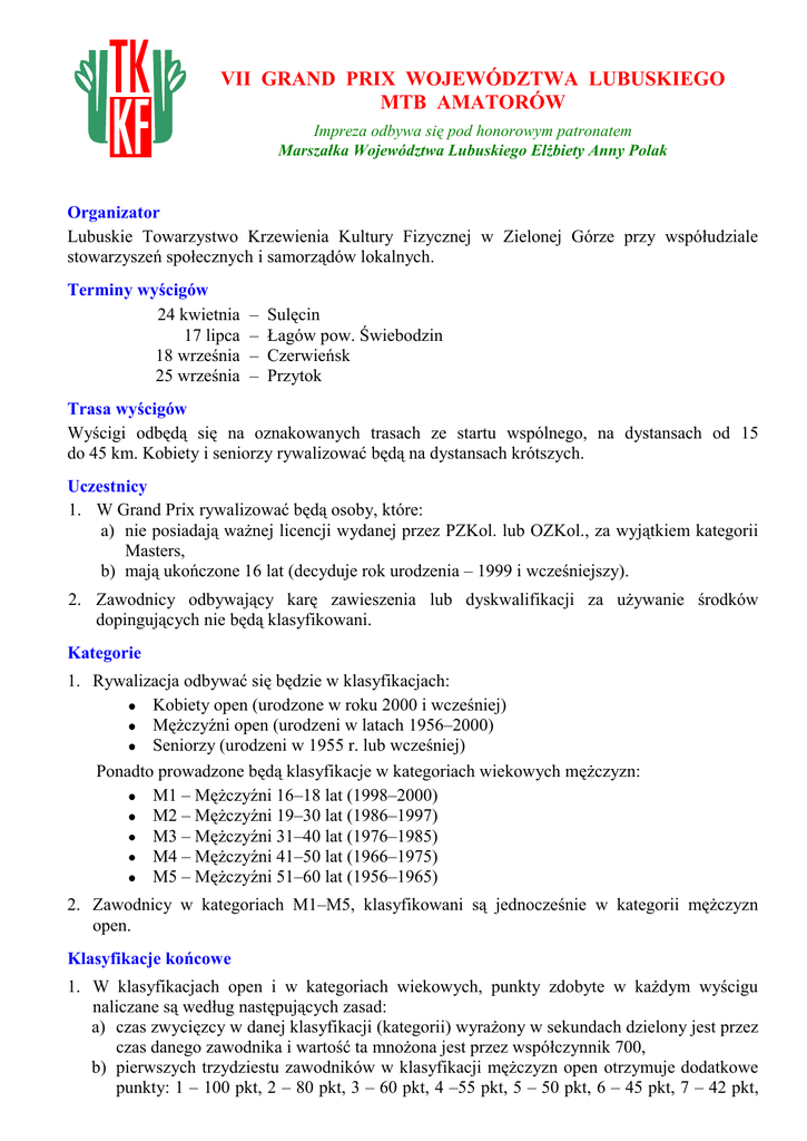 VII GRAND PRIX WOJEWÓDZTWA LUBUSKIEGO MTB AMATORÓW Impreza odbywa się pod honorowym patronatem Marszałka Województwa Lubuskiego Elżbiety Anny Polak Organizator Lubuskie Towarzystwo Krzewienia Kultury Fizycznej w Zielonej Górze przy współudziale stowarzyszeń społecznych i samorządów lokalnych. Terminy wyścigów 24 kwietnia 17 lipca 18 września 25 września – – – – Sulęcin Łagów pow. Świebodzin Czerwieńsk Przytok Trasa wyścigów Wyścigi odbędą się na oznakowanych trasach ze startu wspólnego, na dystansach od 15 do 45 km. Kobiety i seniorzy rywalizować będą na dystansach krótszych. Uczestnicy 1. W Grand Prix rywalizować będą osoby, które: a) nie posiadają ważnej licencji wydanej przez PZKol. lub OZKol., za wyjątkiem kategorii Masters, b) mają ukończone 16 lat (decyduje rok urodzenia – 1999 i wcześniejszy). 2. Zawodnicy odbywający karę zawieszenia lub dyskwalifikacji za używanie środków dopingujących nie będą klasyfikowani. Kategorie 1. Rywalizacja odbywać się będzie w klasyfikacjach: Kobiety open (urodzone w roku 2000 i wcześniej) Mężczyźni open (urodzeni w latach 1956–2000) Seniorzy (urodzeni w 1955 r. lub wcześniej) Ponadto prowadzone będą klasyfikacje w kategoriach wiekowych mężczyzn: M1 – Mężczyźni 16–18 lat (1998–2000) M2 – Mężczyźni 19–30 lat (1986–1997) M3 – Mężczyźni 31–40 lat (1976–1985) M4 – Mężczyźni 41–50 lat (1966–1975) M5 – Mężczyźni 51–60 lat (1956–1965) 2. Zawodnicy w kategoriach M1–M5, klasyfikowani są jednocześnie w kategorii mężczyzn open. Klasyfikacje końcowe 1. W klasyfikacjach open i w kategoriach wiekowych, punkty zdobyte w każdym wyścigu naliczane są według następujących zasad: a) czas zwycięzcy w danej klasyfikacji (kategorii) wyrażony w sekundach dzielony jest przez czas danego zawodnika i wartość ta mnożona jest przez współczynnik 700, b) pierwszych trzydziestu zawodników w klasyfikacji mężczyzn open otrzymuje dodatkowe punkty: 1 – 100 pkt, 2 – 80 pkt, 3 – 60 pkt, 4 –55 pkt, 5 – 50 pkt, 6 – 45 pkt, 7 – 42 pkt, 8 – 39 pkt, 9 – 36 pkt, 10 – 33 pkt, 11 – 30 pkt, 12 – 28 pkt, 13 – 26 pkt, 14 –24 pkt, 15 – 22 pkt 16 – 20 pkt, 17 – 18, 18 – 16 pkt, 19 – 14 pkt, 20 – 12 pkt, 21 – 10 pkt, 22 – 9 pkt, 23 – 8 pkt, 24 – 7 pkt, 25 – 6 pkt, 26 – 5 pkt, 27 – 4 pkt, 28 – 3 pkt, 29 – 2 pkt, 30 – 1 pkt. c) pierwszych piętnastu zawodników klasyfikacji kobiet open, seniorów oraz w kategoriach wiekowych M1–M5 otrzymuje dodatkowe punkty: 1 – 100 pkt, 2 – 80 pkt, 3 – 60 pkt, 4 –50 pkt, 5 – 40 pkt, 6 – 35 pkt, 7 – 30 pkt, 8 – 26 pkt, 9 – 22 pkt, 10 – 18 pkt, 11 – 15 pkt, 12 – 12 pkt, 13 – 9 pkt, 14 –6 pkt, 15 – 3 pkt. d) zawodnik, który wystartuje ale nie dotrze do mety otrzymuje 210 punktów. 2. Zwycięzcą Grand Prix i tym samym amatorskim mistrzem MTB województwa lubuskiego zostanie zawodnik, który w przekroju całego sezonu zgromadzi najwięcej punktów w trzech najlepszych startach. Nagrody 1. Po zakończeniu cyklu, trzech pierwszych zawodników w każdej kategorii otrzyma puchary (statuetki), a zawodnicy, którzy zajmą miejsca od 4 do 6 – dyplomy. 2. Dekoracje zwycięzców Grand Prix odbędą się po zakończeniu ostatniego wyścigu. Kary 1. W przypadku naruszenia zasad fair play, na wniosek organizatora wyścigu zawodnik może być ukarany przez organizatora GP: – utratą 210 pkt., – utratą 700 pkt., – wykluczeniem z cyklu GP. 2. Jeśli decyzja o dyskwalifikacji zapadnie po zakończeniu cyklu, nie przewiduje się odbierania pucharów (statuetek), medali i dyplomów oraz zmiany punktacji innych zawodników. Postanowienia końcowe 1. Poszczególne wyścigi przeprowadzone zostaną w oparciu o regulaminy opracowane przez bezpośrednich organizatorów. 2. Klasyfikacje GP będą prowadzone przez firmę PulsarSport. 3. Aktualne wyniki GP będą publikowane na stronie internetowej www.tkkf.zgora.pl.