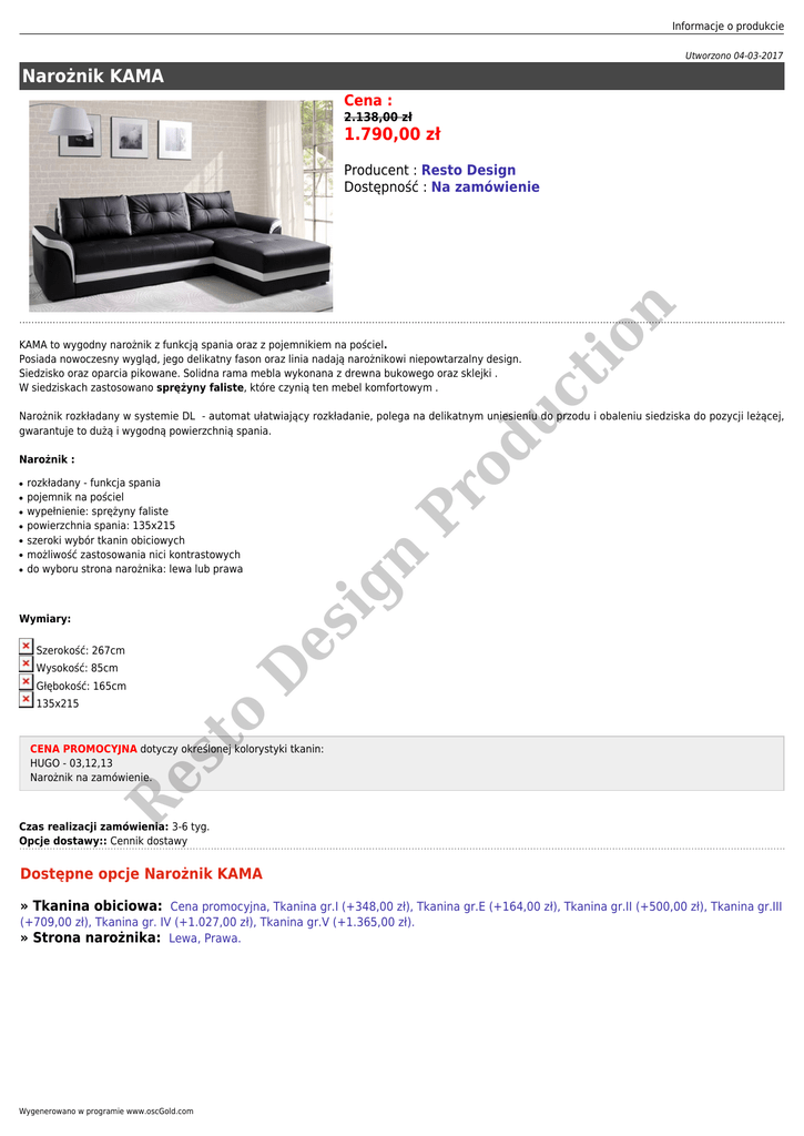 Informacje o produkcie Utworzono 04-03-2017 Narożnik KAMA Cena : 2.138,00 zł 1.790,00 zł Pr od uc ti o n Producent : Resto Design Dostępność : Na zamówienie KAMA to wygodny narożnik z funkcją spania oraz z pojemnikiem na pościel. Posiada nowoczesny wygląd, jego delikatny fason oraz linia nadają narożnikowi niepowtarzalny design. Siedzisko oraz oparcia pikowane. Solidna rama mebla wykonana z drewna bukowego oraz sklejki . W siedziskach zastosowano sprężyny faliste, które czynią ten mebel komfortowym . Narożnik rozkładany w systemie DL - automat ułatwiający rozkładanie, polega na delikatnym uniesieniu do przodu i obaleniu siedziska do pozycji leżącej, gwarantuje to dużą i wygodną powierzchnią spania. ● ● ● ● ● ● ● rozkładany - funkcja spania pojemnik na pościel wypełnienie: sprężyny faliste powierzchnia spania: 135x215 szeroki wybór tkanin obiciowych możliwość zastosowania nici kontrastowych do wyboru strona narożnika: lewa lub prawa D es Wymiary: ig n Narożnik : Szerokość: 267cm Wysokość: 85cm Głębokość: 165cm es t o 135x215 R CENA PROMOCYJNA dotyczy określonej kolorystyki tkanin: HUGO - 03,12,13 Narożnik na zamówienie. Czas realizacji zamówienia: 3-6 tyg. Opcje dostawy:: Cennik dostawy Dostępne opcje Narożnik KAMA » Tkanina obiciowa: Cena promocyjna, Tkanina gr.I (+348,00 zł), Tkanina gr.E (+164,00 zł), Tkanina gr.II (+500,00 zł), Tkanina gr.III (+709,00 zł), Tkanina gr. IV (+1.027,00 zł), Tkanina gr.V (+1.365,00 zł). » Strona narożnika: Lewa, Prawa. Wygenerowano w programie www.oscGold.com