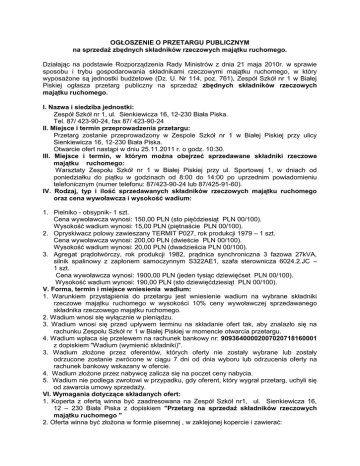 OGŁOSZENIE O PRZETARGU PUBLICZNYM na sprzedaż zbędnych składników rzeczowych majątku ruchomego. Działając na podstawie Rozporządzenia Rady Ministrów z dnia 21 maja 2010r. w sprawie sposobu i trybu gospodarowania składnikami rzeczowymi majątku ruchomego, w który wyposażone są jednostki budżetowe (Dz. U. Nr 114, poz. 761), Zespół Szkół nr 1 w Białej Piskiej ogłasza przetarg publiczny na sprzedaż zbędnych składników rzeczowych majątku ruchomego. I. Nazwa i siedziba jednostki: Zespół Szkół nr 1, ul. Sienkiewicza 16, 12-230 Biała Piska. Tel. 87/ 423-90-24, fax 87/ 423-90-24 II. Miejsce i termin przeprowadzenia przetargu: Przetarg zostanie przeprowadzony w Zespole Szkół nr 1 w Białej Piskiej przy ulicy Sienkiewicza 16, 12-230 Biała Piska. Otwarcie ofert nastąpi w dniu 25.11.2011 r. o godz. 10:30. III. Miejsce i termin, w którym można obejrzeć sprzedawane składniki rzeczowe majątku ruchomego: Warsztaty Zespołu Szkół nr 1 w Białej Piskiej przy ul. Sportowej 1, w dniach od poniedziałku do piątku w godzinach od 8:00 do 14:00 po uprzednim powiadomieniu telefonicznym (numer telefonu: 87/423-90-24 lub 87/425-91-60). IV. Rodzaj, typ i ilość sprzedawanych składników rzeczowych majątku ruchomego oraz cena wywoławcza i wysokość wadium: 1. Pielniko - obsypnik- 1 szt. Cena wywoławcza wynosi: 150,00 PLN (sto pięćdziesiąt PLN 00/100). Wysokość wadium wynosi: 15,00 PLN (piętnaście PLN 00/100). 2. Opryskiwacz polowy zawieszany TERMIT P027, rok produkcji 1979 – 1 szt. Cena wywoławcza wynosi: 200,00 PLN (dwieście PLN 00/100). Wysokość wadium wynosi: 20,00 PLN (dwadzieścia PLN 00/100). 3. Agregat prądotwórczy, rok produkcji 1982, prądnica synchroniczna 3 fazowa 27kVA, silnik spalinowy z zapłonem samoczynnym S322AE1, szafa sterownicza 6024.2.JC – 1 szt. Cena wywoławcza wynosi: 1900,00 PLN (jeden tysiąc dziewięćset PLN 00/100). Wysokość wadium wynosi: 190,00 PLN (sto dziewięćdziesiąt PLN 00/100). V. Forma, termin i miejsce wniesienia wadium: 1. Warunkiem przystąpienia do przetargu jest wniesienie wadium na wybrane składniki rzeczowe majątku ruchomego w wysokości 10% ceny wywoławczej sprzedawanego składnika rzeczowego majątku ruchomego. 2. Wadium wnosi się wyłącznie w pieniądzu. 3. Wadium wnosi się przed upływem terminu na składanie ofert tak, aby znalazło się na rachunku Zespołu Szkół nr 1 w Białej Piskiej w momencie otwarcia przetargu. 4. Wadium wpłaca się przelewem na rachunek bankowy nr: 90936400002007020718160001 z dopiskiem "Wadium (wymienić składniki)". 3. Wadium złożone przez oferentów, których oferty nie zostały wybrane lub zostały odrzucone zostanie zwrócone w ciągu 7 dni od dnia wyboru lub odrzucenia oferty na rachunek bankowy wskazany w ofercie. 4. Wadium złożone przez nabywcę zalicza się na poczet ceny nabycia. 5. Wadium nie podlega zwrotowi w przypadku, gdy oferent, który wygrał przetarg, uchyli się od zawarcia umowy sprzedaży. VI. Wymagania dotyczące składanych ofert: 1. Koperta z ofertą winna być zaadresowana na Zespół Szkół nr1, ul. Sienkiewicza 16, 12 – 230 Biała Piska z dopiskiem "Przetarg na sprzedaż składników rzeczowych majątku ruchomego " 2. Oferta winna być złożona w formie pisemnej , w zaklejonej kopercie i zawierać: imię, nazwisko i adres (dla osób fizycznych), nazwę firmy i siedzibę oferenta, nr faxu i telefonu (w celu usprawnienia kontaktu), NIP i REGON (dla przedsiębiorców); oferowaną cenę i warunki jej zapłaty; oświadczenie oferenta, że zapoznał się ze stanem przedmiotu przetargu lub że ponosi odpowiedzialność za skutki wynikające z rezygnacji z oględzin, oświadczenie oferenta, że akceptuje warunki umowy sprzedaży; dowód wniesienia wadium. 3. Ofertę należy wypełnić oddzielnie na każdy składnik rzeczowy majątku ruchomego. W przypadku składania oferty na więcej niż jeden składnik rzeczowy majątku ruchomego należy umieścić je w jednej kopercie i zaadresować jak w punkcie 1. 4. Wzór oferty stanowi załącznik nr 1 do niniejszego ogłoszenia. 5. W przypadku ustalenia, że kilku oferentów zaproponowało tę samą cenę nabycia, komisja przetargowa wyznaczy dodatkowy termin na przeprowadzenie aukcji pomiędzy tymi oferentami. VII. Termin, miejsce i tryb złożenia oferty złożenia ofert oraz okres w którym oferta jest wiążąca: 1. Oferty należy składać do dnia 25.11.2011 r. do godz. 10:00 w kancelarii Zespołu Szkół nr 1 , ul. Sienkiewicza 16, 12-230 Biała Piska. 2. Dopuszcza się przesyłanie ofert w inny sposób (poczta, firmy kurierskie). 3. Nie dopuszcza się składania ofert pocztą elektroniczną i faksem. 4. Komisja przetargowa odrzuci ofertę w przypadku: złożenia jej po wyznaczonym terminie, lub w niewłaściwym miejscu lub przez oferenta, który nie wniósł wadium; braku danych, o których mowa w punkcie VI lub gdy dane są niekompletne, nieczytelne lub budzą inne wątpliwości, zaś złożenie wyjaśnień mogłoby prowadzić do uznania jej za nową ofertę. 5. O odrzuceniu oferty, oferent zostanie powiadomiony niezwłocznie. 6. Oferta jest wiążąca przez okres 7 dni od daty otwarcia ofert. 7. Organizatorowi przetargu przysługuje prawo zamknięcia przetargu bez wybrania którejkolwiek z ofert, bez podania przyczyn. VIII. Termin zawarcia umowy sprzedaży: 1. Podpisanie umowy nastąpi w siedzibie Zespołu Szkół nr 1 w Białej Piskiej w terminie do 30.11.2011 r. (wzór umowy stanowi załącznik nr 2 do niniejszego ogłoszenia). 2. Nabywca jest zobowiązany zapłacić cenę nabycia w terminie nie dłuższym niż 7 dni od zawarcia umowy. 3. Wydanie przedmiotu przetargu nastąpi niezwłocznie po zapłaceniu przez nabywcę ceny nabycia. IX. Informacje dodatkowe: 1. Sprzedaż składników rzeczowych majątku ruchomego w niniejszym przetargu nie może nastąpić za cenę niższą niż cena wywoławcza. 2. Materiały przetargowe (wzór oferty -załącznik nr 1, wzór umowy - załącznik nr 2) 