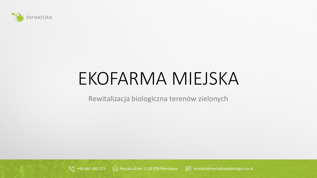 EKOFARMA MIEJSKA Rewitalizacja biologiczna terenów zielonych Rewitalizacja Biologiczna Terenów Zieleni Miejskiej Biologizacji i rewitalizacji biologicznej można poddać gospodarstwa rolne, zbiorniki wodne, parki, a nawet całe miasta – warto to zrobić zwłaszcza na terenach biologicznie zdegradowanych - pofabrycznych, w opuszczonych, niszczejących budynkach i parkach, w których zbierają się ludzie z tzw. marginesu społecznego. Te miejsca nie tylko mogą się zmienić w oazy zieleni, mogą się stać „polami uprawnymi”, na których będzie hodowana metodami ekologicznymi naturalna i organiczna żywność. Eko Farmy Miejskie Farmy miejskie to nowy sposób spojrzenia na uprawę roślin użytkowych w przestrzeni miejskiej. Tematyka nie jest nowa, od dawna w ogródkach działkowych, które często są położone w centrach miast, ludzie uprawiają warzywa i sadzą drzewa owocowe. Znalezienie nowych obszarów, na których można produkować żywność staje się palącą potrzebą, bo populacja ludzka rośnie, do 2050r. na Ziemi przybędzie 3 mld ludzi, z czego 80% będzie mieszkać w miastach. Miejskie Rolnictwo • Rolnictwo miejskie to uprawa użytkowych roślin ogrodowych w doniczkach w mieszkaniach, na tarasach i balkonach, w przydomowych ogródkach po specjalnie wydzielone obszary. Przyszłość to farmy wertykalne i zielone dachy. Farmy wertykalne to wysokie piętrowe plantacje warzyw i owoców. Projekty takich farm są już realizowane w Szwecji i Dubaju. • Farmy miejskie to nie tylko źródło zdrowej, naturalnej, organicznej i ekologicznej żywności, lecz także poprawa wizerunku miasta, dodatkowe tak potrzebne współcześnie ludziom tereny zielone, w polskich miastach powinno ich powstawać jak najwięcej. EkoFarma Miejska Projekt EkoFarmy Miejskiej zapewni: • Zdrową i ekologiczną, organiczną i naturalną żywność; • Zatrudnienie osób bezrobotnych i wykluczonych zawodowo i społecznie; • Wzmocni relacje sąsiedzkie; • Poprawi wizerunek miasta / dzielnicy przez zagospodarowanie zdewastowanych i opuszczonych budynków i terenów; • Zmniejszy żywnościokilometry, oznaczające niższe koszty; • Budowanie świadomości ekologicznej i żywieniowej; • Dodatkowe dochody dla dzielnicy / miasta; • Zintegruje mieszkańców. Zasady korzystania - ogólnodostępność • Na miejskiej EkoFarmie hodowane będą naturalne i ekologiczne, zdrowe, niezatrute chemią warzywa i owoce, które nabywcy będą mogli zrywać prosto z krzaka i drzew w miejscu uprawy, a których cena nie będzie wygórowana. • EkoFarma służyć będzie także jako obiekt integracyjno - edukacyjny dla dzieci i dorosłych, na specjalnie utworzonej łące kwietnej w bezpośrednim kontakcie z naturą odbywać się będą warsztaty i szkolenia poświęcone budowaniu świadomości ekologicznej i żywieniowej. Projekt EkoFarmy Miejskiej Stworzenie Ekofarmy Miejskiej ma na celu rewitalizację biologiczną terenu zdegradowanego biologicznie, stanowiącego nieużytek. Teren ten zostanie uporządkowany, zrewitalizowany poprzez przywrócenie naturalnego ekosystemu ziemi poprzez ściółkowanie, kompostowanie i nawożenie specjalnie przygotowanym kompostem mikroorganicznym, który przywróci glebie mikroorganizmy, które zwiększą grubość powierzchni organicznej gleby i pozwolą na normalne użytkowanie rolnicze pod uprawę warzyw i owoców. EkoFarma ma być naturalnym ogrodem mikroorganicznym permakulturowym produkującym warzywa i owoce dla mieszkańców dzielnicy. Projekt EkoFarmy Miejskiej • Udziałowcem projektu będzie Urząd Miasta / Dzielnicy zarządzający danym terenem. Koordynatorem projektu nadzorującym realizacje i funkcjonowanie i działanie autorka projektu Ewa Milewska. • Projekt zakłada przeszkolenie i zatrudnienie do pracy na farmie bezrobotnych oraz osób wykluczonych zawodowo - tym samym przyczyni się do zmniejszenia bezrobocia oraz aktywnie zintegruje mieszkańców. • Projekt pozwoli na uzyskanie dochodów zarówno bezrobotnym jak i miastu. Każda dzielnica i miasto realizując ten projekt zyska autorytet Ekologicznej Dzielnicy / Miasta. • Eko Farma ma na celu uprawę, dystrybucję i sprzedaż owoców i warzyw. • Warzywa i owoce z EkoFarmy to organiczne, zawsze świeże, zerwane prosto z krzaka z grządki dostępne w przystępnej cenie. Wartości dodane EkoFarma Miejska buduje: • Świadomość ekologiczną; • Poczucie wspólnoty i współodpowiedzialności mieszkańców; • Szacunek do żywności, zieleni, otoczenia, miejsca, w którym żyjemy; • Tworzy ekologiczną przestrzeń zieleni miejskiej; • Daje wytchnienie, spokój i relaks mieszkańcom poprzez kontakt z naturą i z kojącą zielenią; • Daje pracę i nadzieję na lepsze jutro wielu potrzebującym mieszkańcom miast i ich rodzinom. • Aktywizuje bezrobotnych i wykluczonych zawodowo. • Generuje możliwości rozwoju. Edukacja Projekt EkoFarma Miejska to również szkolenia w zakresie: • Zakładania farm miejskich i zielonych dachów. • Zielonego budownictwa w przestrzeni miejskiej. • Agrokultury w mieście i architekturze. • Ekologicznych wyzwań współczesnego miasta. • Wizji ekomiast. • Wykorzystywania zielonych dachów i farm miejskich w budownictwie. • Ogrody żywieniowe. • Ogrody Funkcjonalne • Ogrody Wertykalne • Eko Żywność • Rewitalizacja biologiczna miast , parków i terenów zieleni miejskiej oraz nieużytków i terenów zdegradowanych . • Rewitalizacja i biologizacja miejskich wysypisk śmieci, kanalizacji oraz oczyszczalni ścieków. • Budowanie Świadomości Ekologicznej Koszty Eksploatacji Projektu Koszty eksploatacji + koszty zatrudnienia pokrywane będą z zysków EkoFarmy Miejskiej. W trzecim roku przyniosą zwrot nakładów w czwartym zaś zyski ze sprzedaży, które pozwolą na rozbudowę oraz tworzenie kolejnych EkoFarm Miejskich. Ewa Milewska tel: +48 660 480 275 e-mail: [email protected]