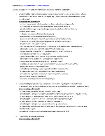 dla kierunku INFORMATYKA i EKONOMETRIA Analiza zakresu obowiązków w kontekście realizacji efektów kształcenia • Umiejętność wyróżniania oraz obserwowania zjawisk i procesów w organizacji a także dokonywania ich opisu, analizy i interpretacji z zastosowaniem podstawowych pojęć teoretycznych. proponowane odpowiedzi: - wykonywanie zadań administratora systemów teleinformatycznych; - opracowywanie instrukcji pracy systemów teleinformatycznych; - udzielanie bieżącego bezpośredniego wsparcia użytkownikom systemów teleinformatycznych; - realizacja procedur ochrony antywirusowej; - modernizacja systemów teleinformatycznych; - planowanie i wdrażanie nowych systemów teleinformatycznych; - systematyczna kontrola działania systemów teleinformatycznych; - projektowanie oprogramowania; - tworzenie wewnętrznej architektury sieciowej przedsiębiorstwa polegającej na...; - administrowanie serwerami Microsoft Windows i Linux; - serwisowanie komputerów PC, notebooków i urządzeń mobilnych; - serwisowanie systemów operacyjnych; - zarządzanie drukarkami i innymi urządzeniami peryferyjnymi; - administrowanie routerami i urządzeniami sieciowymi; - zarządzanie sieciami komputerowymi i telefonicznymi; - zarzadzanie systemami bezpieczeństwa (antywirusowe, szyfrowanie, IPS); - wdrażanie procedur bezpieczeństwa; - stały zdalny monitoring kluczowych elementów systemów IT; - prowadzenie czynności związanych z archiwizacją danych; - prowadzenie czynności związanych z ochroną antywirusową; - wsparcie użytkownika (helpdesk); - usuwanie awarii systemów informatycznych. • Umiejętność posługiwania się przepisami prawa oraz regulacjami wewnętrznymi przedsiębiorstwa w celu uzasadniania konkretnych działań biznesowych i menedżerskich. proponowane odpowiedzi: - prowadzenie ewidencji sprzętu teleinformatycznego; - przestrzeganie przepisów w sprawach ochrony prawnej programów komputerowych; - przestrzeganie przepisów w sprawach ochrony prawnej baz danych; - przestrzeganie ustawy o prawie autorskim i prawach pokrewnych; - przestrzeganie ustawy o ochronie danych osobowych; - przestrzeganie przepisów o ochronie informacji niejawnych; - prowadzenie oraz aktualizacja obowiązującej dokumentacji administratora systemów teleinformatycznych; -stosowanie się i przestrzeganie obowiązujących przepisów BHP. • Umiejętność komunikowania się. proponowane odpowiedzi: - prowadzenie szkoleń użytkowników systemów teleinformatycznych z zakresu ich eksploracji; - omawianie strategii…; - obsługa klienta polegająca na… ( np. prowadzeniu rozmów telefonicznych, sporządzaniu wiadomości elektronicznych, bezpośrednim kontakcie z klientem); -omawianie z klientem parametrów oraz wyglądu strony internetowej. • Umiejętność współdziałania i pracy w grupie. proponowane odpowiedzi: -współdziałanie z administratorami w zakresie utrzymania sprawności systemów…; -aktywne współtworzenie projektów graficznych stron internetowych; -współtworzenie w zespole prezentacji multimedialnych; -aktywne współdziałanie przy opracowywaniu obszaru…; -współtworzenie i realizacja strategii dotyczących…; -koordynacja prac zespołu do spraw…; -budowanie trwałych relacji z klientami; -współrealizowanie zadań w ramach grupy do spraw…; -negocjacje z klientami podczas zawierania ofert dotyczących…; -asystowanie i pomoc w tworzeniu oferty dotyczącej… .