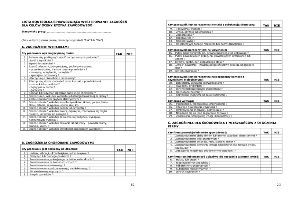LISTA KONTROLNA SPRAWDZAJĄCA WYSTĘPOWANIE ZAGROŻEŃ DLA CELÓW OCENY RYZYKA ZAWODOWEGO Czy pracownik jest narażony na kontakt z substancją chemiczną: Stanowisko pracy: …………………………………………………………………. (Przy każdym pytaniu proszę zaznaczyć odpowiedź ”Tak” lub ”Nie”) A. ZAGROŻENIE WYPADKAMI Czy pracownik wykonując pracę może: 1. 2. 3. 4. 5. 6. 7. 8. 9. 10. 11. 12. 13. 14. 15. Potknąć się, poślizgnąć i upaść na tym samym poziomie ? Upaść z wysokości ? Wpaść do zagłębień ? Zostać uderzony, przygnieciony, pochwycony przez: - przemieszczane, transportowane przedmioty ? - maszyny, urządzenia, narzędzia ? - spadające przedmioty ? Uderzyć się o nieruchome przedmioty? Zderzyć się, dozna ć obrażeń przez kontakt z przedmiotami: - ostrymi lub szorstkimi ? - będącymi w ruchu ? - gorącymi ? Połknąć lub wdychać szkodliwe substancje chemiczne ? Doznać urazu wskutek kontaktu substancji chemicznej ze skórą ? Zosta ć porażonym prądem elektrycznym ? Doznać obrażeń wskutek innych czynników: zimna, gorąca, braku tlenu, zalania, zasypania, opadu skał, itp. Doznać obrażeń wskutek pożaru lub wybuchu ? Doznać obrażeń wskutek awarii, pęknięcia, rozerwania się części maszyn, urządzeń lub narzędzi ? Doznać obrażeń wskutek zawalenia się budynku, wykopów, podziemnych wyrobisk ? Doznać obrażeń wskutek działania sił przyrody - powodzi, burzy, pioruna, wiatru ? Doznać obrażeń wskutek innych niebezpiecznych wydarzeń ? TAK NIE 1. 2. 3. 4. 5. 6. 7. 8. Hałasu, wibracji, ultradźwięków, infradźwięków ? Gorącego lub zimnego powietrza ? Promieniowania jonizującego ze źródeł naturalnych ? Promieniowania ze źródeł sztucznych ? Promieniowania laserowego ? Promieniowania podczerwonego, nadfioletowego ? Pól elektromagnetycznych ? Innych czynników ? NIE Czy pracownik narażony jest na wdychanie: TAK NIE Czy pracownik jest narażony na niebezpieczny kontakt z czynnikami biologicznymi: TAK NIE Czy praca wymaga: TAK NIE Toksyczną (trującą) ? Żrącą, gryzącą lub drażniącą ? Zamarzającą ? Rakotwórczą ? Radioaktywną ? Upośledzającą funkcje rozrodcze lub cechy dziedziczne ? 15. Pyłów rakotwórczych, np. drewna bukowego lub dębowego ? 16. Pyłów powodujących pylicę, np. zawierających krzemionkę lub azbest ? 17. Dymów, spalin, par, rozpylonego oleju ? 18. „Złego” powietrza - zawierającego szkodliwe dodatki, ubogiego w tlen ? 19. Innych czynników ? 20. 21. 22. 23. 24. 25. 26. 27. 28. 29. Bakteriami, wirusami, pierwotniakami ? Owadami, gryzoniami ? Innymi niebezpiecznymi zwierzętami ? Odchodami zwierząt ? Grzybami (trującymi lub rakotwórczymi) ? Podnoszenia, przesuwania, przenoszenia ? Częstego powtarzania czynności ? Utrzymywania męczącej, pozycji ciała ? Narażania się na inne zagrożenie zdrowia ? Zachowania szczególnej uwagi i koncentracji ? C. ZAGROŻENIA DLA ŚRODOWISKA I MIESZKAŃCÓW Z OTOCZENIA FIRMY Czy firma powoduje lub może spowodować: TAK NIE Czy firma jest lub może być uciążliwa dla otoczenia wskutek emisji: TAK NIE 1. 2. 3. 4. B. ZAGROŻENIA CHOROBAMI ZAWODOWYMI Czy pracownik jest narażony na działanie: TAK 9. 10. 11. 12. 13. 14. TAK NIE Zanieczyszczenie gleby olejem lub innymi odpadami chemicznymi ? Zanieczyszczenie wód gruntowych ? Zanieczyszczenie potoków, rzek, stawów, jezior ? Zanieczyszczenie powietrza emisją szkodliwych dla zdrowia pyłów, gazów, par ? 5. Zniszczenie krajobrazu składowanymi odpadami ? 6. 7. 8. 9. 10. 1/2 Hałasu lub drgań ? Nieprzyjemnych zapachów ? Pól elektromagnetycznych ? Substancji radioaktywnych ? Innych czynników ? 2/2