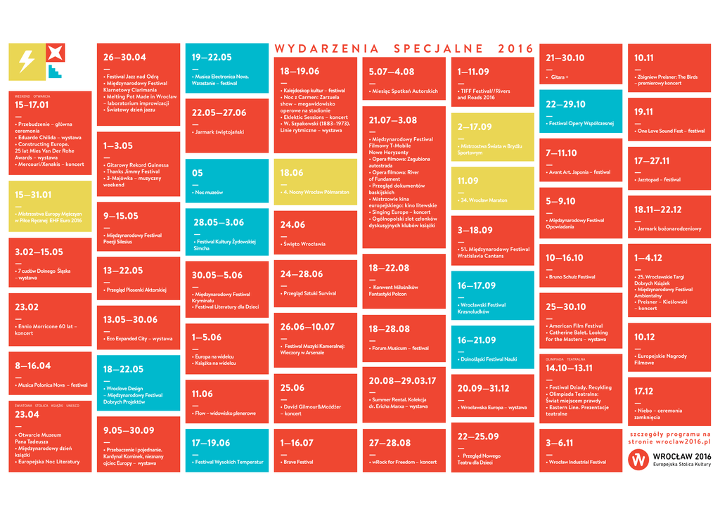 26—30.04 — WEEKEND OTWARCIA 15–17.01 — • Przebudzenie – główna ceremonia • Eduardo Chilida – wystawa • Constructing Europe. 25 lat Mies Van Der Rohe Awards – wystawa • Mercouri/Xenakis – koncert 15—31.01 — • Mistrzostwa Europy Mężczyzn w Piłce Ręcznej EHF Euro 2016 3.02—15.05 — • 7 cudów Dolnego Śląska – wystawa • Festiwal Jazz nad Odrą • Międzynarodowy Festiwal Klarnetowy Clarimania • Melting Pot Made in Wrocław – laboratorium improwizacji • Światowy dzień jazzu • Ennio Morricone 60 lat – koncert 8—16.04 — • Musica Polonica Nova – festiwal ŚWIATOWA STOLICA KSIĄŻKI UNESCO 23.04 — • Otwarcie Muzeum Pana Tadeusza • Międzynarodowy dzień książki • Europejska Noc Literatury • Musica Electronica Nova. Wzrastanie – festiwal 22.05—27.06 — • Jarmark świętojański 18—19.06 — • Kalejdoskop kultur – festiwal • Noc z Carmen: Zarzuela show – megawidowisko operowe na stadionie • Eklektic Sessions – koncert • W. Szpakowski (1883–1973). Linie rytmiczne – wystawa 1—3.05 — • Gitarowy Rekord Guinessa • Thanks Jimmy Festival • 3-Majówka – muzyczny weekend 9—15.05 — • Międzynarodowy Festiwal Poezji Silesius 13—22.05 — • Przegląd Piosenki Aktorskiej 23.02 — 19—22.05 — WYDARZENIA 13.05—30.06 — • Eco Expanded City – wystawa 05 — • Noc muzeów 28.05—3.06 — • Festiwal Kultury Żydowskiej Simcha 30.05—5.06 — • Międzynarodowy Festiwal Kryminału • Festiwal Literatury dla Dzieci 1—5.06 — • Europa na widelcu 18—22.05 — • Wroclove Design – Międzynarodowy Festiwal Dobrych Projektów • Przebaczenie i pojednanie. Kardynał Kominek, nieznany ojciec Europy – wystawa • 4. Nocny Wrocław Półmaraton 24.06 — 5.07—4.08 — • Miesiąc Spotkań Autorskich 21.07—3.08 — • Międzynarodowy Festiwal Filmowy T-Mobile Nowe Horyzonty • Opera filmowa: Zagubiona autostrada • Opera filmowa: River of Fundament • Przegląd dokumentów baskijskich • Mistrzowie kina europejskiego: kino litewskie • Singing Europe – koncert • Ogólnopolski zlot członków dyskusyjnych klubów książki • Święto Wrocławia 24—28.06 — • Przegląd Sztuki Survival 11.06 — 17—19.06 — • Festiwal Wysokich Temperatur 2016 1—11.09 — • TIFF Festival//Rivers and Roads 2016 2—17.09 — • Mistrzostwa Świata w Brydżu Sportowym 11.09 — • 34. Wrocław Maraton 3—18.09 — • 51. Międzynarodowy Festiwal Wratislavia Cantans 18—22.08 — • Konwent Miłośników Fantastyki Polcon 16—17.09 — • Wrocławski Festiwal Krasnoludków 26.06—10.07 — • Festiwal Muzyki Kameralnej: Wieczory w Arsenale 18—28.08 — • Forum Musicum – festiwal 25.06 — • David Gilmour&Możdżer – koncert 1—16.07 — • Brave Festival 16—21.09 — • Dolnośląski Festiwal Nauki • Książka na widelcu • Flow – widowisko plenerowe 9.05—30.09 — 18.06 — SPECJALNE 20.08—29.03.17 — • Summer Rental. Kolekcja dr. Ericha Marxa – wystawa 27—28.08 — • wRock for Freedom – koncert 20.09—31.12 — • Wrocławska Europa – wystawa 22—25.09 — • Przegląd Nowego Teatru dla Dzieci 21—30.10 — • Gitara + 22—29.10 — • Festiwal Opery Współczesnej 10.11 — • Zbigniew Preisner: The Birds – premierowy koncert 19.11 — • One Love Sound Fest – festiwal 7—11.10 — • Avant Art. Japonia – festiwal 17—27.11 — • Jazztopad – festiwal 5—9.10 — • Międzynarodowy Festiwal Opowiadania 10—16.10 — • Bruno Schulz Festiwal 25—30.10 — • American Film Festival • Catherine Balet. Looking for the Masters – wystawa OLIMPIADA TEATRALNA 14.10—13.11 — • Festiwal Dziady. Recykling • Olimpiada Teatralna: Świat miejscem prawdy • Eastern Line. Prezentacje teatralne 3—6.11 — • Wrocław Industrial Festival 18.11—22.12 — • Jarmark bożonarodzeniowy 1—4.12 — • 25. Wrocławskie Targi Dobrych Książek • Międzynarodowy Festiwal Ambientalny • Preisner – Kieślowski – koncert 10.12 — • Europejskie Nagrody Filmowe 17.12 — • Niebo – ceremonia zamknięcia szczegóły programu na stronie wroclaw2016.pl