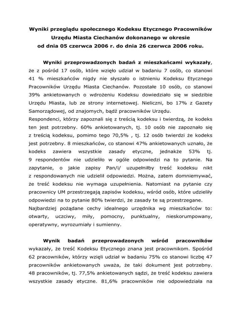 Wyniki przeglądu społecznego Kodeksu Etycznego Pracowników Urzędu Miasta Ciechanów dokonanego w okresie od dnia 05 czerwca 2006 r. do dnia 26 czerwca 2006 roku. Wyniki przeprowadzonych badań z mieszkańcami wykazały, że z pośród 17 osób, które wzięło udział w badaniu 7 osób, co stanowi 41 % mieszkańców nigdy nie słyszało o istnieniu Kodeksu Etycznego Pracowników Urzędu Miasta Ciechanów. Pozostałe 10 osób, co stanowi 39% ankietowanych o wdrożeniu Kodeksu dowiedziało się w siedzibie Urzędu Miasta, lub ze strony internetowej. Nieliczni, bo 17% z Gazety Samorządowej, od znajomych, bądź pracowników Urzędu. Respondenci, którzy zapoznali się z treścią kodeksu i twierdzą, że kodeks ten jest potrzebny. 60% ankietowanych, tj. 10 osób nie zapoznało się z treścią kodeksu, pomimo tego 70,5% , tj. 12 osób twierdzi że kodeks jest potrzebny. 8 mieszkańców, co stanowi 47% ankietowanych uznało, że kodeks zawiera wszystkie zasady etyczne, jednakże 53% tj. 9 respondentów nie udzieliło w ogóle odpowiedzi na to pytanie. Na zapytanie, o jakie zapisy Pan/i/ uzupełniłby treść kodeksu nikt z respondowanych nie udzielił odpowiedzi. Można, zatem domniemywać, że treść kodeksu nie wymaga uzupełnienia. Natomiast na pytanie czy pracownicy UM przestrzegają zapisów kodeksu, wśród osób, które udzieliły odpowiedzi na to pytanie 80% twierdzi, że zasady te są przestrzegane. Najbardziej pożądane cechy idealnego urzędnika wg mieszkańców to: otwarty, uczciwy, miły, pomocny, punktualny, nieskorumpowany, operatywny, wyrozumiały i sumienny. Wynik badań przeprowadzonych wśród pracowników wykazały, że treść Kodeksu Etycznego znana jest pracownikom. Spośród 62 pracowników, którzy wzięli udział w badaniu 75% co stanowi liczbę 47 pracowników ankietowanych uważa, że taki dokument jest potrzebny. 48 pracowników, tj. 77,5% ankietowanych sądzi, że treść kodeksu zawiera wszystkie zasady etyczne. 81,6% pracowników nie odpowiedziała na pytanie, o jakie zapisy uzupełniliby treść kodeksu. Na tej podstawie można sądzić, że treść kodeksu ich zdaniem nie wymaga uzupełnienia. Spośród 12% w pracowników, kodeksie którzy powinien wypełnili znaleźć się ten punkt zapis 6% stwierdziło, odnośnie że wzajemnego poszanowania pracowników. Większość, bo 50 respondowanych, co stanowi 80% nie wypełniło również ostatniego punktu ankiety dotyczącego niezrozumiałych zapisów zawartych w kodeksie. Zatem sądzić można, że Kodeks Etyczny jest zrozumiały dla pracowników.