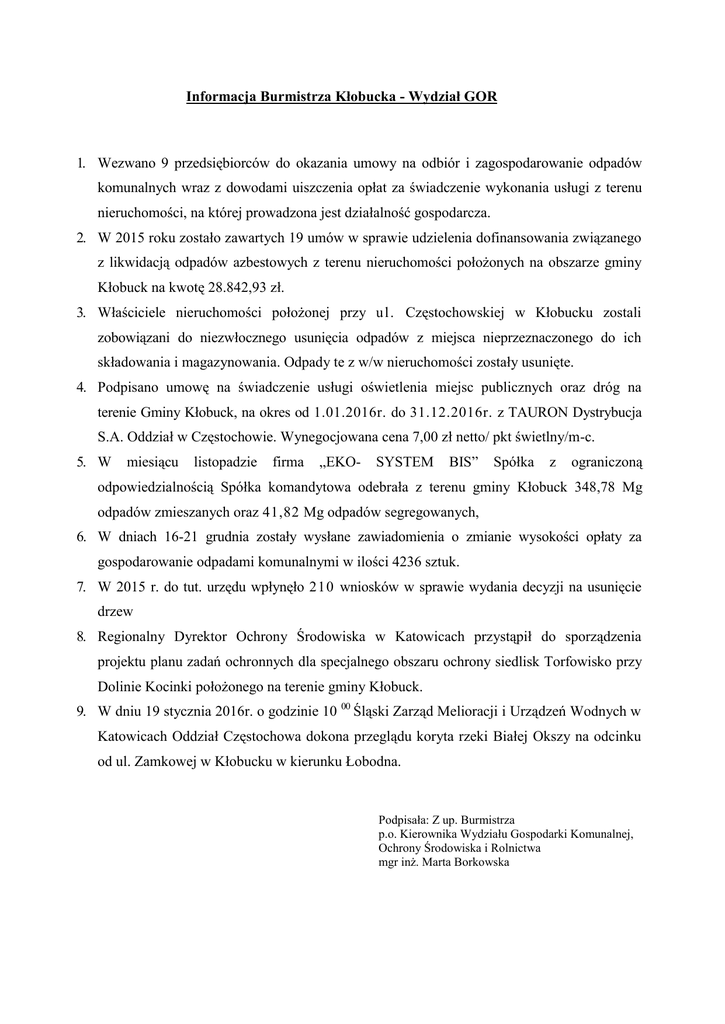 Informacja Burmistrza Kłobucka - Wydział GOR 1. Wezwano 9 przedsiębiorców do okazania umowy na odbiór i zagospodarowanie odpadów komunalnych wraz z dowodami uiszczenia opłat za świadczenie wykonania usługi z terenu nieruchomości, na której prowadzona jest działalność gospodarcza. 2. W 2015 roku zostało zawartych 19 umów w sprawie udzielenia dofinansowania związanego z likwidacją odpadów azbestowych z terenu nieruchomości położonych na obszarze gminy Kłobuck na kwotę 28.842,93 zł. 3. Właściciele nieruchomości położonej przy ul . Częstochowskiej w Kłobucku zostali zobowiązani do niezwłocznego usunięcia odpadów z miejsca nieprzeznaczonego do ich składowania i magazynowania. Odpady te z w/w nieruchomości zostały usunięte. 4. Podpisano umowę na świadczenie usługi oświetlenia miejsc publicznych oraz dróg na terenie Gminy Kłobuck, na okres od 1.01.2016r. do 31.12.2016r. z TAURON Dystrybucja S.A. Oddział w Częstochowie. Wynegocjowana cena 7,00 zł netto/ pkt świetlny/m-c. 5. W miesiącu listopadzie firma „EKO- SYSTEM BIS” Spółka z ograniczoną odpowiedzialnością Spółka komandytowa odebrała z terenu gminy Kłobuck 348,78 Mg odpadów zmieszanych oraz 41,82 Mg odpadów segregowanych, 6. W dniach 16-21 grudnia zostały wysłane zawiadomienia o zmianie wysokości opłaty za gospodarowanie odpadami komunalnymi w ilości 4236 sztuk. 7. W 2015 r. do tut. urzędu wpłynęło 210 wniosków w sprawie wydania decyzji na usunięcie drzew 8. Regionalny Dyrektor Ochrony Środowiska w Katowicach przystąpił do sporządzenia projektu planu zadań ochronnych dla specjalnego obszaru ochrony siedlisk Torfowisko przy Dolinie Kocinki położonego na terenie gminy Kłobuck. 9. W dniu 19 stycznia 2016r. o godzinie 10 00 Śląski Zarząd Melioracji i Urządzeń Wodnych w Katowicach Oddział Częstochowa dokona przeglądu koryta rzeki Białej Okszy na odcinku od ul. Zamkowej w Kłobucku w kierunku Łobodna. Podpisała: Z up. Burmistrza p.o. Kierownika Wydziału Gospodarki Komunalnej, Ochrony Środowiska i Rolnictwa mgr inż. Marta Borkowska WYDZIAŁ GPN Sesja 29 grudzień 2015 I. Sprawy dot. gospodarki nieruchomościami 1. NABYCIE: 1) 16 grudnia umowami notarialnymi, w wykonaniu uchwał Rady Miejskiej w Kłobucku podjętych w br., nabyto do zasobu gminy: - działkę nr 23/1 o pow. 80m2 położoną w Lgocie przeznaczoną ustaleniami obowiązującego planu pod poszerzenie ul Polnej ; - w drodze darowizny działkę nr 758/12 o pow.0,0596ha, położoną w Kamyku; - w wyniku zamiany działkę nr 758/15 o pow. 1,17761 ha - za działki z gminnego zasobu nr 908 i nr 916 ( wszystkie położone w Kamyku); 2) Krajowa Komisja Uwłaszczeniowa rozpatrując odwołanie Przedsiębiorstwa Wodociągów i Kanalizacji Okręgu Częstochowskiego, decyzją Nr KKU-32/13 z 16 listopada br „utrzymała w mocy decyzję Wojewody Śląskiego wydaną 15 stycznia 2013r . , a stwierdzającą nabycie z mocy prawa przez Gminę Kłobuck prawa własności nieruchomości gruntowej o powierzchni 1,0769ha, położonej w obrębie ujęcia wody pitnej w Łobodnie, oznaczonej geodezyjnie nr 1963/1, 1963/2, 1963/3 i 2980/2 i pozostającej w użytkowaniu wieczystym przedsiębiorstwa. 3) w wyniku wieloletnich starań gminy, 15 grudnia otrzymaliśmy od PKP Spółki Akcyjnej projekt protokołu uzgodnień, który określa warunki przekazania praw posiadanych przez PKP SA do nieruchomości położonej w Kłobucku, oznaczonej geodezyjnie nr 669/5 o powierzchni 1. 0084 ha i 451/2 o powierzchni 0.2334ha , stanowiącej część pasa drogowego drogi gminnej ul. Kolejowej. Przekazanie nastąpiłoby nieodpłatnie w oparciu o art. 39 ust.3 ustawy z dnia 8 września 2000r. o komercjalizacji i prywatyzacji przedsiębiorstwa państwowego ,, Polskie Koleje Państwowe", ale pod pewnymi warunkami , tj: -ustanowienia przez gminę nieodpłatnego i nieograniczonym w czasie prawa wstępu na przekazywane nieruchomości w celu eksploatacji i konserwacji urządzeń teletechnicznych stanowiących własność PKP; - nie dochodzenia przez gminę roszczeń z tytułu istnienia w przekazywanym gruncie jakichkolwiek niezidentyfikowanych podziemnych sieci stanowiących odrębny przedmiot własności, a nie podlegających przekazaniu; - nie dochodzenia roszczeń z tytułu kosztów obowiązkowego usunięcia zanieczyszczeń lub skażeń , które wystąpią lub mogą wystąpić na przekazywanej nieruchomości po podpisaniu umowy notarialnej; - zwrotu PKP S.A. kosztów przygotowania nieruchomości do obrotu tj. kosztów operatu szacunkowego, umowy notarialnej oraz dokumentacji geodezyjnej przedkładanej przy sporządzaniu tej umowy; Warunkiem kontynuacji dalszych działań w tym zakresie jest podjęcie stosownej uchwały przez Radę Miejską w Kłobucku, wyrażającej również zgodę na nieodpłatne ustanowienie na rzecz PKP i jej następców prawnych prawa służebności przesyłu w zakresie wymienionych wcześniej urządzeń teletechnicznych. II. Z zakresu gospodarki przestrzennej 1. Plany zagospodarowania przestrzennego: 15 grudnia wpłynęło do urzędu zawiadomienie Wojewody Śląskiego o wszczęciu postępowania nadzorczego dotyczącego uchwały Nr 124/XV/2015 Rady Miejskiej w Kłobucku z 17 listopada 2015r w sprawie miejscowego planu zagospodarowania przestrzennego miejscowości Łobodno. Wojewoda kwestionuje zapisy: - §7 pkt 5 uchwały, który informuje o płożeniu obszaru objętego planem w zasięgu Głównego Zbiornika Wód Podziemnych nr 326 Częstochowa E, dla którego to Obszaru, pomimo jego udokumentowania na dzień uchwalenia planu nie istniały w obrocie prawnym dokumenty go ustanawiające ; - wprowadzenia w granicach całego terenu objętego planem zakazu lokalizacji przydomowych oczyszczalni ścieków, zarzucając że jest on sprzeczny z przepisami ustawy o utrzymaniu czystości i porządku publicznego. Zdaniem wojewody zakaz ten winien dotyczyć wyłącznie terenów leżących w zasięgu strefy ochronnej ujęcia wody podz