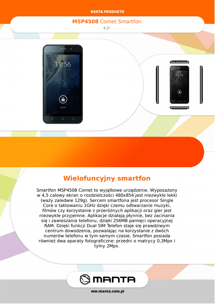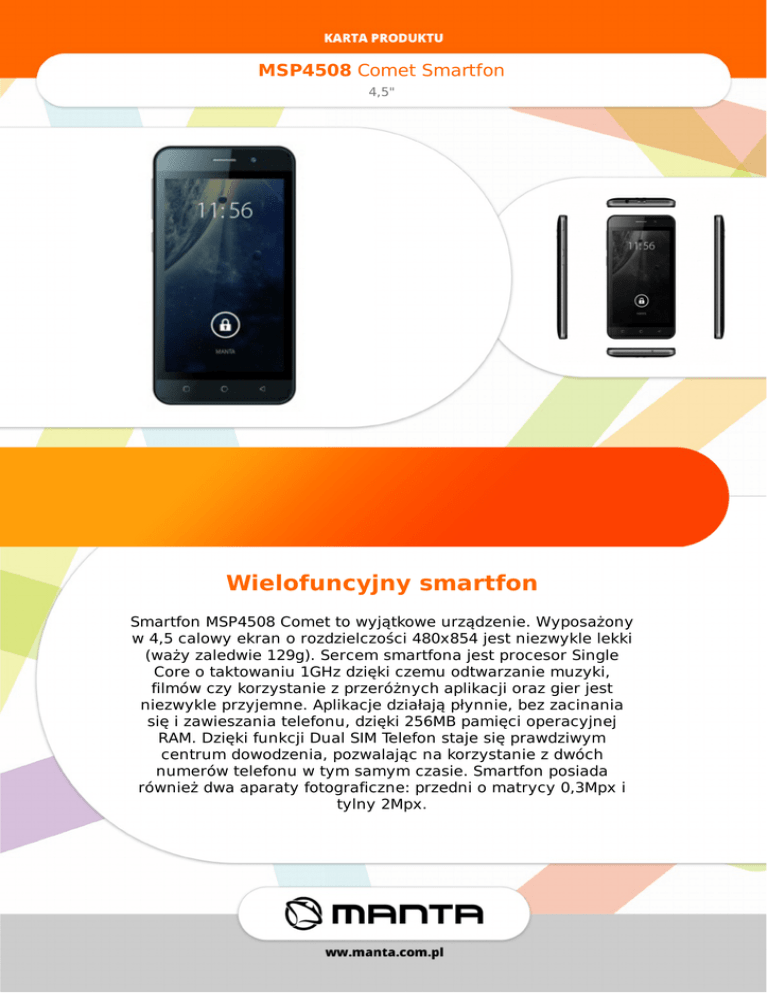 MSP4508CometSmartfon 4,5" Wielofuncyjnysmartfon SmartfonMSP4508Comettowyjątkoweurządzenie.Wyposażony w4,5calowyekranorozdzielczości480x854jestniezwyklelekki (ważyzaledwie129g).SercemsmartfonajestprocesorSingle Coreotaktowaniu1GHzdziękiczemuodtwarzaniemuzyki, filmówczykorzystaniezprzeróżnychaplikacjiorazgierjest niezwykleprzyjemne.Aplikacjedziałająpłynnie,bezzacinania sięizawieszaniatelefonu,dzięki256MBpamięcioperacyjnej RAM.DziękifunkcjiDualSIMTelefonstajesięprawdziwym centrumdowodzenia,pozwalającnakorzystaniezdwóch numerówtelefonuwtymsamymczasie.Smartfonposiada równieżdwaaparatyfotograficzne:przedniomatrycy0,3Mpxi tylny2Mpx. MSP4508CometSmartfon 4,5" Specyfikacja Bluetooth DziękizastosowaniutechnologiiBluetooth SmartfonMantaMSP4508Cometbezproblemu połączysiębezprzewodowonietylkozinnymi smartfonamialetakżezewszystkimiurządzeniami obsługującymitętechnologię,wtymzgłośnikami Manta.Dziękitemu,jedensmartfonmożestaćsię uniwersalnympilotemdlacałegodomu! Specyfikacja Smartfonwyposażonyjestwwytrzymałabaterięo pojemności1200mAh.MantaMSP4508Comet posiadarównieżaż256MBpamięciflashoraz możliwośćinstalacjikartypamięciMicroSD, umożliwiającejrozszerzeniepamięciażo32GB, dziękiczemunaurządzeniupomieszcząsię wszystkieaplikacje.Wartozwrócićteżuwagęna nowoczesnydesigntegourządzenia,który sprawia,żesmartfonbędziedoskonałym pomysłemnaprezentzarównodlamłodszychjaki starszychużytkowników. Przekątnaekranu 4,5” Rozdzielczość 480x854px Waga 129g Systemoperacyjny Android2.3 Typekranu TN Procesor SingleCore Taktowanieprocesora 1GHz RAM 256MB FLASH 512MB Wi-Fi IEEE802.11B/G Dual-SIM Tak Bluetooth Tak GPS NIE Aparat 0.3MPix(front)/2MPix(back) Gniazdokartpamięci MicroSD GniazdoUSB MicroUSB Złącza microUSB,słuchawki Pojemnośćakumulatora 1300mAh ObsługiwanepasmaGSM 900/1800MHz ObsługiwanepasmaWCDMA BRAK(obsługatylko2G) http://www.manta.com.pl/pl/msp4508 EAN:5902510600129