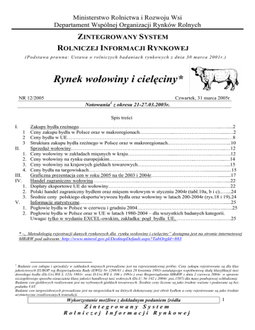 Ministerstwo Rolnictwa i Rozwoju Wsi Departament Wspólnej Organizacji Rynków Rolnych ZINTEGROWANY SYSTEM ROLNICZEJ INFORMACJI RYNKOWEJ (Podstawa prawna: Ustawa o rolniczych badaniach rynkowych z dnia 30 marca 2001r.) Rynek wołowiny i cielęciny* NR 12/2005 Czwartek, 31 marca 2005r 1 Notowania z okresu 21-27.03.2005r. Spis treści I. 1 2 3 II. 1. 2. 3. 4. III. IV. 1. 2. 3. V. 1. 2. Zakupy bydła rzeźnego………………………………………………………………………...….....2 Ceny zakupu bydła w Polsce oraz w makroregionach………………...………………………......…2 Ceny bydła w UE…………………………………………………………………….....................…8 Struktura zakupu bydła rzeźnego w Polsce oraz w makroregionach.………………………….…...10 Sprzedaż wołowiny………………………………………………………………….…………...…12 Ceny wołowiny w zakładach mięsnych w kraju…………………….......………………..…..…….12 Ceny wołowiny na rynku europejskim…………………………………………...……………...…14 Ceny wołowiny na krajowych giełdach towarowych……………………………………………....15 Ceny bydła na targowiskach……………………………………………………….…......................15 Graficzna prezentacja cen w roku 2005 na tle 2003 i 2004r…………………………………..........17 Handel zagraniczny wołowiną ……………………...………………………………………...…....22 Dopłaty eksportowe UE do wołowiny………………….…………………………......................…22 Polski handel zagraniczny bydłem oraz mięsem wołowym w styczniu 2004r (tabl.10a, b i c)..…...24 Średnie ceny polskiego eksportu/wywozu bydła oraz wołowiny w latach 200-2004r (rys.18 i 19).24 Informacje statystyczne…………………………………………………………………………......25 Pogłowie bydła w Polsce w czerwcu i grudniu 2004………………………………………..…...….25 Pogłowie bydła w Polsce oraz w UE w latach 1980-2004 – dla wszystkich badanych kategorii. Uwaga: tylko w wydaniu EXCEL-owskim, zakładka: pogł_bydła_UE, ……………………..……25 * -„ Metodologią rejestracji danych rynkowych dla rynku wołowiny i cielęciny” dostępna jest na stronie internetowej MRiRW pod adresem: http://www.minrol.gov.pl/DesktopDefault.aspx?TabOrgId=883 1 Badanie cen zakupu i sprzedaży w zakładach mięsnych prowadzone jest na reprezentatywnej próbie. Ceny zakupu rejestrowane są dla klas jakościowych EUROP wg Rozporządzenia Rady (EWG) Nr 1208/81 z dnia 28 kwietnia 1981r.ustalającego wspólnotową skalę klasyfikacji tusz dorosłego bydła (Dz.Urz.WE L 123z 1981r. oraz D.Urz.WE L 106 z 1991r.) oraz Rozporządzenia MRiRW z dnia 2 czerwca 2004r. w sprawie szczegółowego sposobu oznaczania klasy jakości handlowej tusz wołowych (Dz.U. Nr 142 z 2004r. poz.1507) dla masy poubojowej schłodzonej. Badanie cen giełdowych realizowane jest na wybranych giełdach towarowych. Średnie ceny liczone są jako średnie ważone i podawane są bez podatku VAT. Badanie cen targowiskowych prowadzone jest na targowiskach na których dokonywany jest obrót bydłem a ceny rejestrowane są jako średnie arytmetyczne zrealizowanych transakcji. Wykorzystanie możliwe z dokładnym podaniem źródła Zintegrowany System Rolniczej Informacji Rynkowej 1 Departament Wspólnej Organizacji Rynków Rolnych I. 1.1 Zakupy bydła rzeźnego w ubojniach Ceny zakupu bydła rzeźnego w Polsce. Tablica 1. Zbiorcze zestawienie danych dotyczących zakupionego bydła rzeźnego w ubojniach w kraju Średnia tuszy Cena zakupu (bez VAT)* masa schłodzonej Struktura Zmiana tyg. wg w.ż. dla mpc** dla mps** [kg] [%] poziomu [zł/kg] [zł/tonę] [zł/tonę] Zmiana Zmiana tyg. zakupu tyg. [%] [%] [w %] 2005-03-27 2005-03-27 2005-03-27 2005-03-27 2005-03-27 Kategoria bydła Bydło ogółem Buhajki U+R+O Buhaje R Wolce U+R+O Krowy R+O+P Jałówki U+R+O 4,22 4,73 4,47 4,46 3,58 4,10 8 187 8 845 8 724 8 250 7 456 7 757 8 350 9 022 8 898 8 415 7 605 7 912 0,15 0,11 -0,91 284,5 305,2 353,4 310,0 270,9 255,0 -0,49 1,08 -0,9 -0,9 0,4 -12,4 -10,9 -20,3 -0,7 -1,8 -13,6 -13,4 zakupu Zmiana tyg. [w pkt.%] 100,0 45,4 0,7 0,0 37,9 16,0 0,8 -0,1 0,0 -0,5 -0,2 * - jest to cena netto zapłacona dostawcom bydła za dostarczony do rzeźni pełnowartościowy żywiec wołowy na bazie franco zakład czyli wraz z kosztami transportu dostawcy jak i rzeźni jeśli poniosła ona koszty transportu związane z zakupem żywca. Cena ta zawiera również wszelkie dodatkowe płatności (premie, nagrody itp.) niezależnie od okresu w jakim zostały wypłacone. ** - mpc - masa poubojowa ciepła, mps - masa poubojowa schłodzona ***- z uwagi na ustawowy obowiązek nieidentyfikalności danych, ceny nie podano. Rys. 1. Średnie krajowe ceny zakupu bydła rzeźnego wg kategorii bydła dla masy poubojowej schłodzonej (mps) z ł/1 0 0 k g ro k m p s 2 0 0 5 9 4 0 9 0 0 8 8 4 8 9 1 ,3 8 6 0 8 9 7 ,5 8 9 7 ,6 8 2 4 ,4 8 1 8 ,2 8 9 7 ,2 8 9 9 ,2 8 2 7 ,7 9 0 1 ,3 9 0 2 ,2 8 3 3 8 3 3 ,8 8 3 5 8 1 4 ,5 8 2 0 7 9 8 ,6 7 9 1 ,2 7 7 1 ,4 7 8 0 7 6 5 ,2 7 2 0 ,1 7 4 0 7 8 0 7 3 5 ,3 7 7 47 ,54 2 , 2 7 7 79 4, 13 , 6 7 8 4 ,6 7 5 3 ,9 7 8 2 ,7 7 6 4 ,3 7 8 3 ,2 7 6 0 ,5 7 0 0 6 6 0 6 .0 2 1 3 .0 2 2 0 .0 2 2 7 .0 2 6 .0 3 b y d ło o g ó łe m k ro w y R + O + P 1 3 .0 3 2 0 .0 3 2 7 .0 3 b u h a jk i U + R + O ja łó w k i U + R + O w przeliczeniu na wagę żywą (w.ż.) z ł/k g w .ż . ro k 2 0 0 5 5 ,0 0 4 ,6 4 4 ,6 7 4 ,0 4 4 ,1 1 4 ,7 0 4 ,7 0 4 ,7 2 4 ,7 3 4 ,7 0 4 ,7 3 4 ,5 0 4 ,0 0 3 ,5 0 3 ,9 8 3 ,4 1 4 ,0 5 3 ,4 7 4 ,1 7 4 ,1 3 4 ,0 4 3 ,5 3 4 ,1 9 4 ,0 2 4 ,0 7 3 ,5 6 3 ,5 7 4 ,2 0 4 ,0 6 4 ,2 2 4 ,0 7 3 ,6 3 3 ,6 0 4 ,2 2 4 ,1 0 3 ,5 8 3 ,0 0 6 .0 2 1 3 .0 2 2 0 .0 2 2 7 .0 2 b y d ło o g ó łe m k ro w
