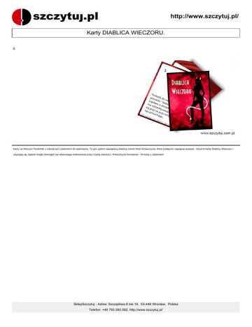 http://www.szczytuj.pl/ Karty DIABLICA WIECZORU. 0 Karty na Wieczór Panieński z odważnymi zadaniami do wykonania. Ta gra ujawni największą diablicę wśród Was! Dziewczyna, która podejmie najwięcej wyzwań, otrzyma kartę Diablicy Wieczoru i używając jej, będzie mogła domagać się właściwego traktowania przez resztę wieczoru. Polecamy!w komplecie - 24 karty z zadaniami SklepSzczytuj - Adres: Szczęśliwa 8 lok.19, 53-446 Wrocław, Polska Telefon: +48 793 393 082, http://www.szczytuj.pl/
